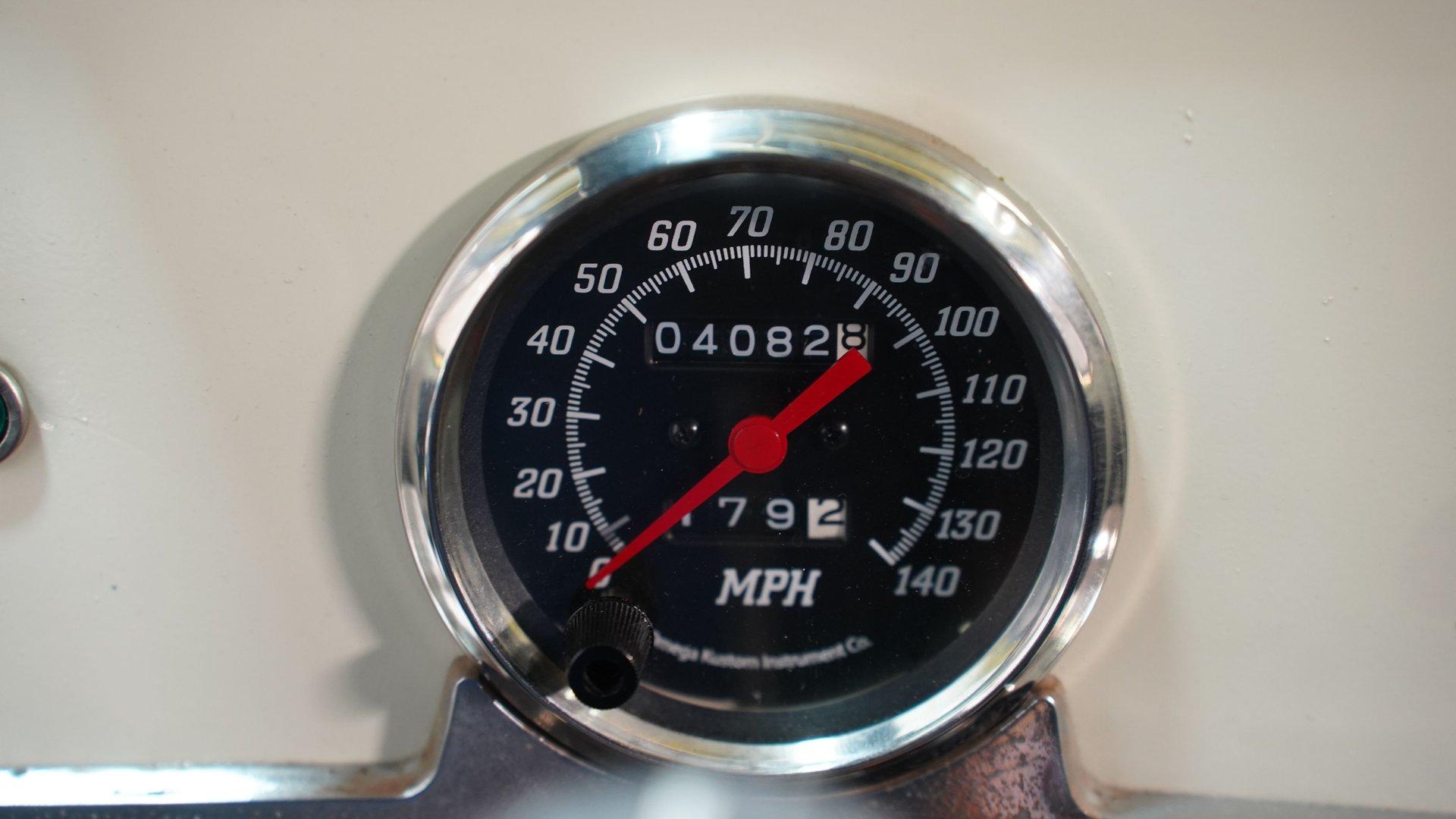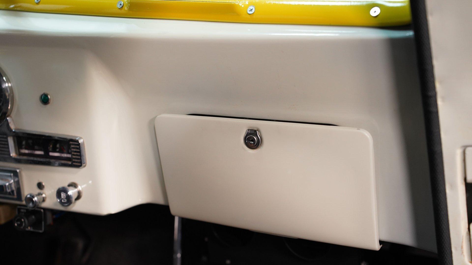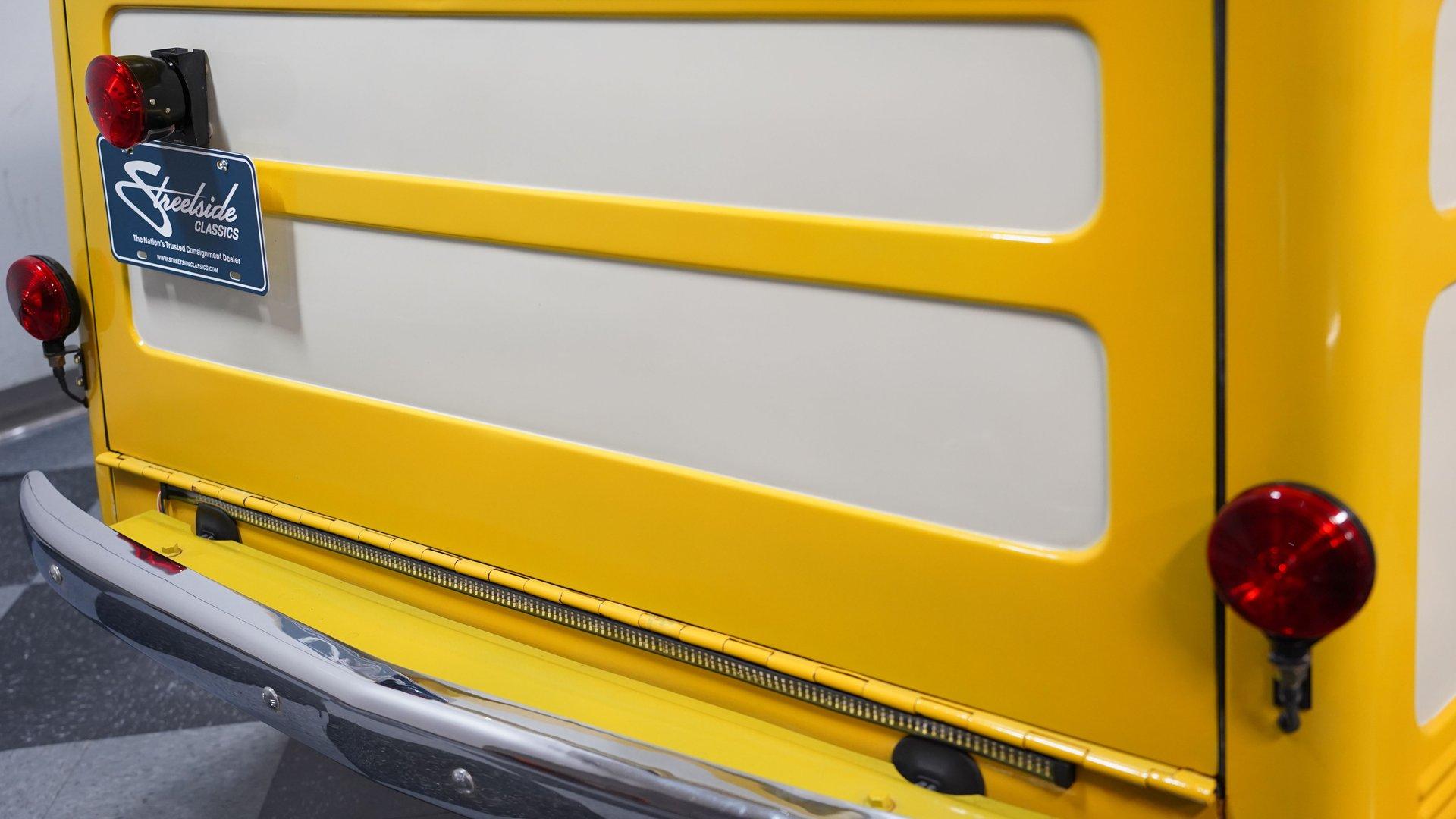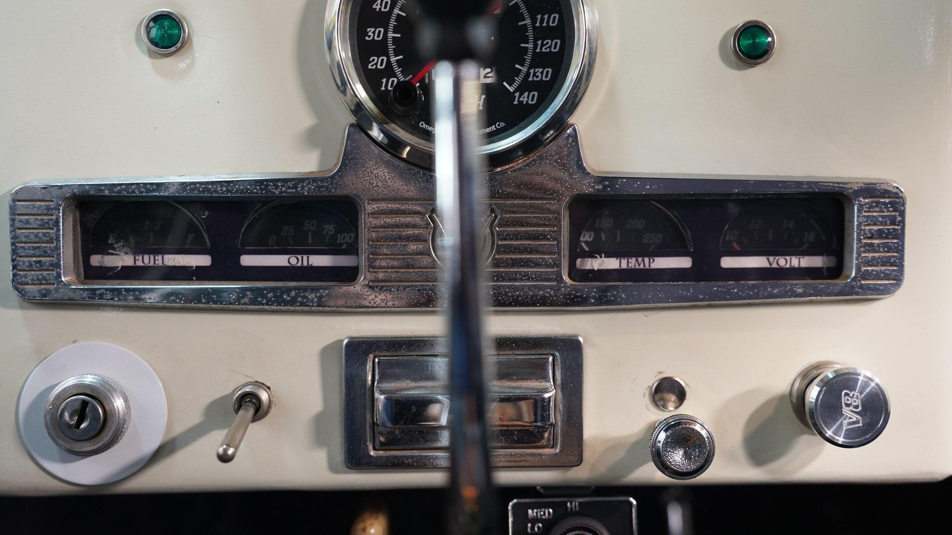 The white and black cabin offers a utilitarian edge with enough upgrades to handle long treks and weekend hauls. Modern bucket seats flank a custom center console, while the polished wood rear flooring brings in a touch of vintage cabin craftsmanship. A tilt steering column with a custom wheel gives the driver a confident grip, and an RPM tach keeps things in check. The AM/FM stereo includes CD, AUX, and USB hookups, ideal for keeping the soundtrack rolling whether you're on pavement or gravel.