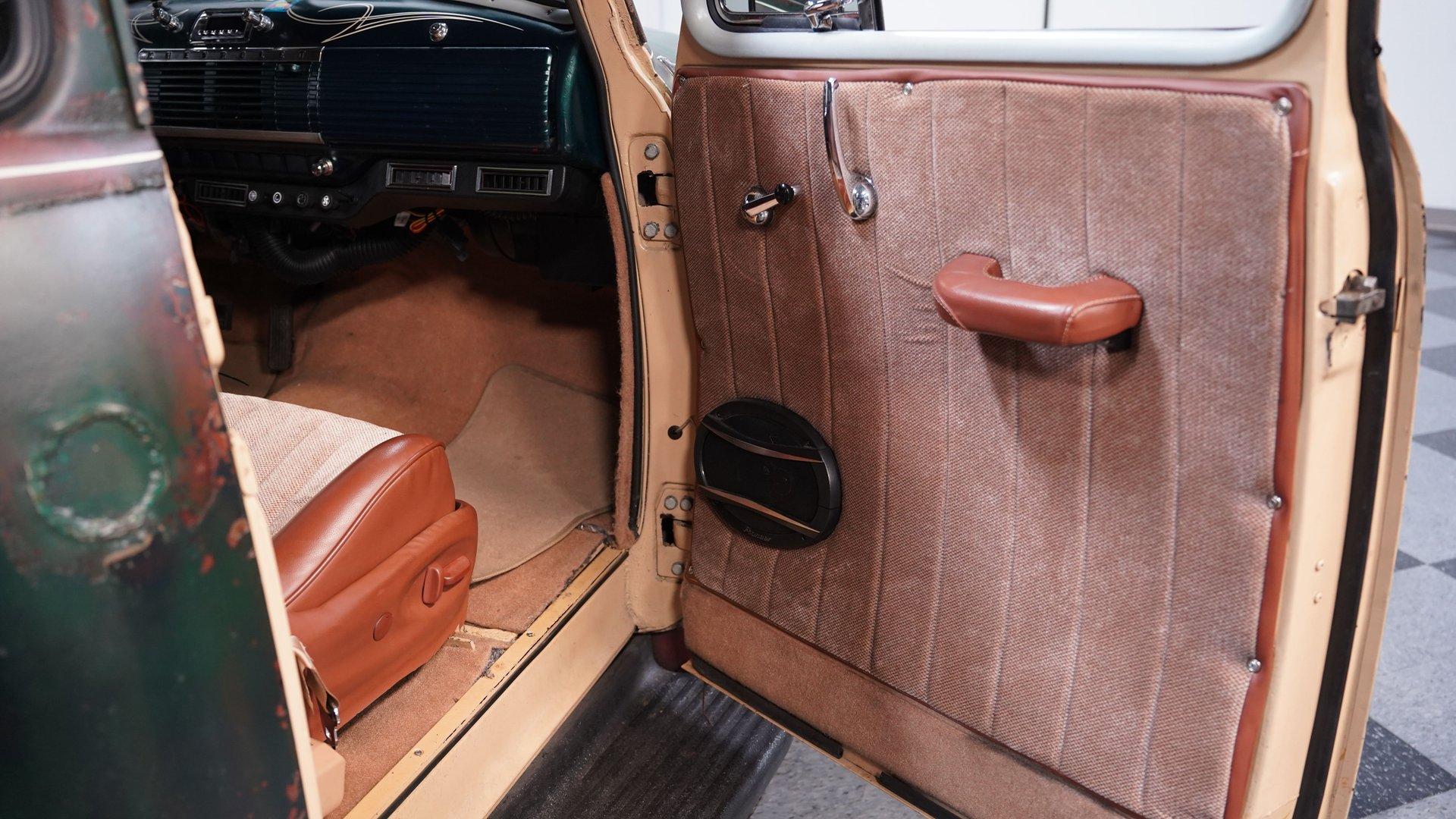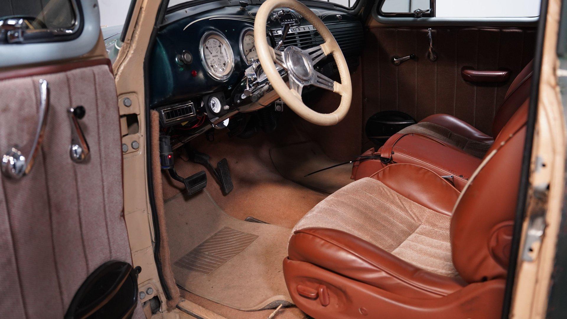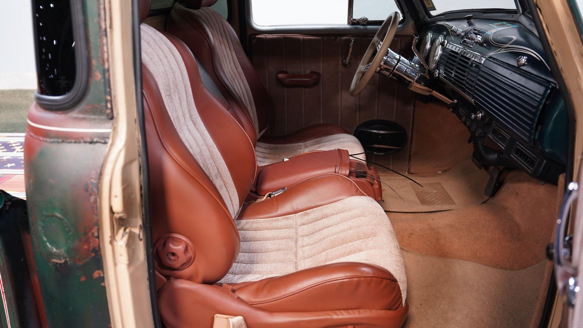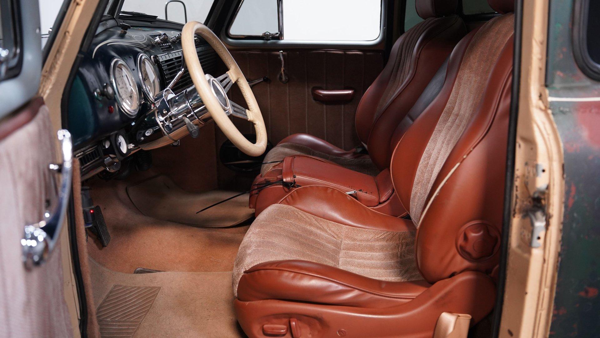 Step inside and you'll find a cabin that balances comfort and classic style. The interior features later model seats that show nicely, offering both support and a touch of modern convenience. The upholstery carries a lived-in patina vibe, while the headliner and center console add custom touches you won't find anywhere else. Dolphin gauges, a tilt column with an aftermarket wheel, and a retro-style radio with Bluetooth and aux input ensure that every drive is both connected and enjoyable.