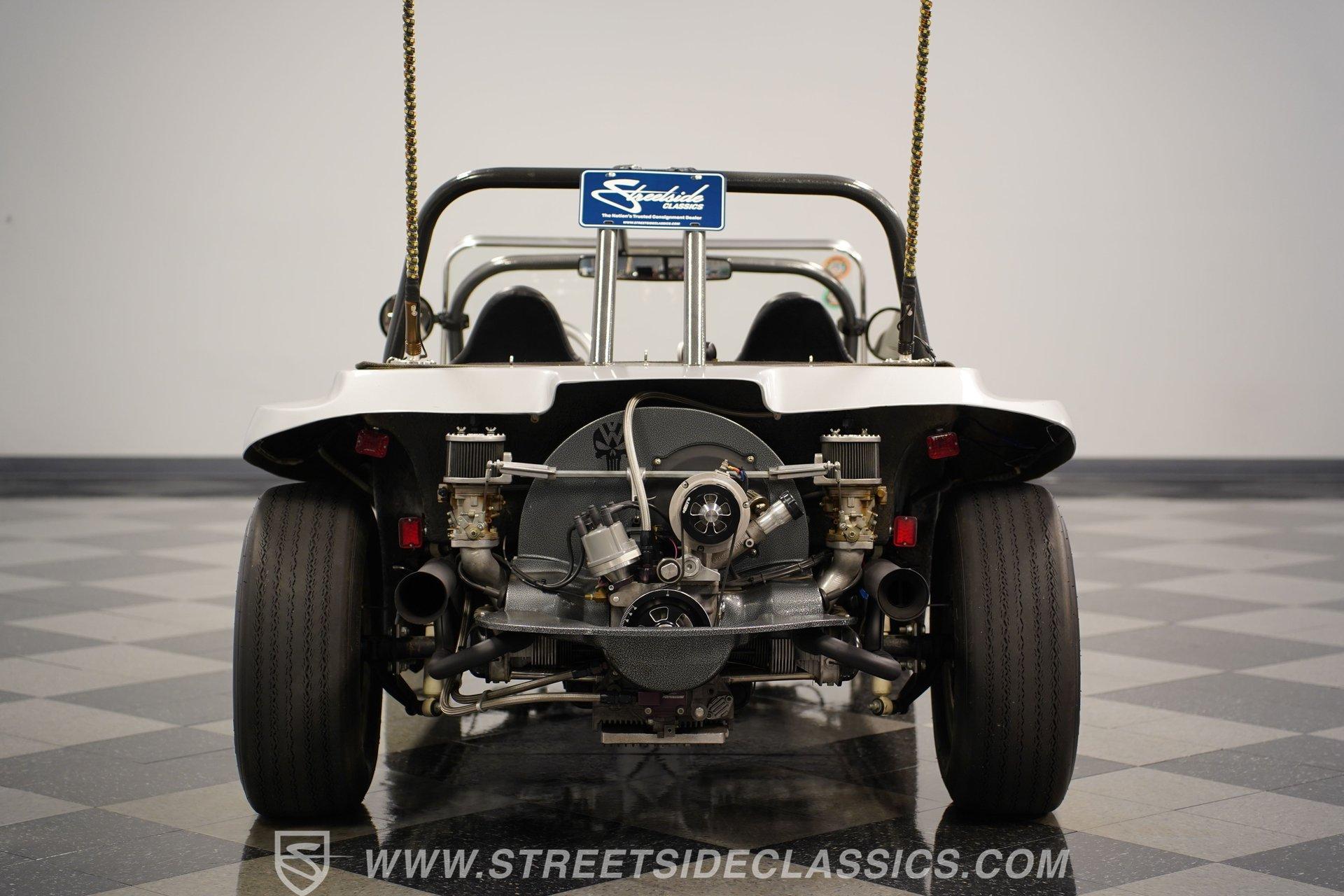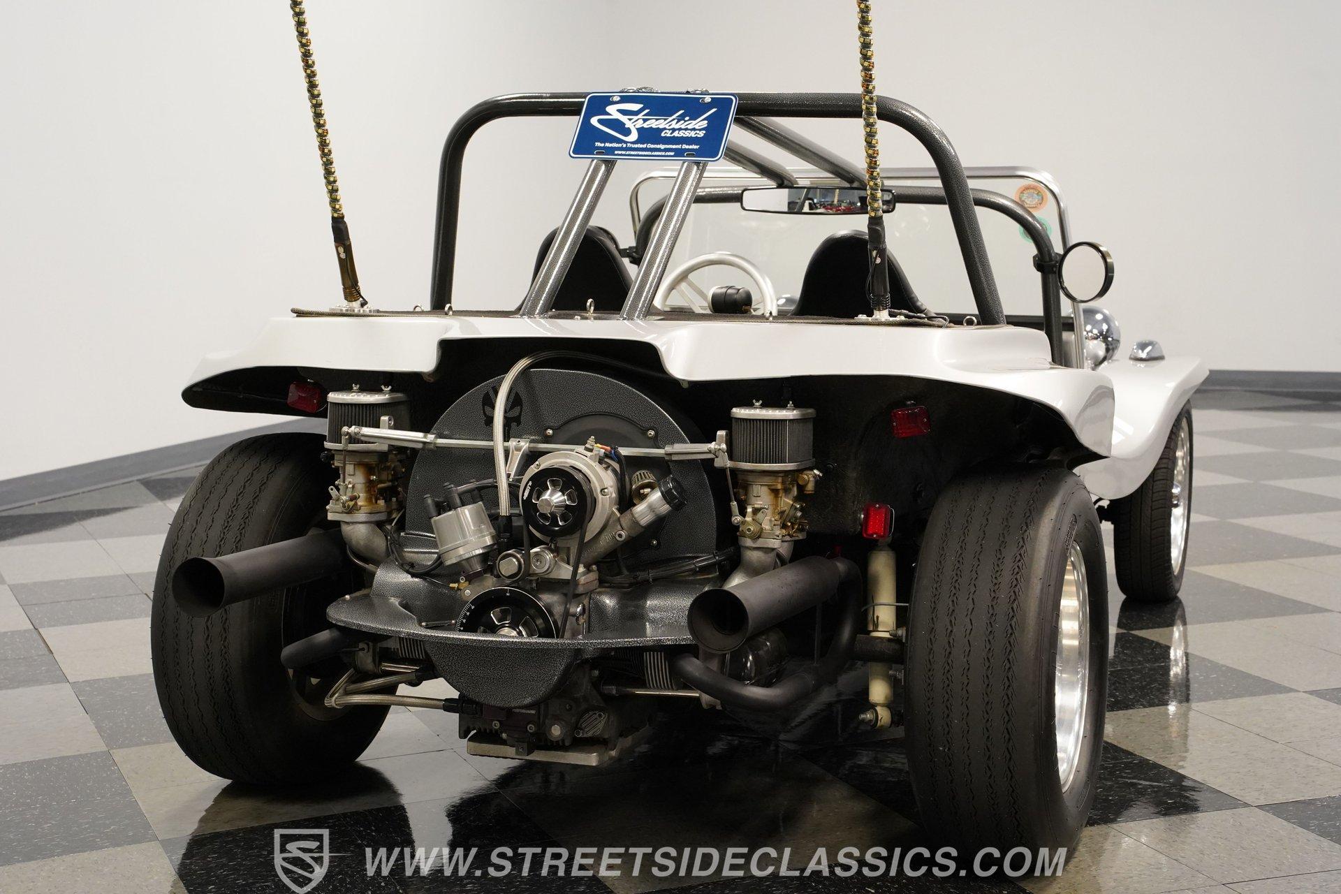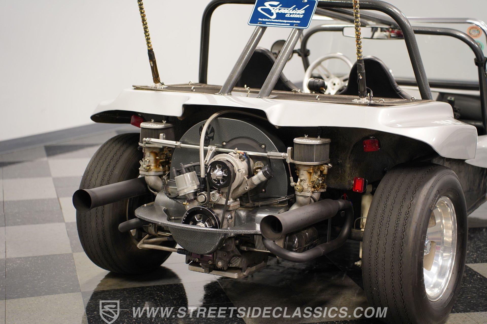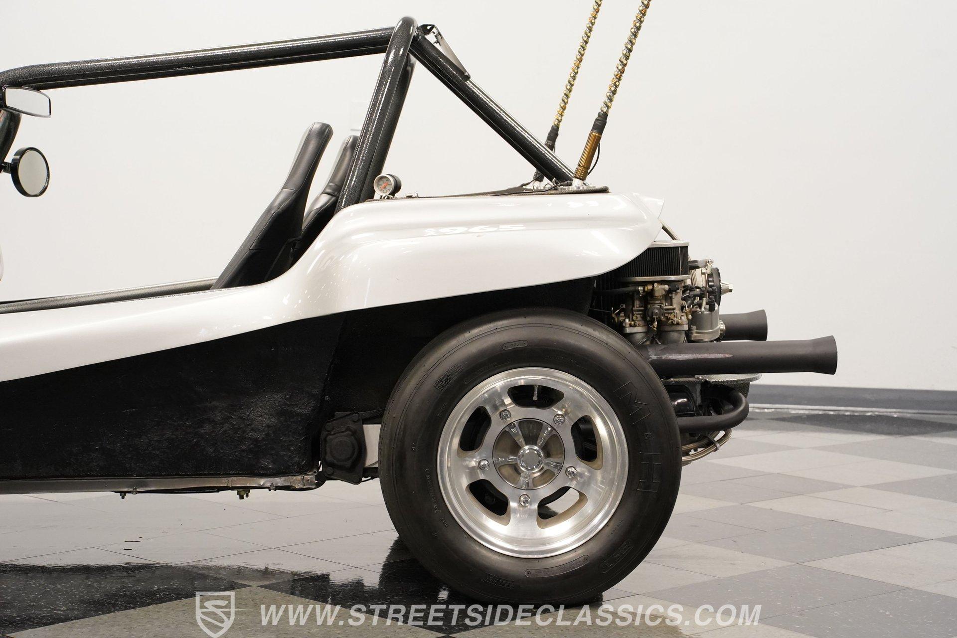 Power comes from a lively 1600 CC Flat-4 engine equipped with dual Weber two-barrel carburetors and paired with a 4-speed manual transmission. Factory-style front and rear suspension keeps the ride classic, while aftermarket lowering shocks give it a more aggressive stance. Custom 15-inch alloy wheels are wrapped in 145/65R15 tires up front and wider 235/65R15 tires in the rear for a planted look. Manual drum brakes provide reliable stopping power. Long tube headers, dual exhaust, and aftermarket mufflers give the buggy that unmistakable air-cooled sound every enthusiast loves.