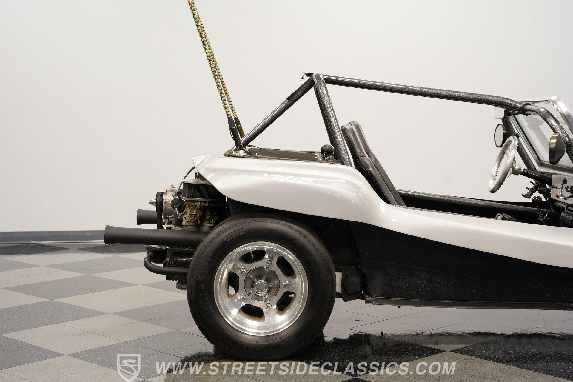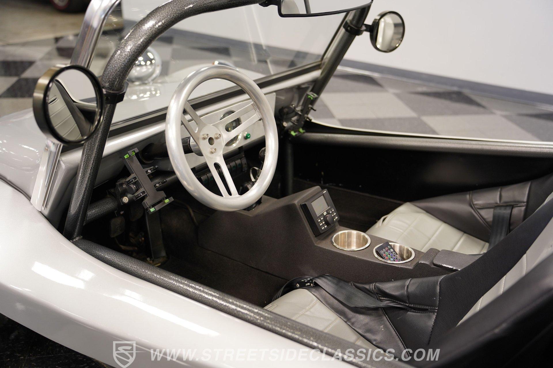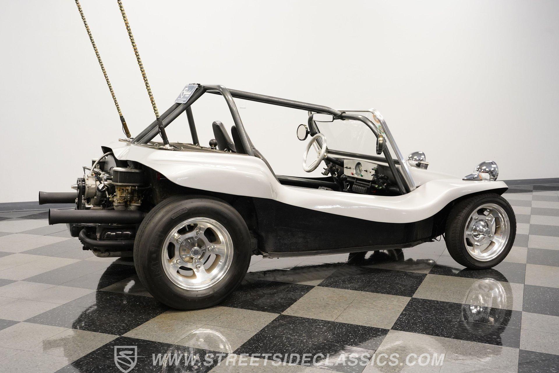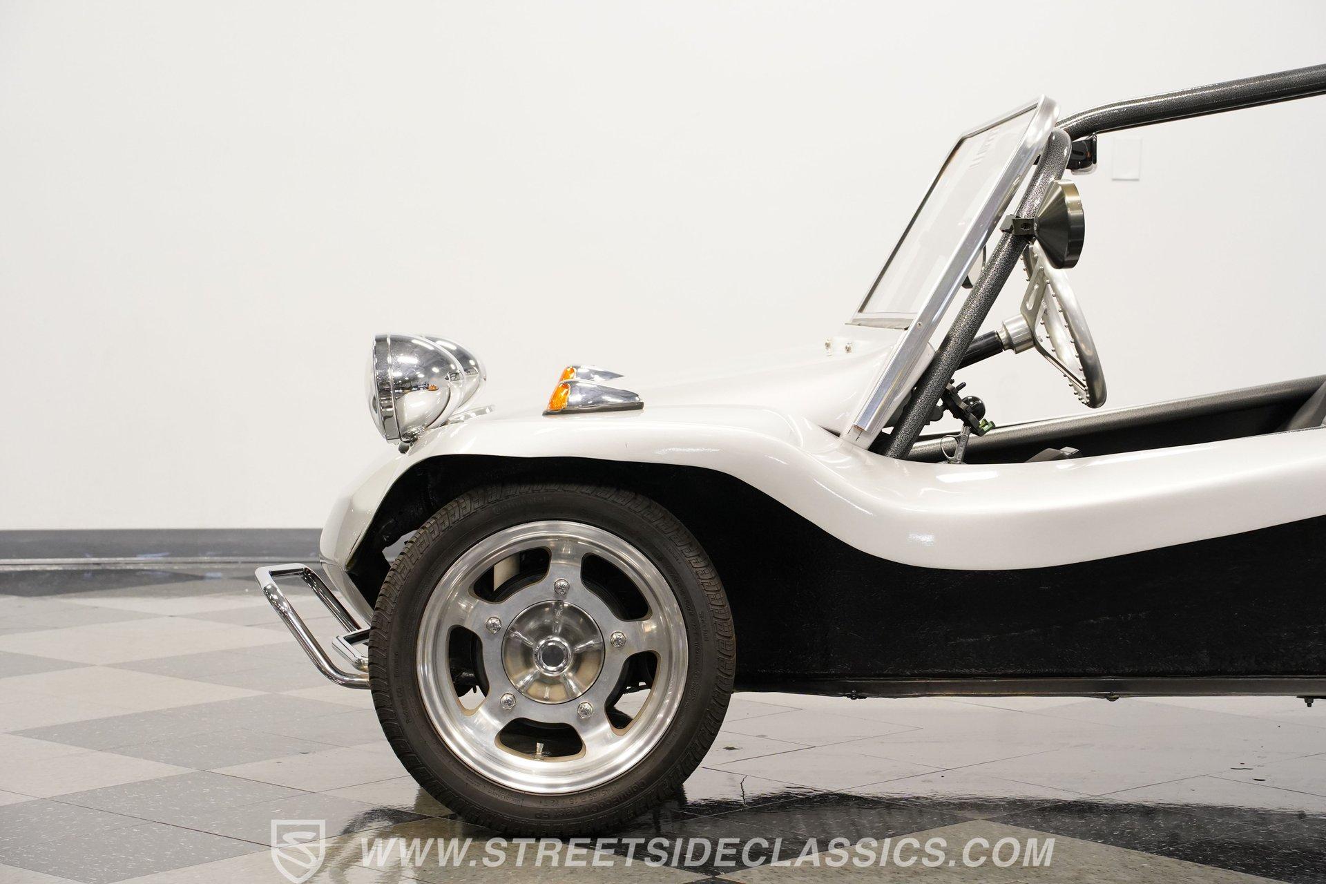 Power comes from a lively 1600 CC Flat-4 engine equipped with dual Weber two-barrel carburetors and paired with a 4-speed manual transmission. Factory-style front and rear suspension keeps the ride classic, while aftermarket lowering shocks give it a more aggressive stance. Custom 15-inch alloy wheels are wrapped in 145/65R15 tires up front and wider 235/65R15 tires in the rear for a planted look. Manual drum brakes provide reliable stopping power. Long tube headers, dual exhaust, and aftermarket mufflers give the buggy that unmistakable air-cooled sound every enthusiast loves.
