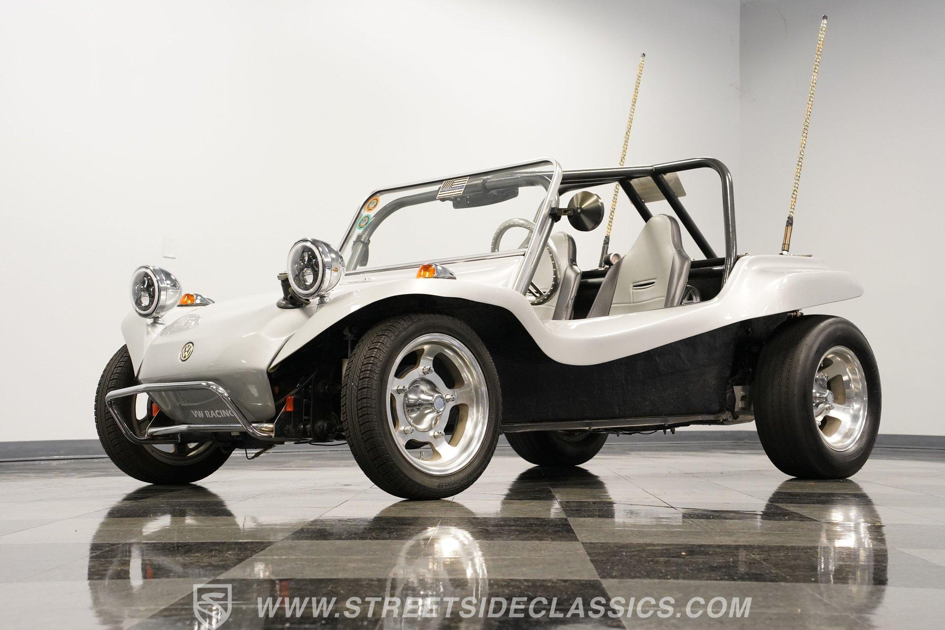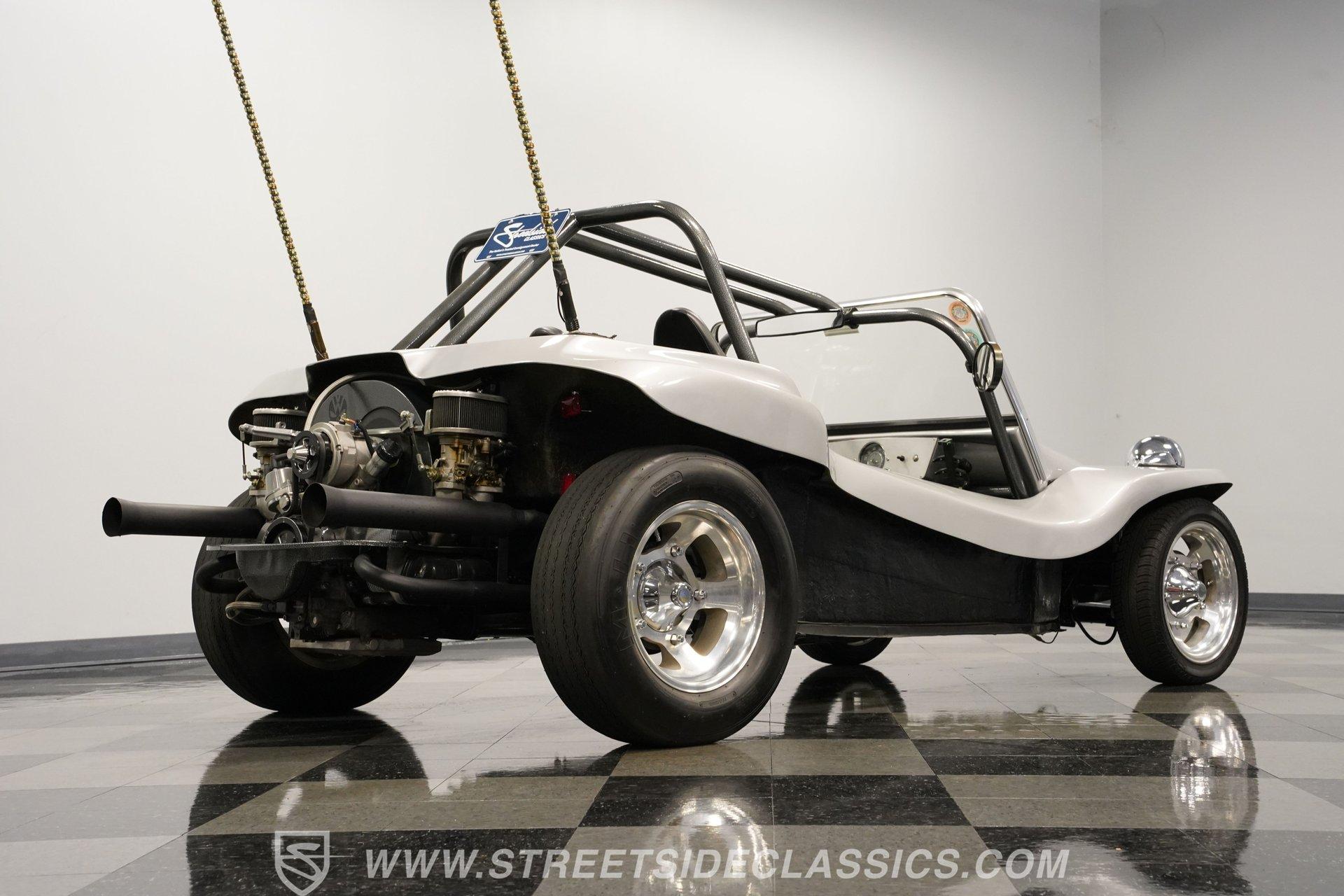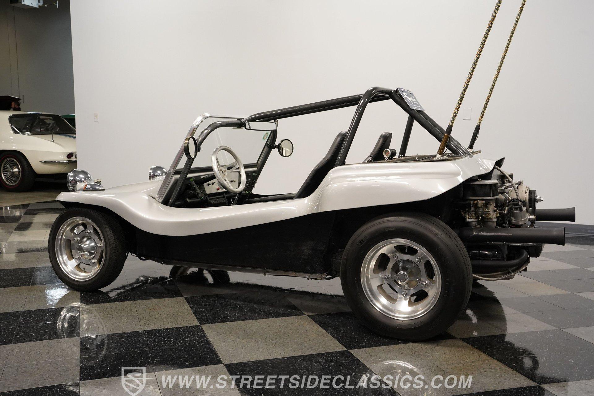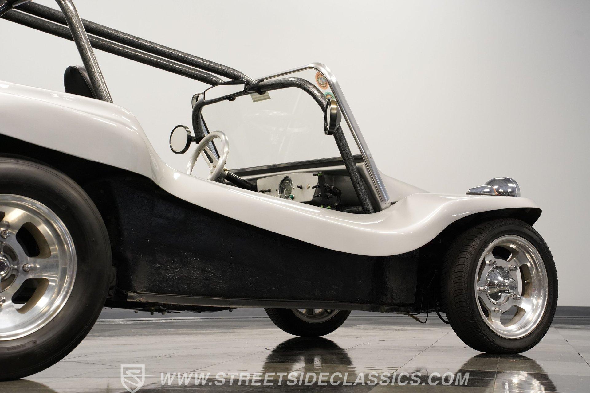 Power comes from a lively 1600 CC Flat-4 engine equipped with dual Weber two-barrel carburetors and paired with a 4-speed manual transmission. Factory-style front and rear suspension keeps the ride classic, while aftermarket lowering shocks give it a more aggressive stance. Custom 15-inch alloy wheels are wrapped in 145/65R15 tires up front and wider 235/65R15 tires in the rear for a planted look. Manual drum brakes provide reliable stopping power. Long tube headers, dual exhaust, and aftermarket mufflers give the buggy that unmistakable air-cooled sound every enthusiast loves.