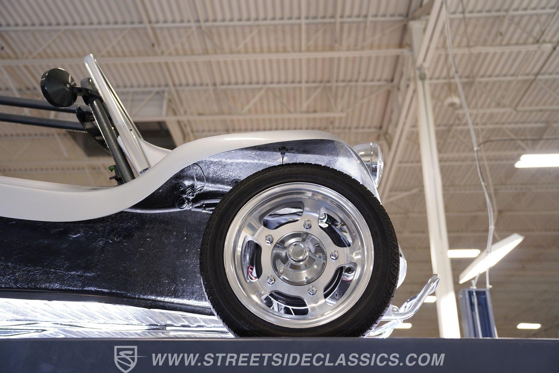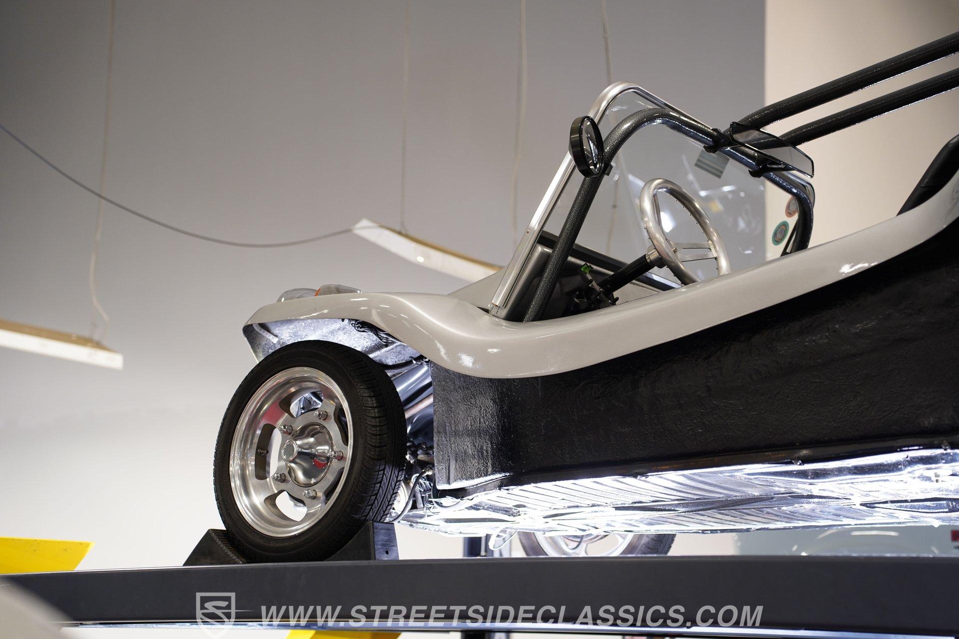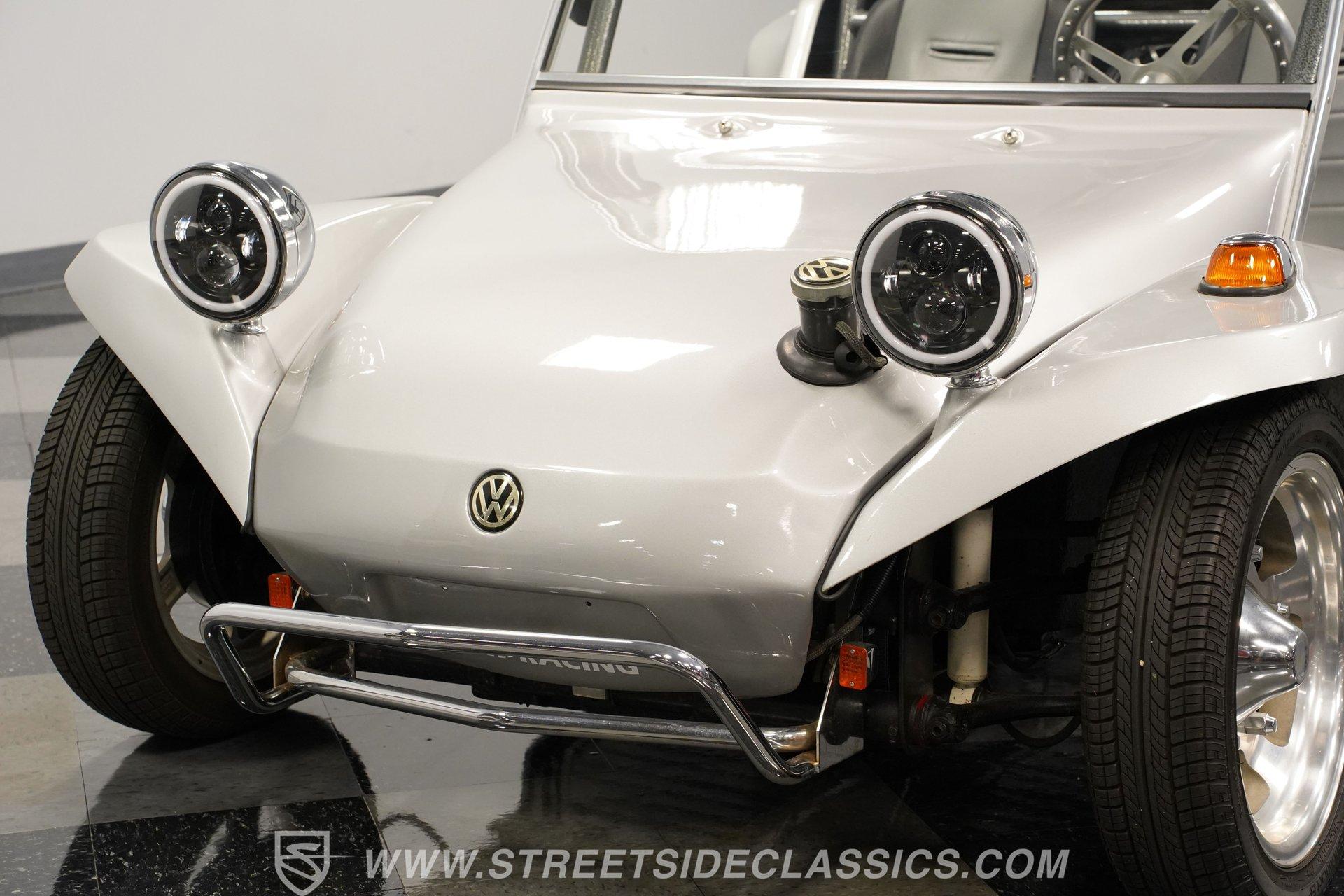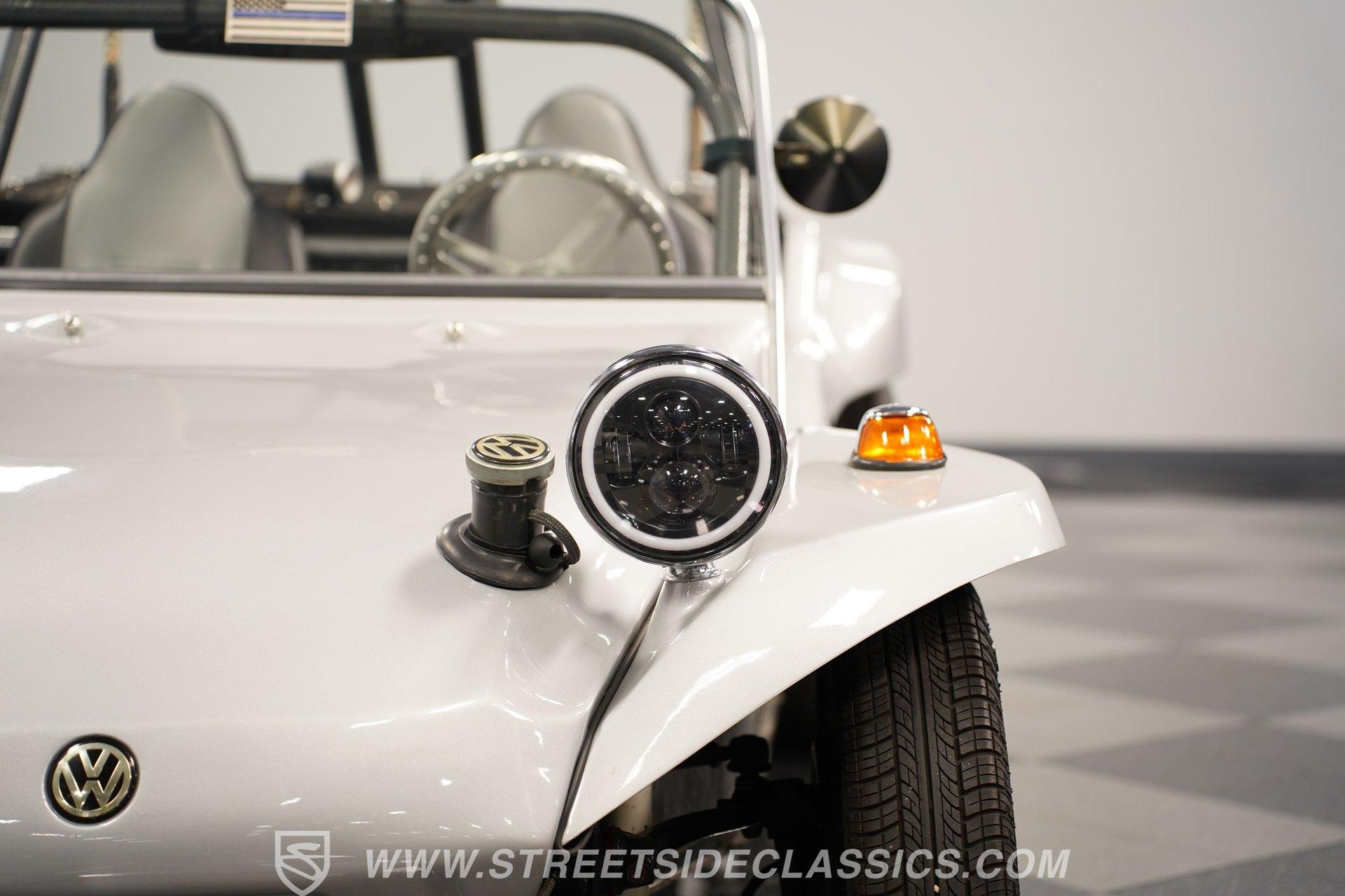 Up front, a sturdy brush guard gives the nose a rugged look, paired with modern Halo LED headlights for improved visibility. Out back, LED taillights keep things bright and clean, while dual antennas add a bit of vintage flair. Custom 15-inch alloy wheels at all four corners give the buggy extra character and a sporty stance, complemented nicely by the black-painted roll bar. There's no unnecessary flash here-just a classic dune buggy designed for one thing: having fun behind the wheel.