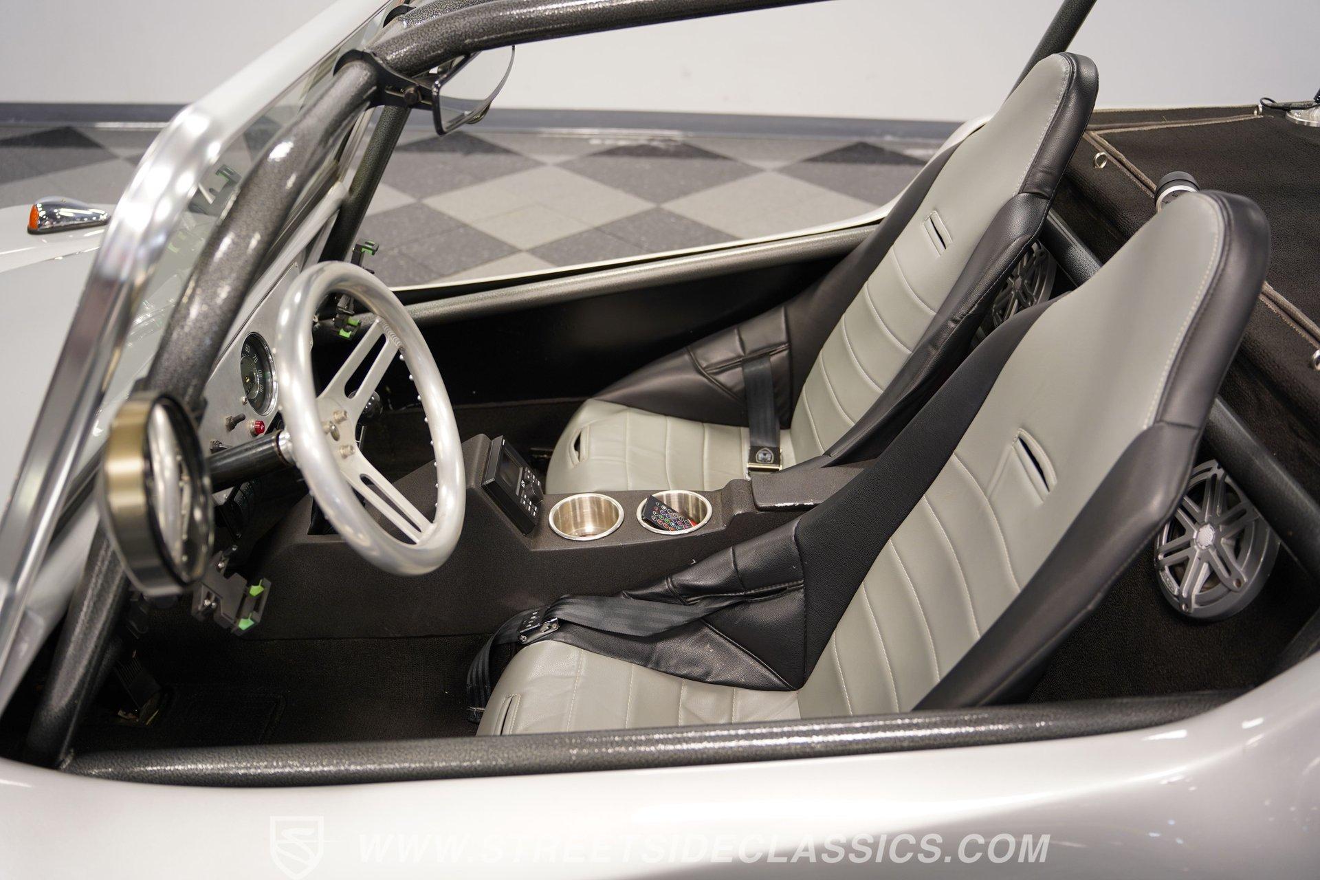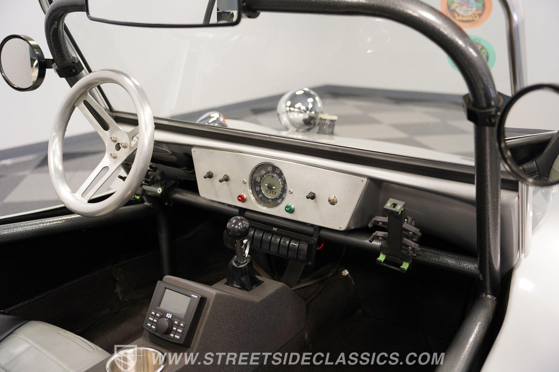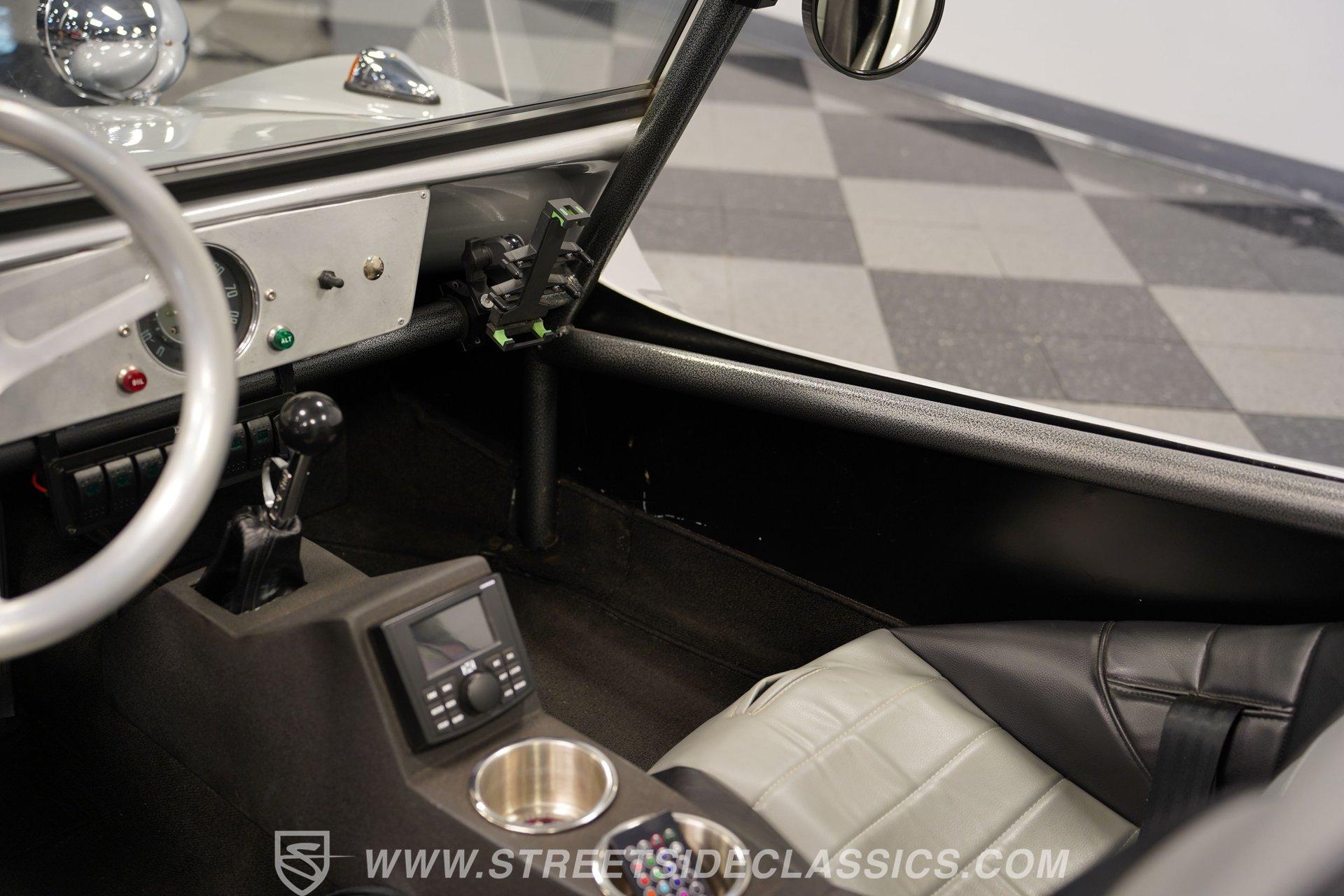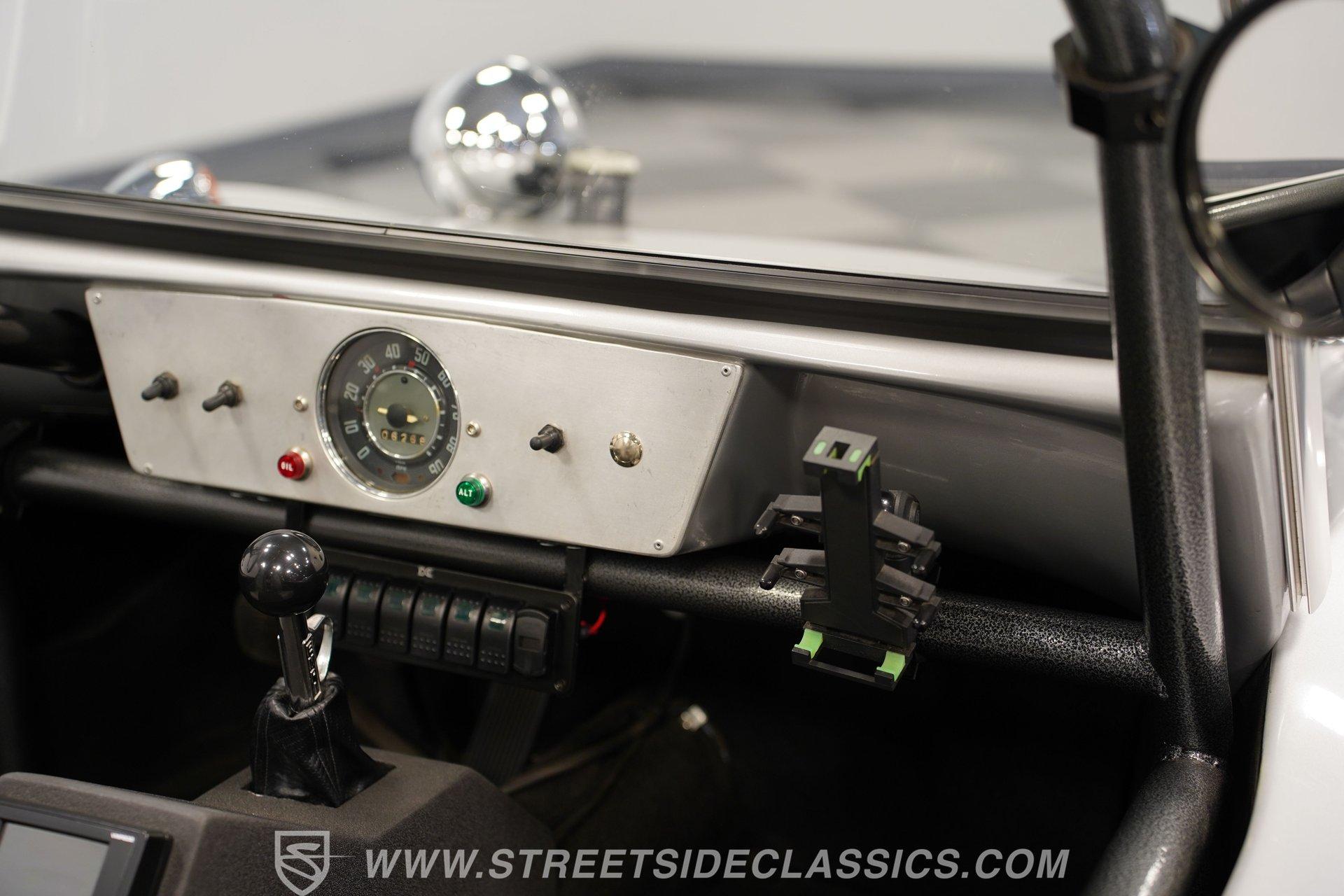 Inside, two-tone racing-style bucket seats welcome you into a simple but functional cockpit. The carpets are clean, and the center console focuses on convenience with integrated cup holders. An AM/FM radio with Aux inputs sits within easy reach and sends sound through JL Audio speakers mounted behind the seats. The EMPI shifter is perfectly positioned and makes rowing through the gears part of the fun. Up front, the stainless-look dashboard keeps things minimal with a single speedometer and a few warning lights. Beneath the dash, you'll find several auxiliary switches controlling additional lighting and accessories. It's straightforward, uncluttered, and exactly what you'd expect in a classic dune buggy.