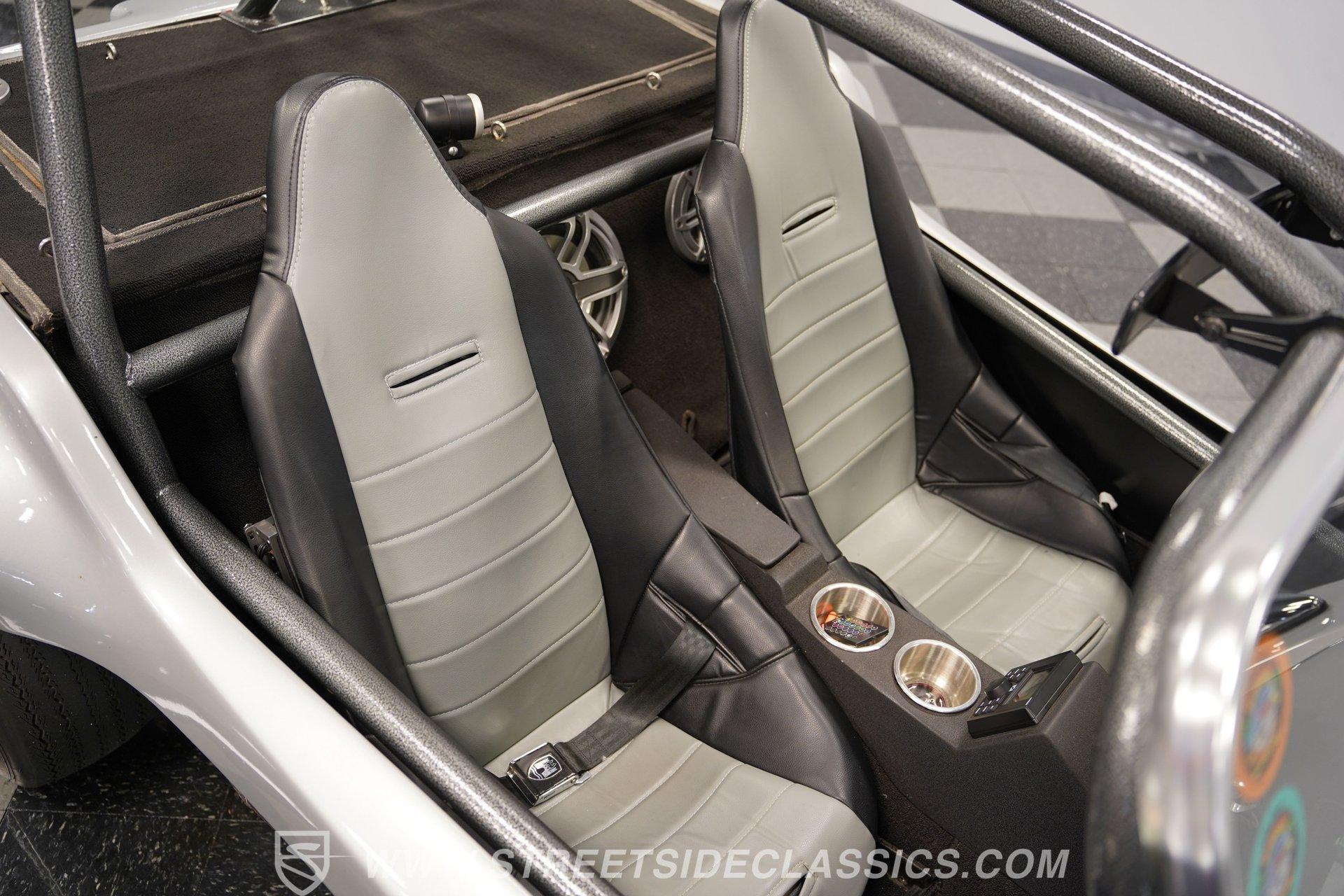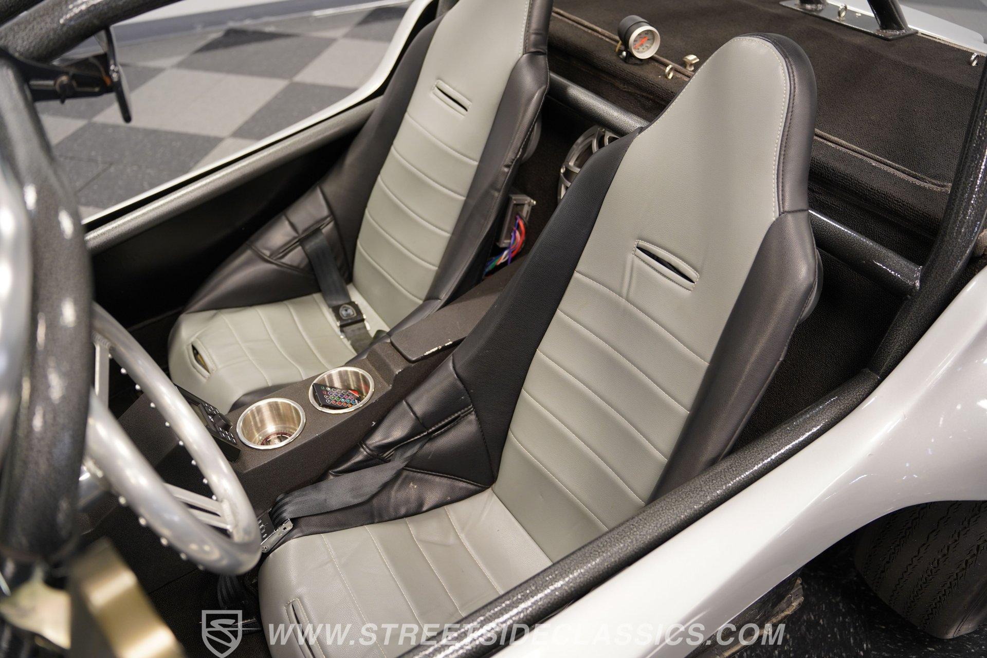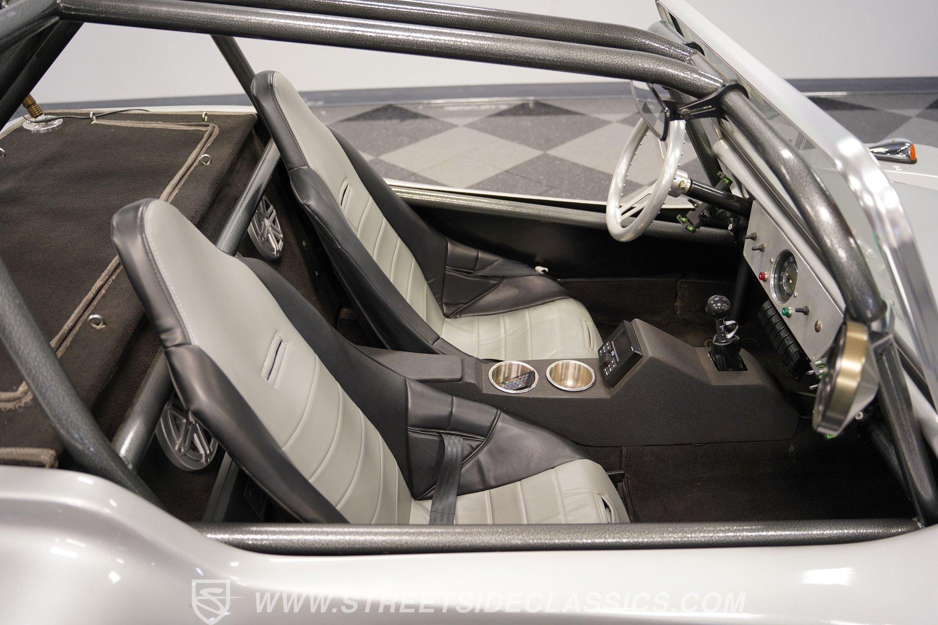 Inside, two-tone racing-style bucket seats welcome you into a simple but functional cockpit. The carpets are clean, and the center console focuses on convenience with integrated cup holders. An AM/FM radio with Aux inputs sits within easy reach and sends sound through JL Audio speakers mounted behind the seats. The EMPI shifter is perfectly positioned and makes rowing through the gears part of the fun. Up front, the stainless-look dashboard keeps things minimal with a single speedometer and a few warning lights. Beneath the dash, you'll find several auxiliary switches controlling additional lighting and accessories. It's straightforward, uncluttered, and exactly what you'd expect in a classic dune buggy.