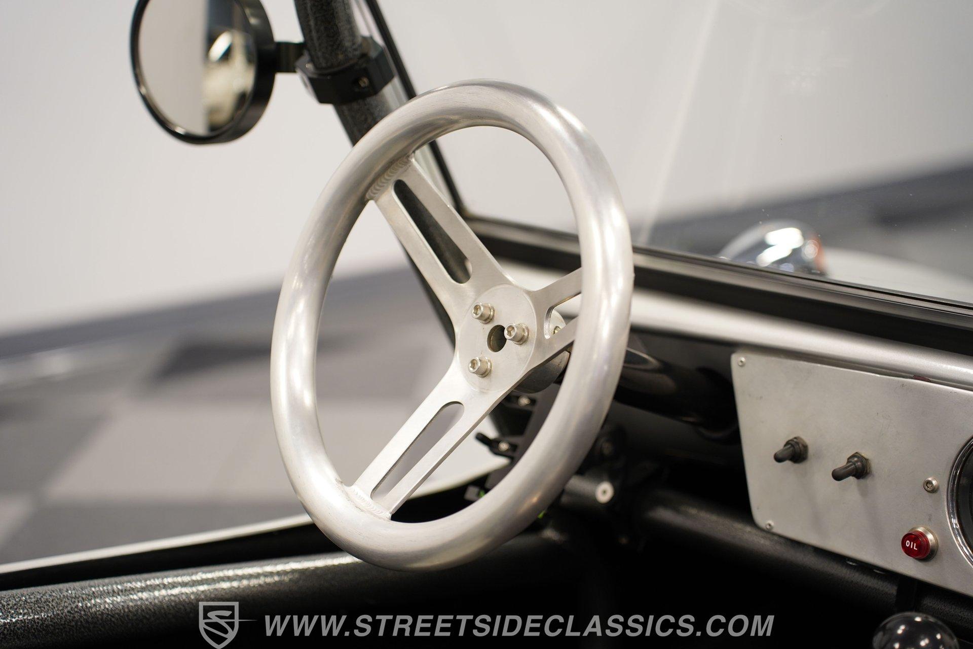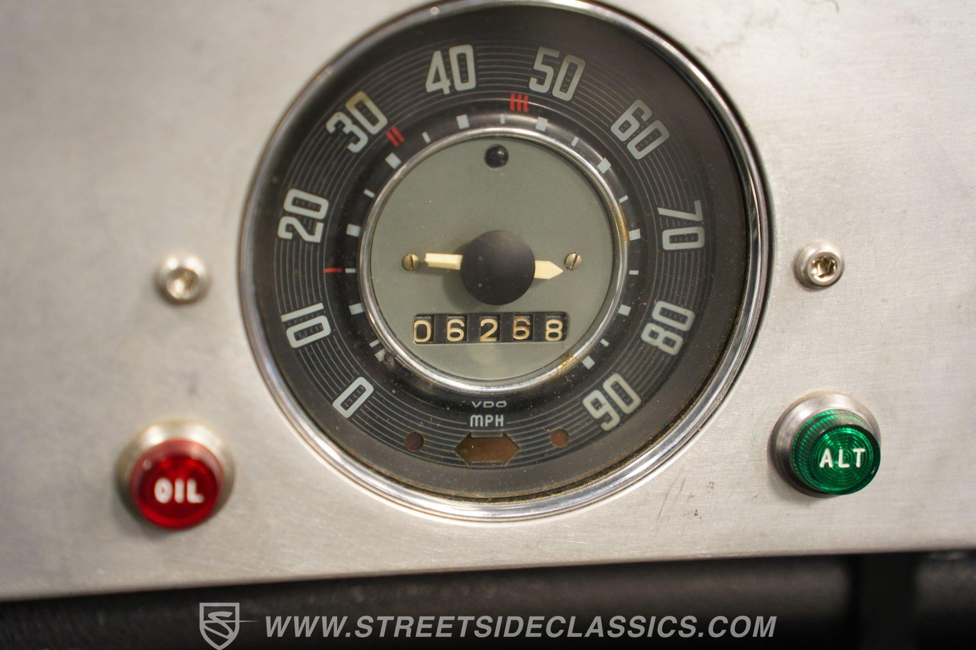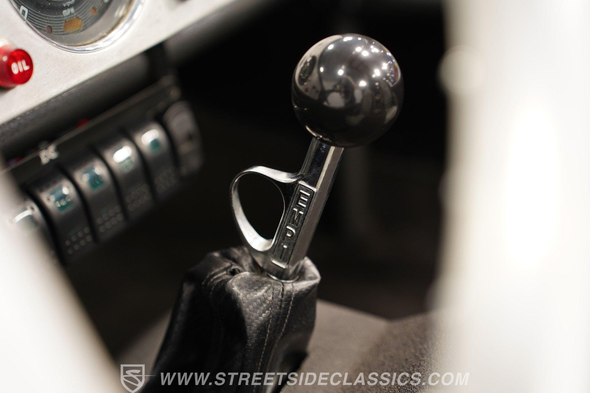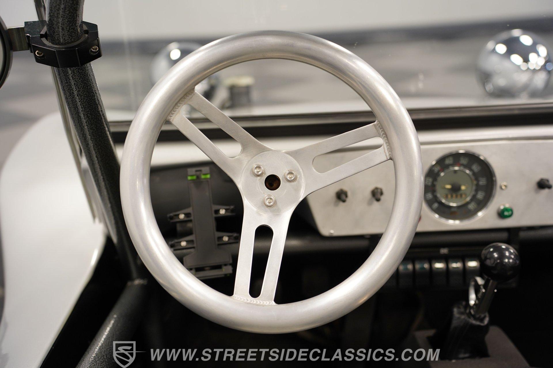 Inside, two-tone racing-style bucket seats welcome you into a simple but functional cockpit. The carpets are clean, and the center console focuses on convenience with integrated cup holders. An AM/FM radio with Aux inputs sits within easy reach and sends sound through JL Audio speakers mounted behind the seats. The EMPI shifter is perfectly positioned and makes rowing through the gears part of the fun. Up front, the stainless-look dashboard keeps things minimal with a single speedometer and a few warning lights. Beneath the dash, you'll find several auxiliary switches controlling additional lighting and accessories. It's straightforward, uncluttered, and exactly what you'd expect in a classic dune buggy.