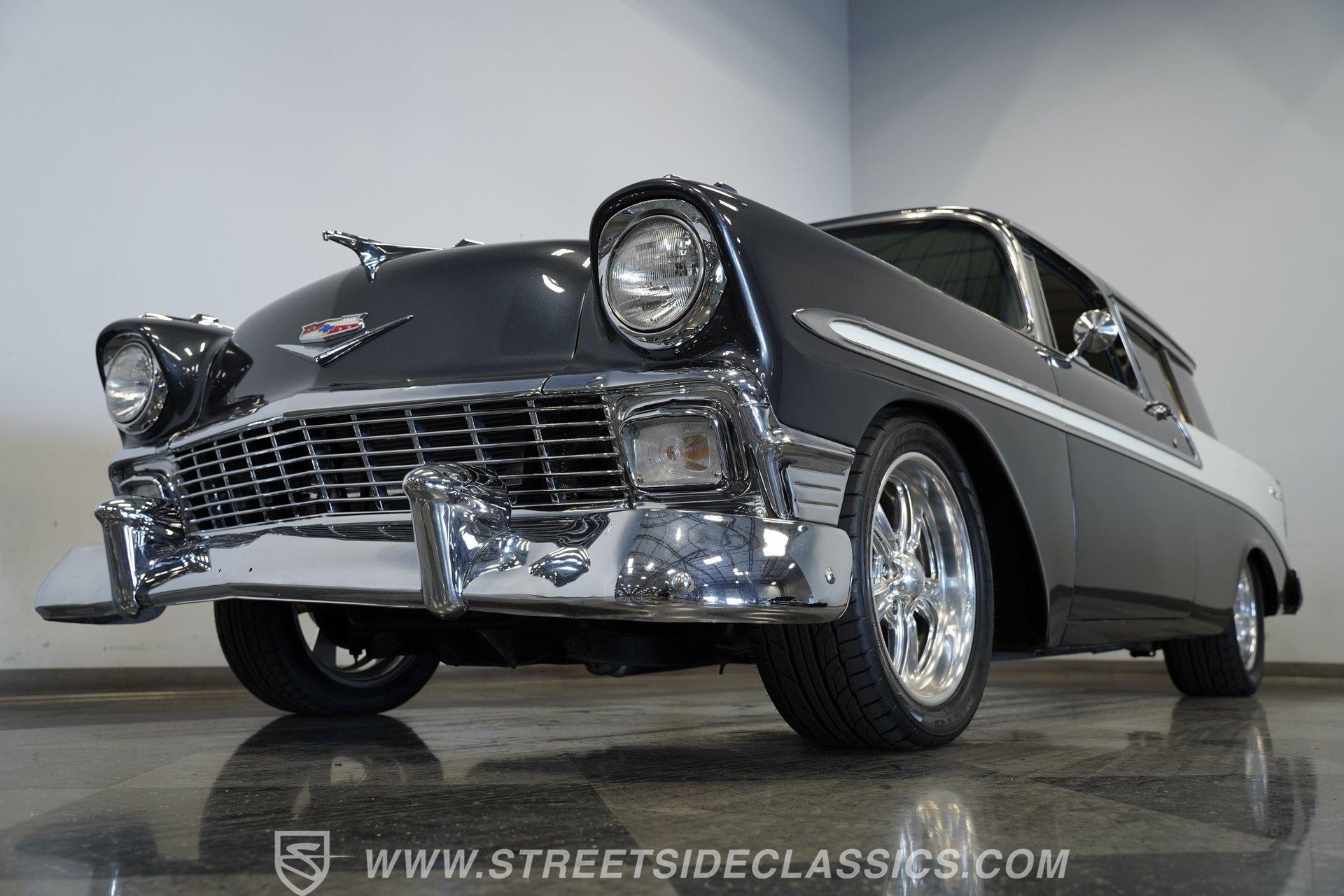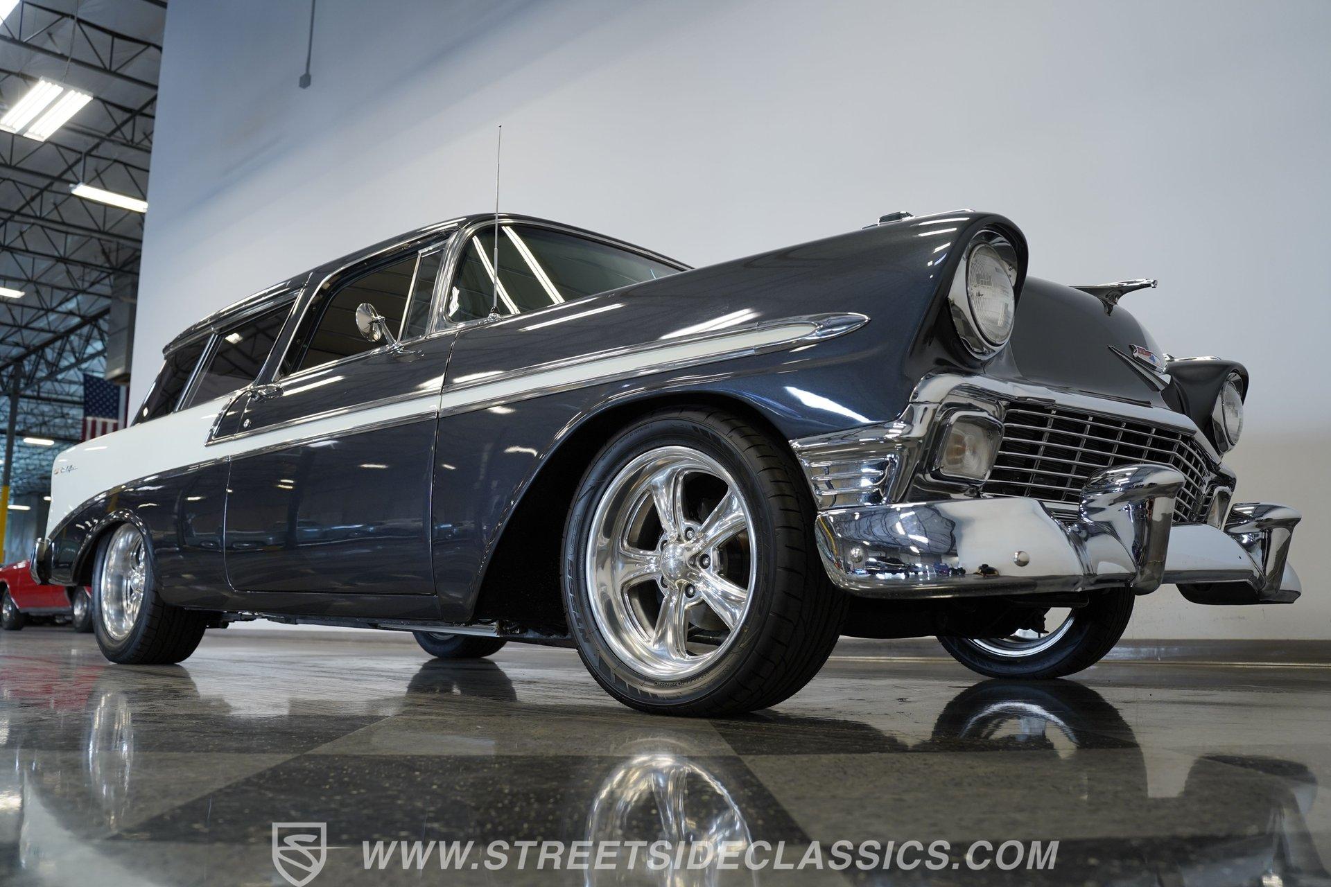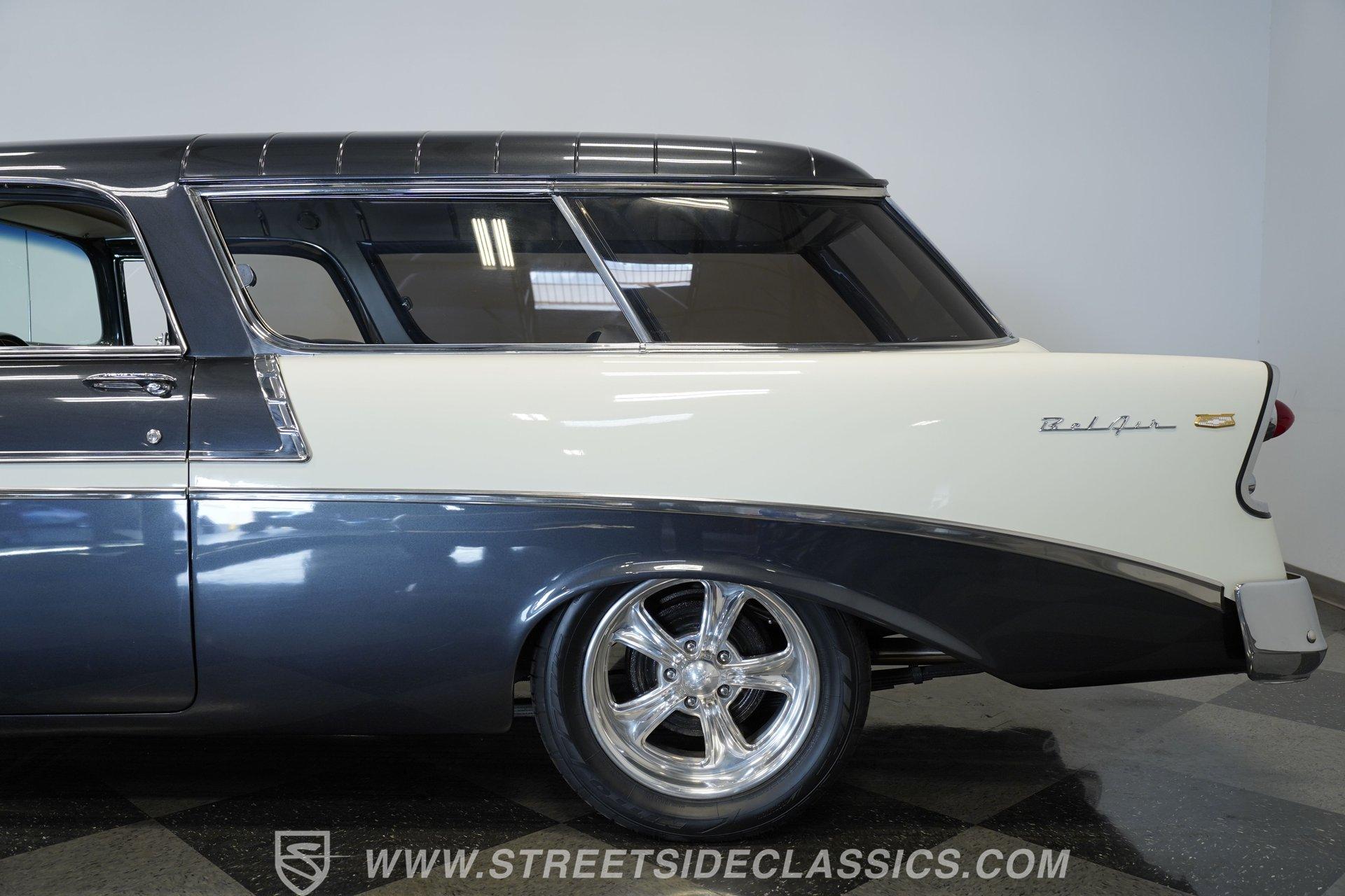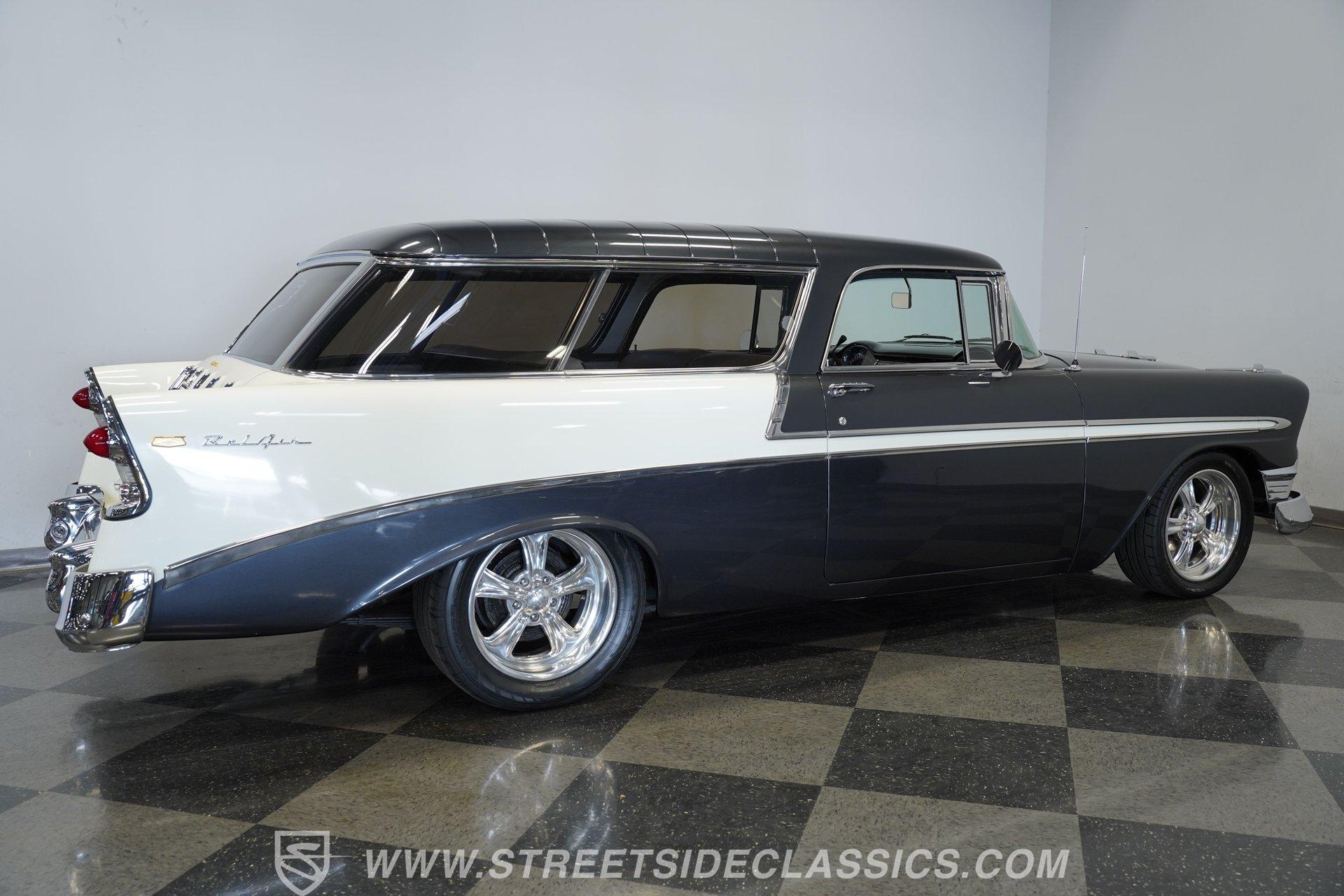 It's arguably one of the most iconic rides Chevy ever created. Just one look at this 1956 Chevrolet Nomad is all it takes to conjure up images of a simpler time, full of carefree adventuring. Revitalized in a Charcoal Gray Metallic over Cream color scheme, with some added metallic flakes in the gray section to catch the sun to perfection, this is a great looking classic. It features a tastefully lowered stance and its set of ultra-sharp 17'' Billet Specialties wheels adds the perfect finishing touch. This vintage Chevy's chrome bright work is in fine condition, including the telescoping chrome antenna, the window tinting retains nice, even coloring and a closer inspection will confirm that its door seals and window trim are pliable and have kept any potentially intruding elements at bay.