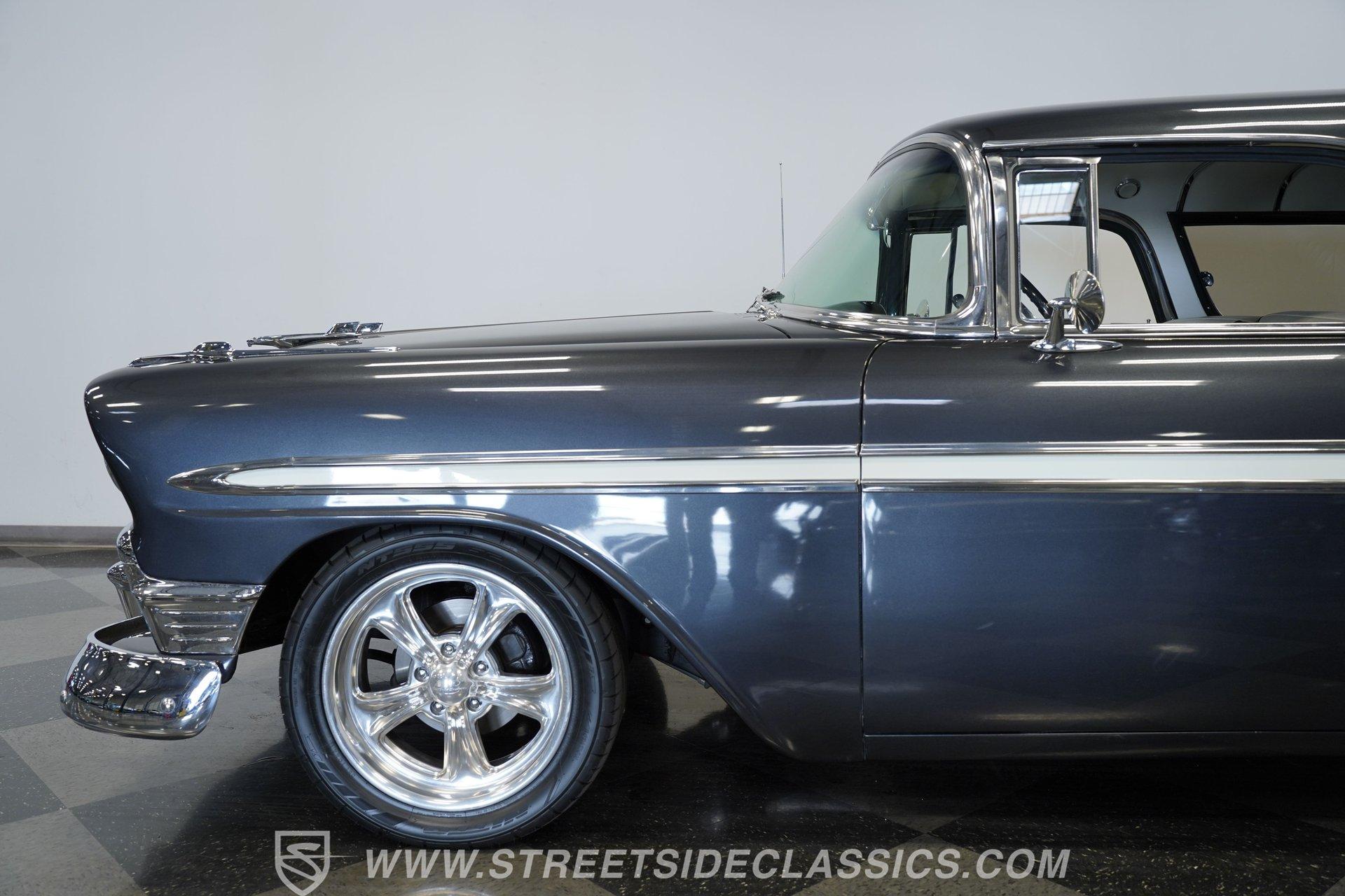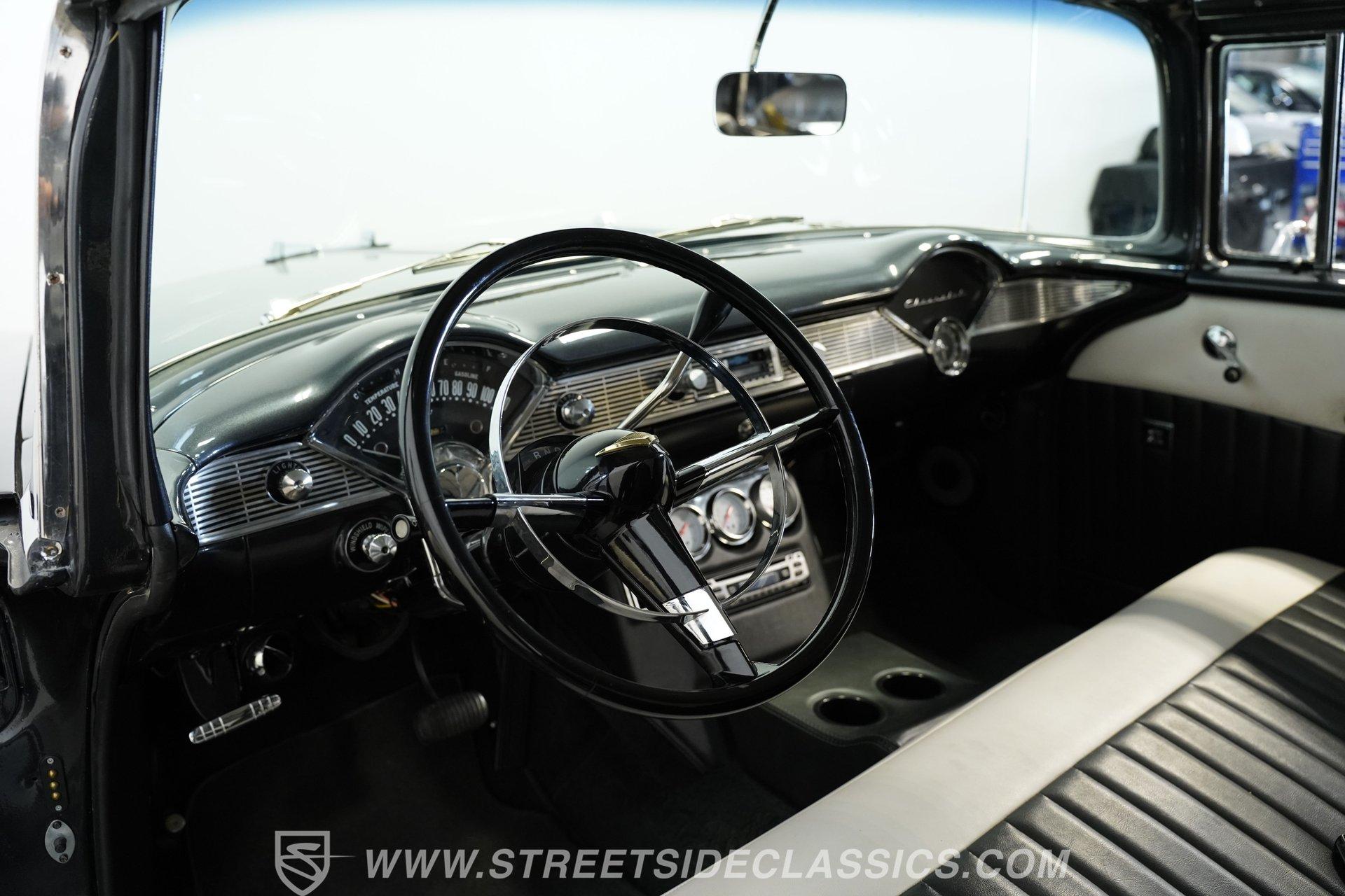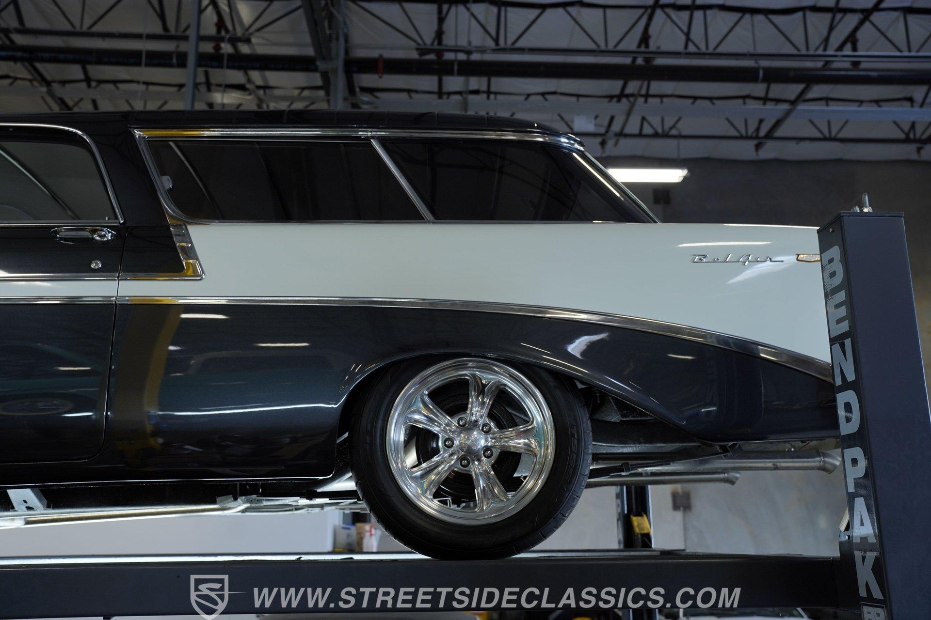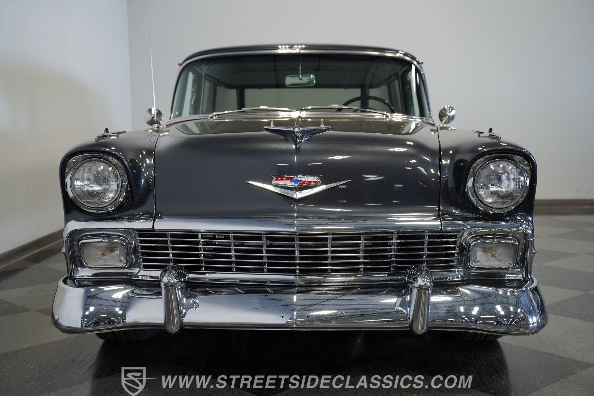 It's arguably one of the most iconic rides Chevy ever created. Just one look at this 1956 Chevrolet Nomad is all it takes to conjure up images of a simpler time, full of carefree adventuring. Revitalized in a Charcoal Gray Metallic over Cream color scheme, with some added metallic flakes in the gray section to catch the sun to perfection, this is a great looking classic. It features a tastefully lowered stance and its set of ultra-sharp 17'' Billet Specialties wheels adds the perfect finishing touch. This vintage Chevy's chrome bright work is in fine condition, including the telescoping chrome antenna, the window tinting retains nice, even coloring and a closer inspection will confirm that its door seals and window trim are pliable and have kept any potentially intruding elements at bay.