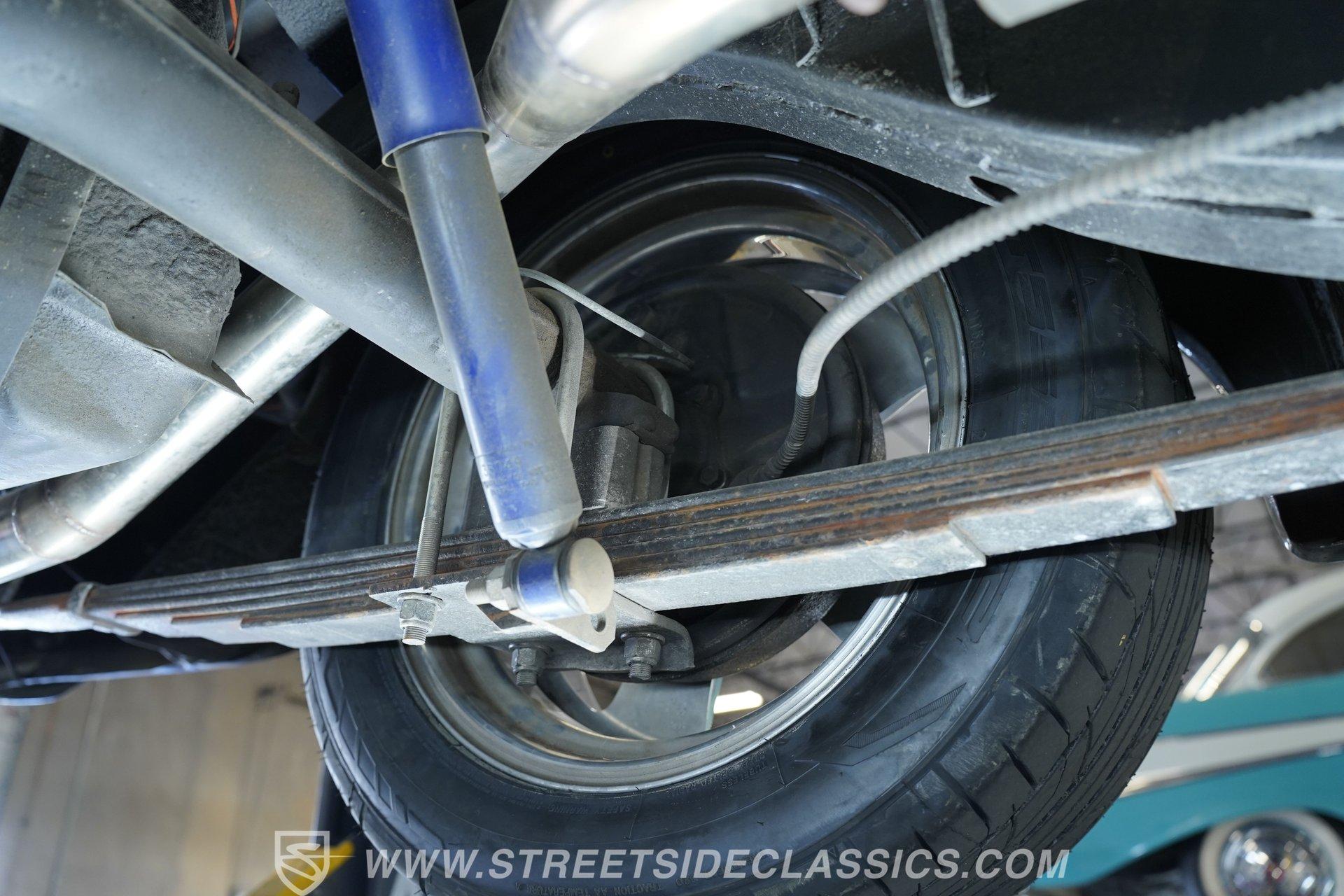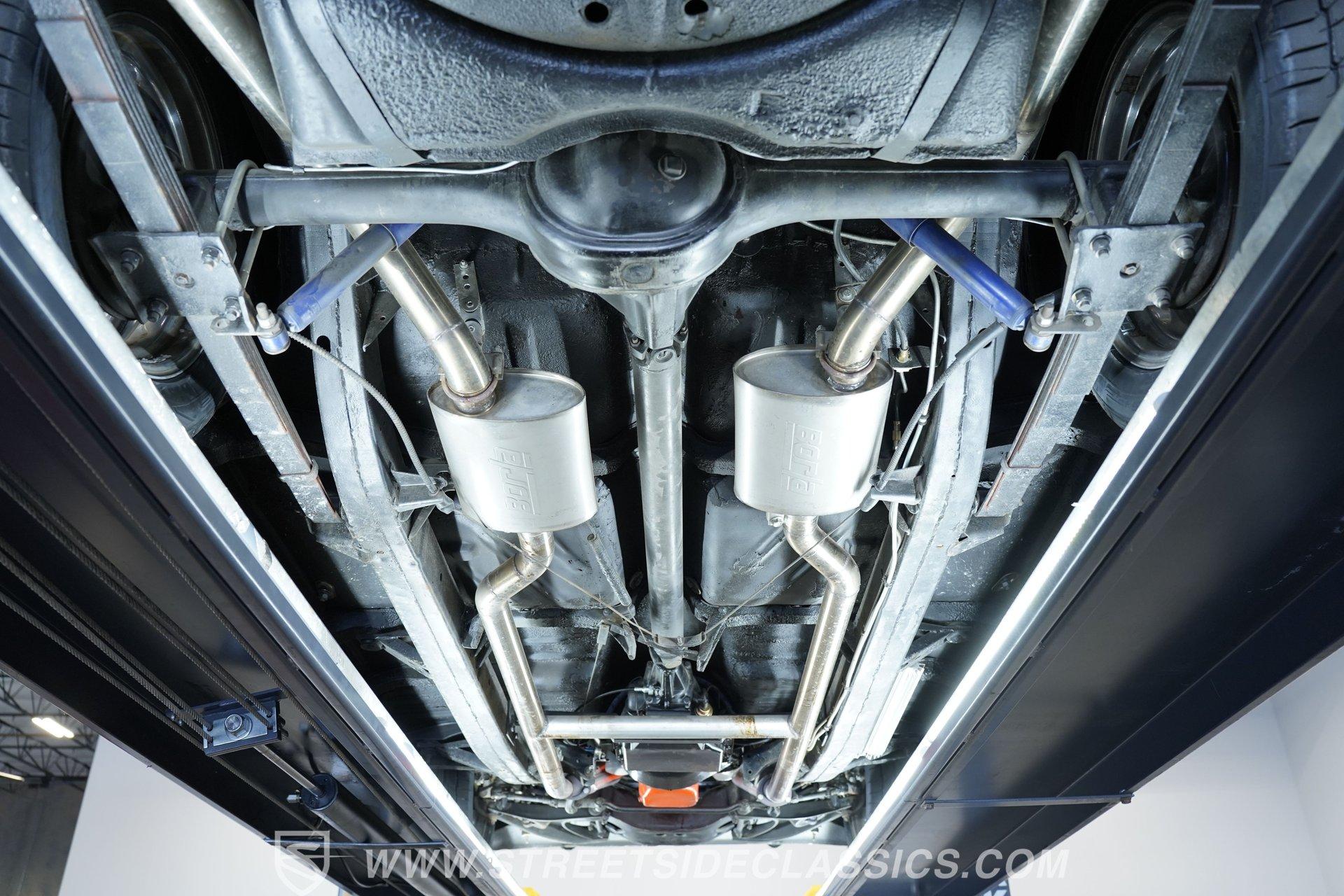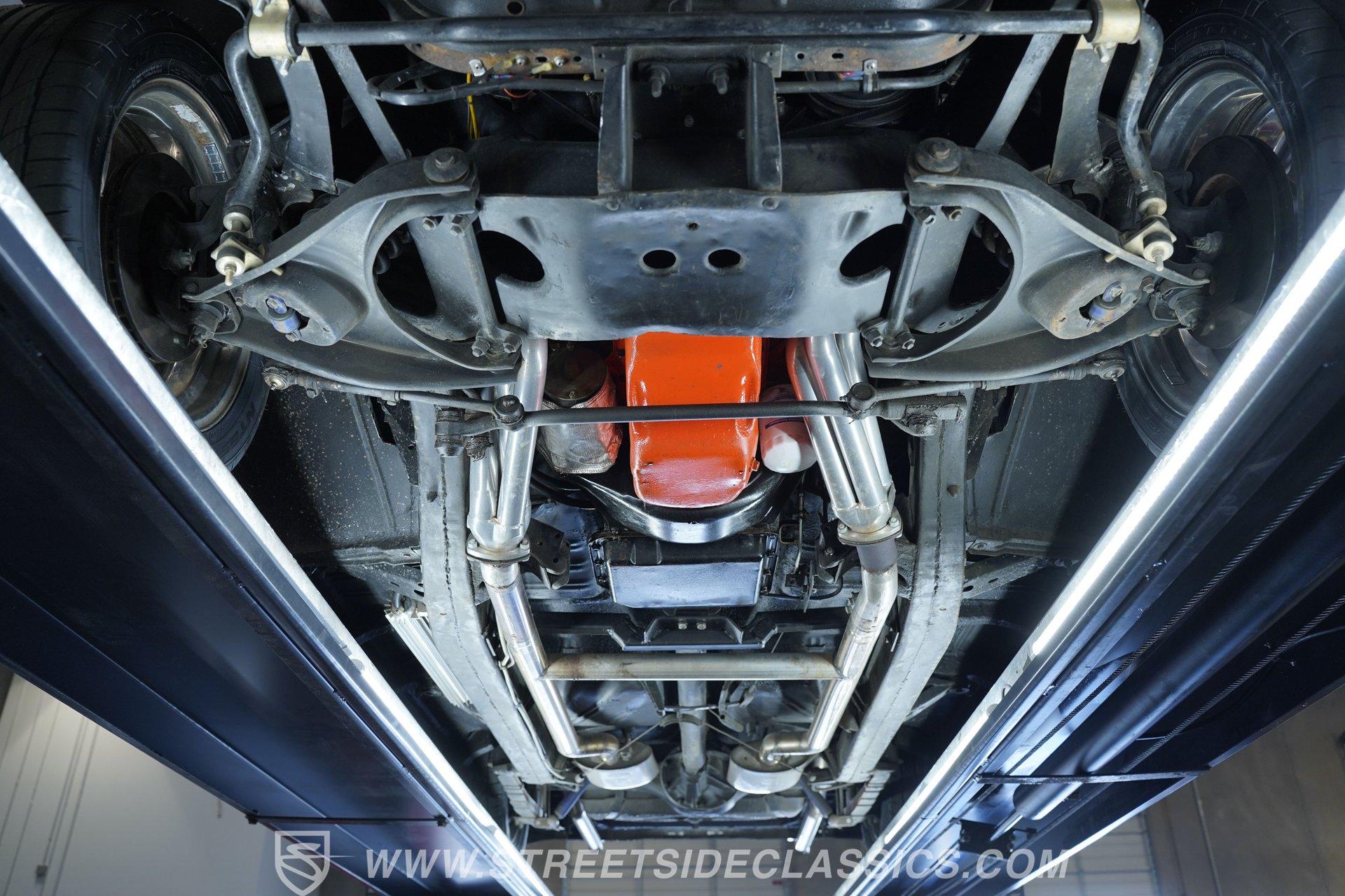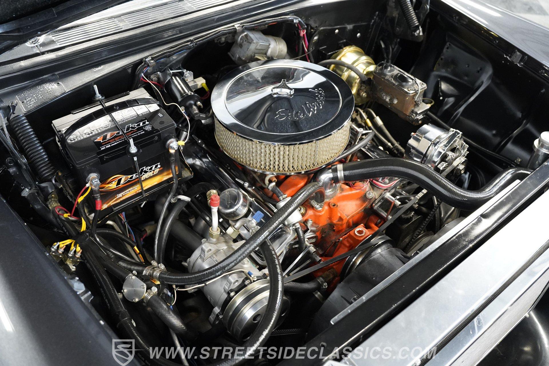 There's plenty to like beneath the hood, where a 350-cubic-inch V8 stands by, ready for action and outfitted with a four-barrel Quadrajet carburetor. Mated to a smooth shifting 3-speed automatic transmission, the engine is in fine form, sending a deep note out of the dual exhaust that leads to a pair of Borla mufflers. A Moroso aluminum radiator sits up front, equipped with a pair of electric fans to keep operating temperatures in check, and the way the aftermarket air conditioning condenser was so cleanly integrated with the radiator shows a reassuring attention to detail. Power brakes that include discs up front bring prompt stops, while the power steering on this Chevy makes it easy to maneuver.