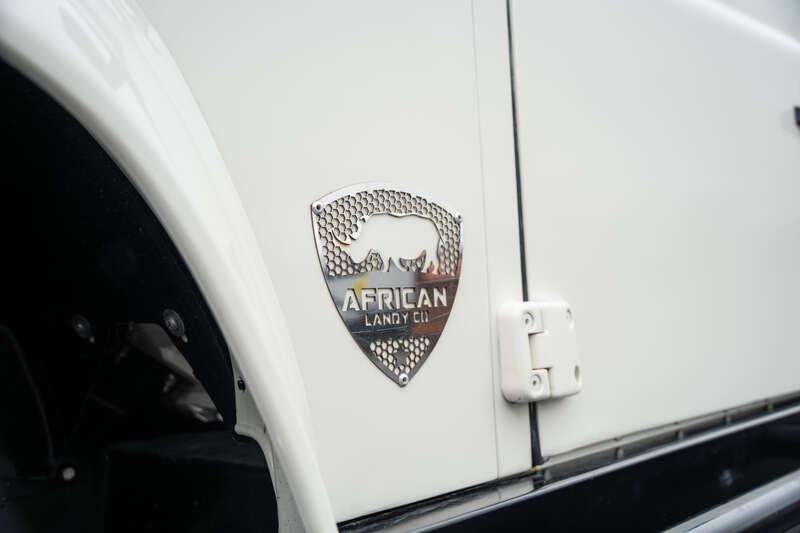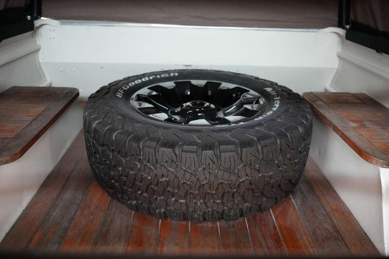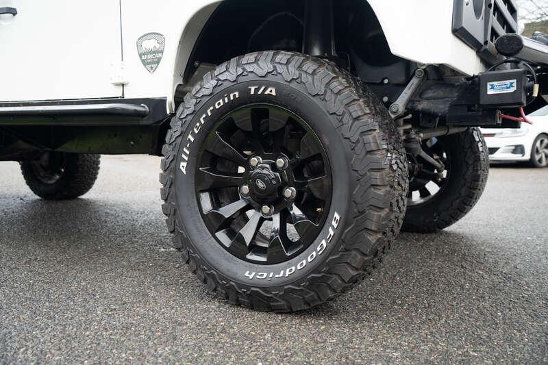 - Present specification includes a retrimmed light tan interior with a diamond pattern finish, front winch, a new set of alloy wheels fitted with BF Goodrich All Terrain T/A tyres, side steps, and rear bed cage covering the wood-lined base