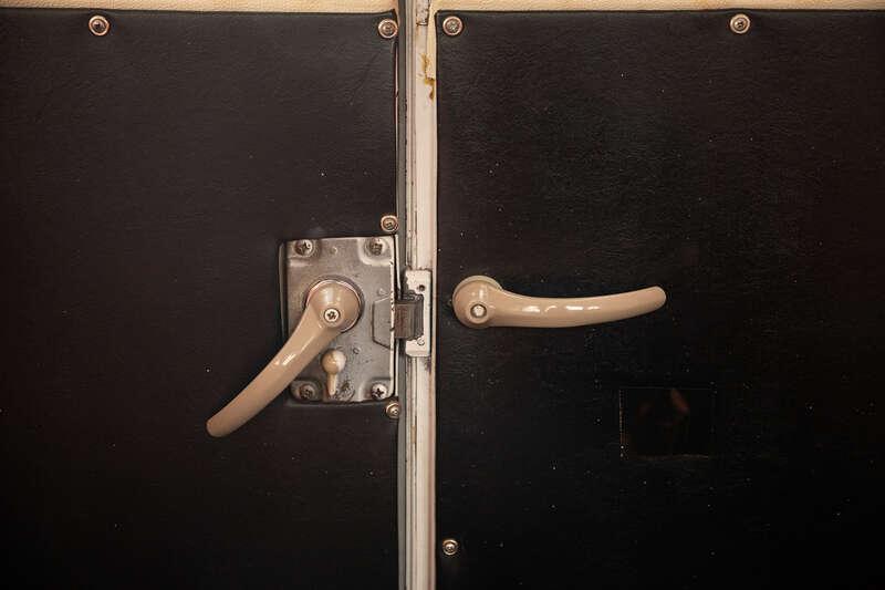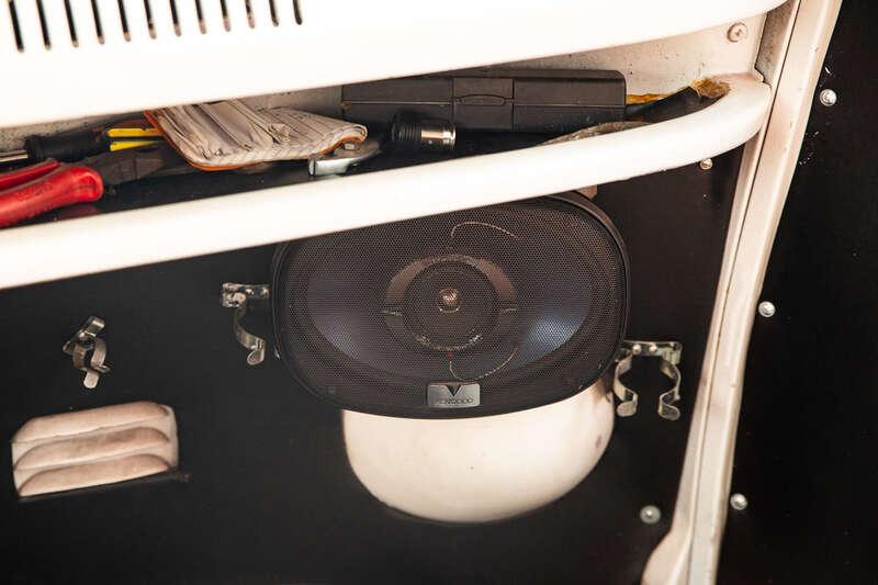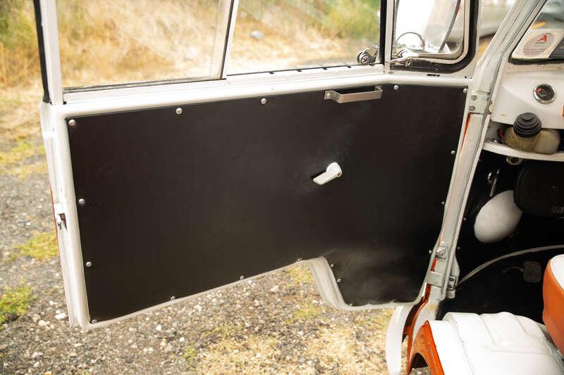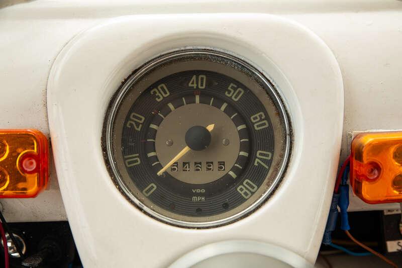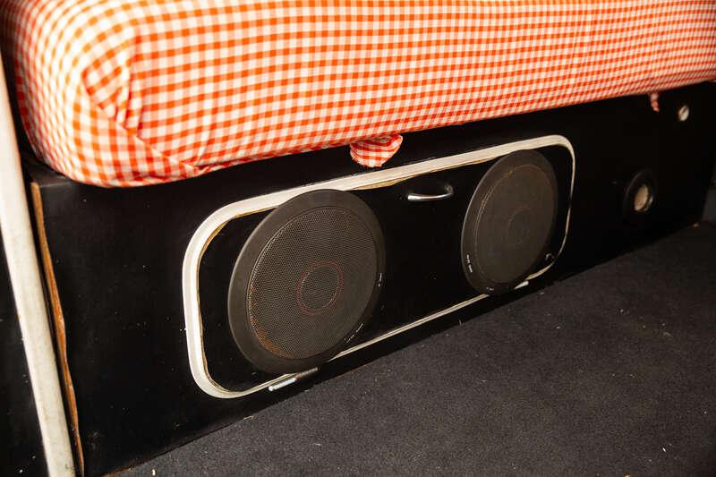 - The interior is trimmed in a body-matching orange and white colour scheme, with vinyl striped seats to the front and gingham check bench seats to the rear, complemented by black carpeting and a sound system