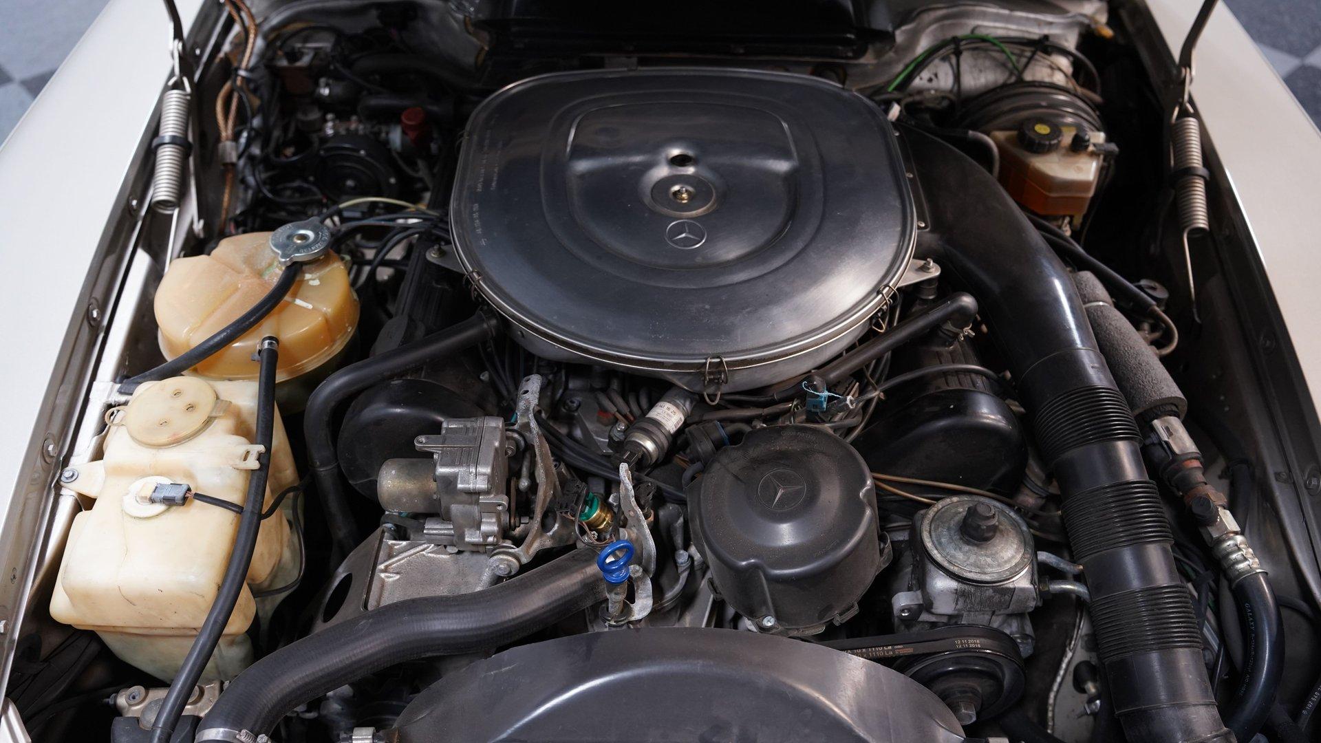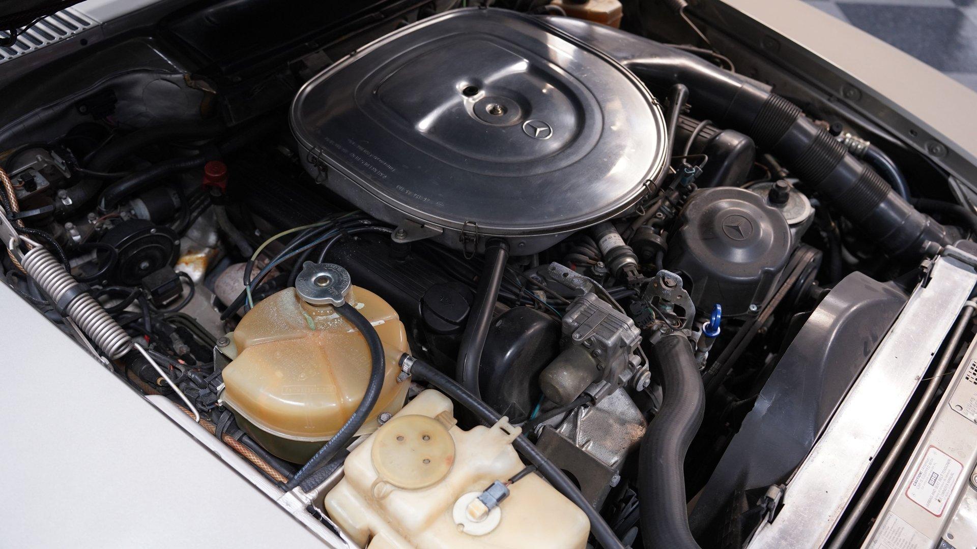 Step inside and discover an interior that blends classic Mercedes craftsmanship with tasteful modern touches. The cabin features custom two-tone upholstery, offering a fresh and inviting look while retaining the original spirit of the car. The dash and gauges are clear and easy to read, while the carpets and hardtop headliner are in excellent condition. Upgraded Kenwood head unit, Memphis speakers, and a subwoofer behind the seats ensure every drive is accompanied by your favorite soundtrack in crystal-clear audio.