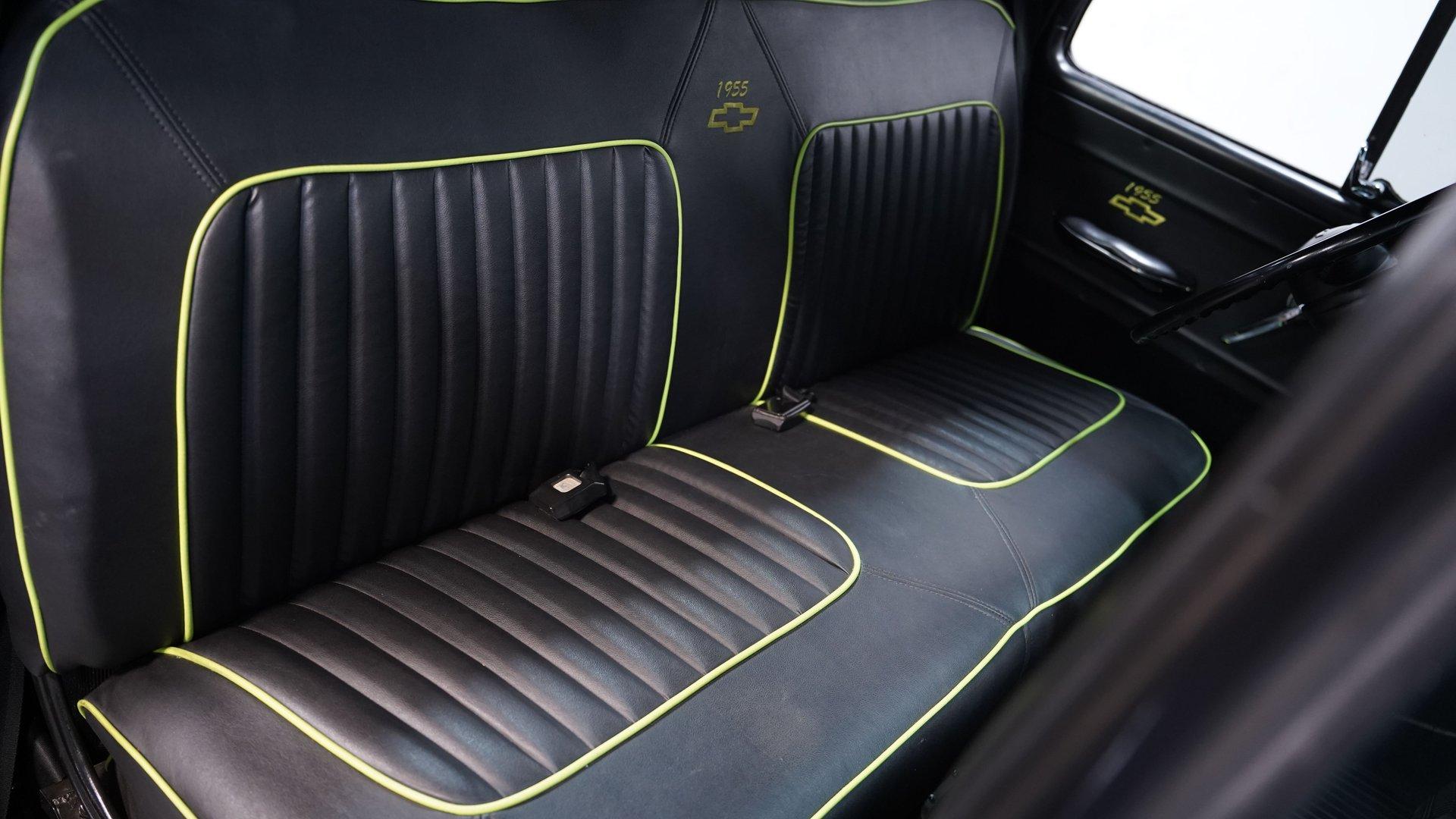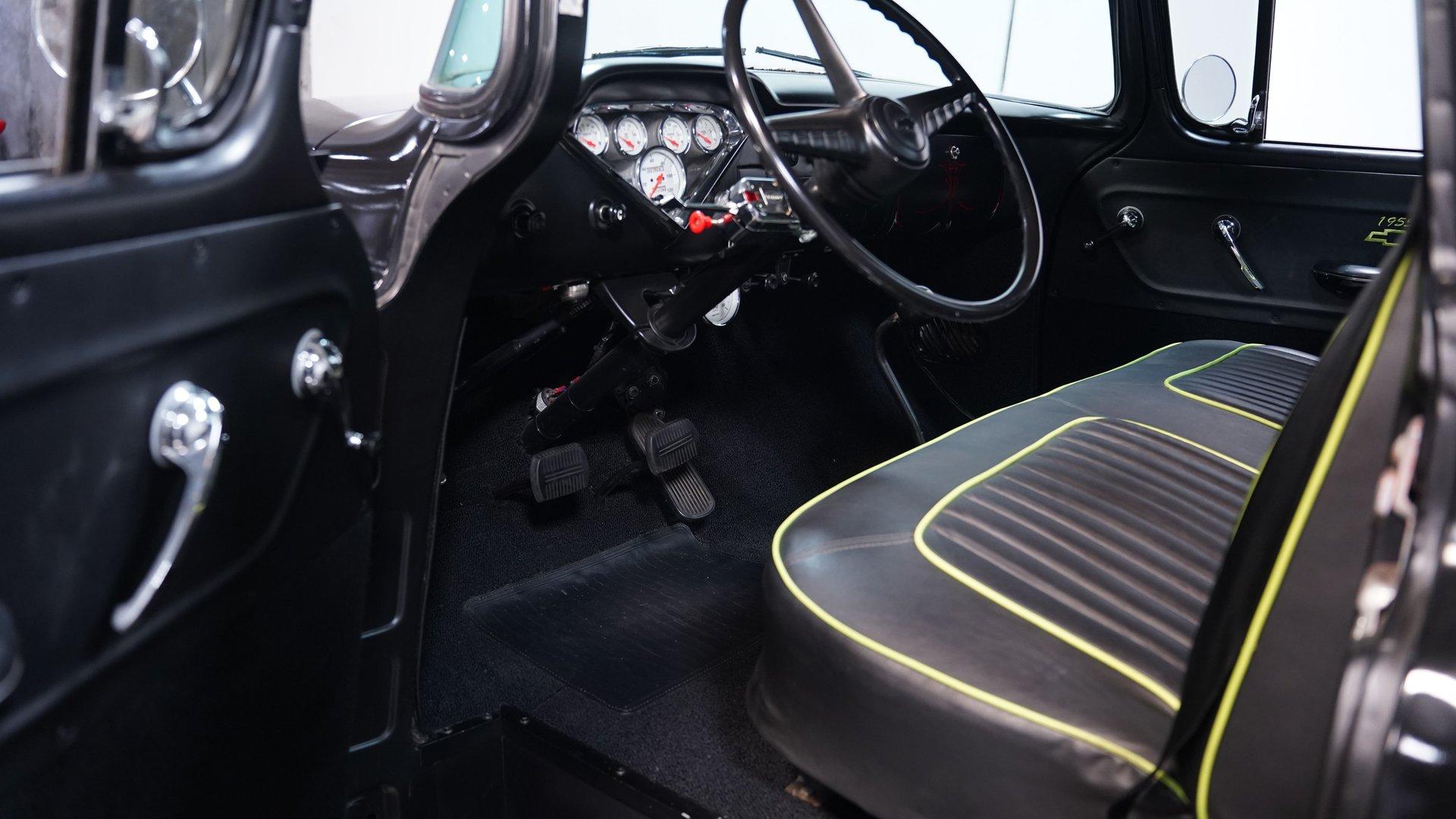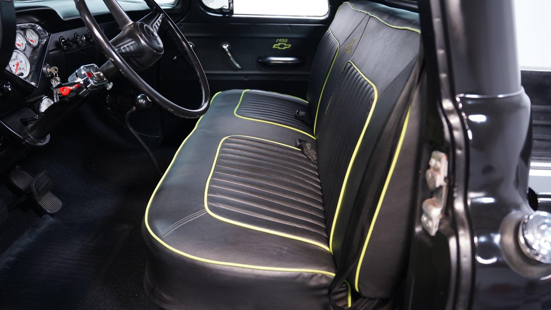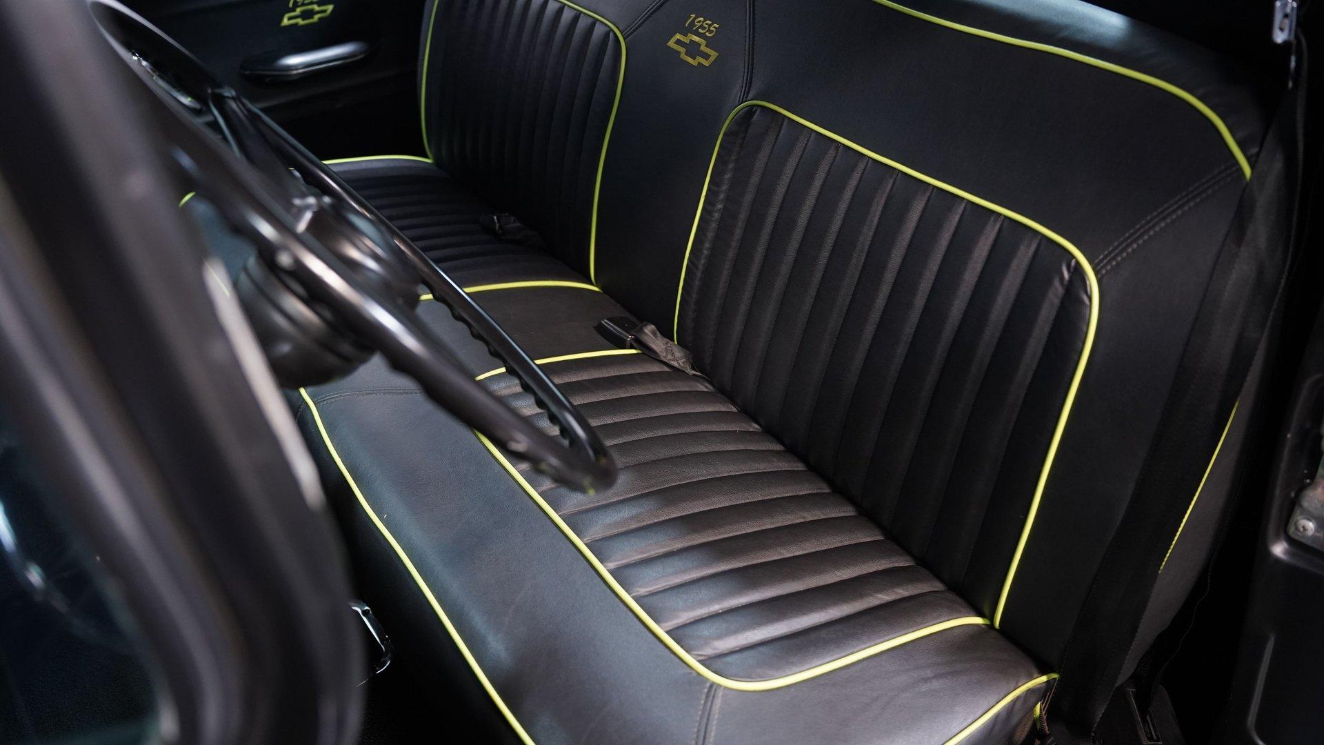 Step inside, and you'll discover a cabin that thoughtfully blends classic design with updated touches. The reupholstered bench seat and door panels, accented with bright yellow highlights and ''1955'' embroidery, offer comfort and personality. The headliner and interior trim show careful attention to detail, while Autometer gauges and a Kenwood head unit tucked behind the dash provide modern convenience without sacrificing vintage appeal. The long shifter handle with an iconic 8-ball knob adds a playful finishing touch to this inviting interior.