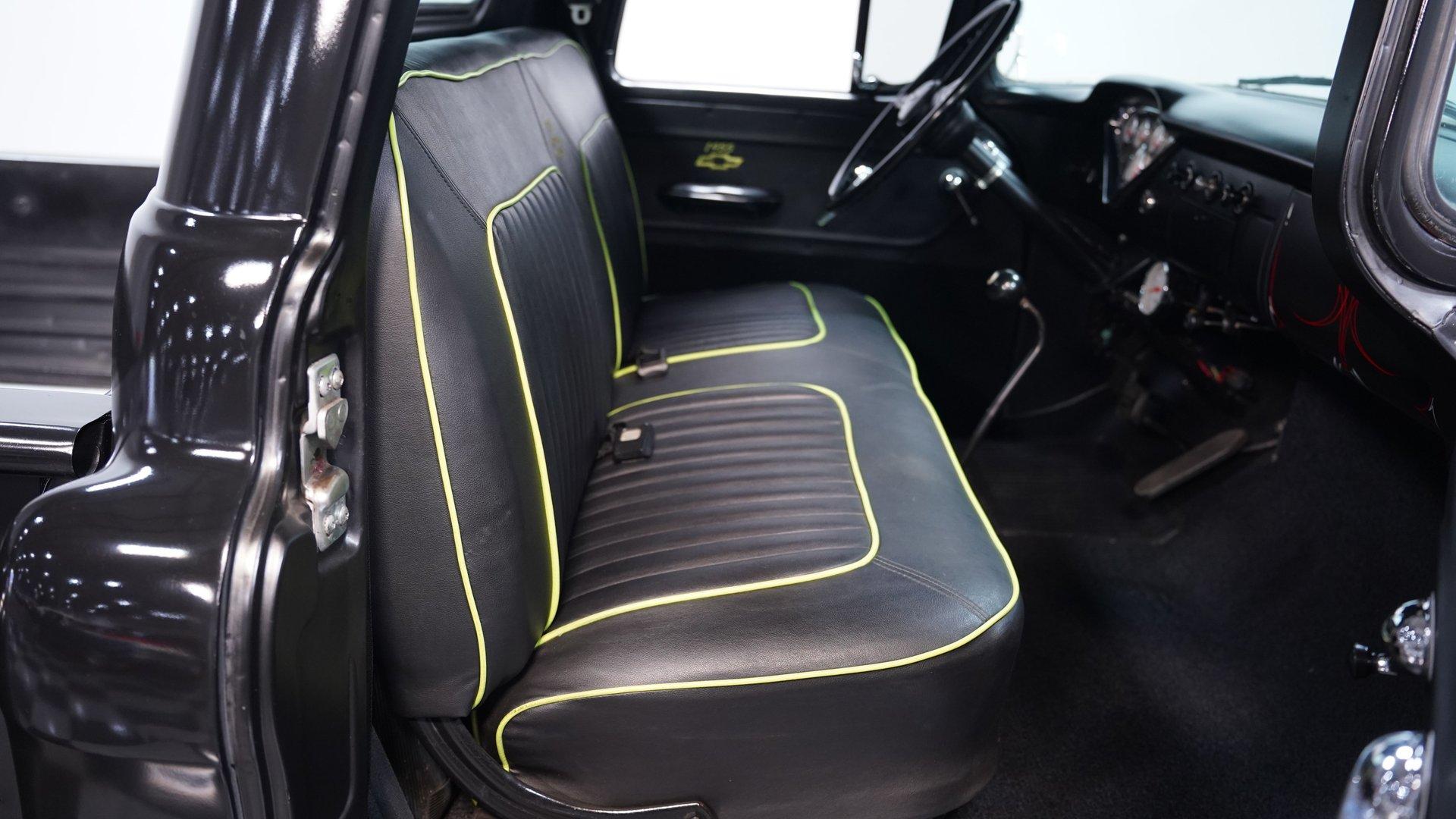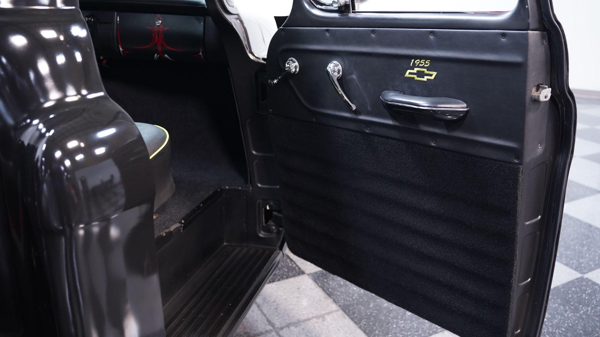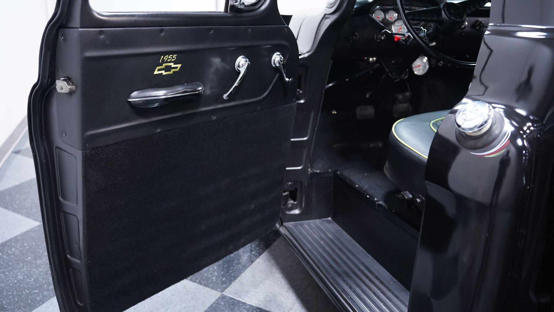 Step inside, and you'll discover a cabin that thoughtfully blends classic design with updated touches. The reupholstered bench seat and door panels, accented with bright yellow highlights and ''1955'' embroidery, offer comfort and personality. The headliner and interior trim show careful attention to detail, while Autometer gauges and a Kenwood head unit tucked behind the dash provide modern convenience without sacrificing vintage appeal. The long shifter handle with an iconic 8-ball knob adds a playful finishing touch to this inviting interior.