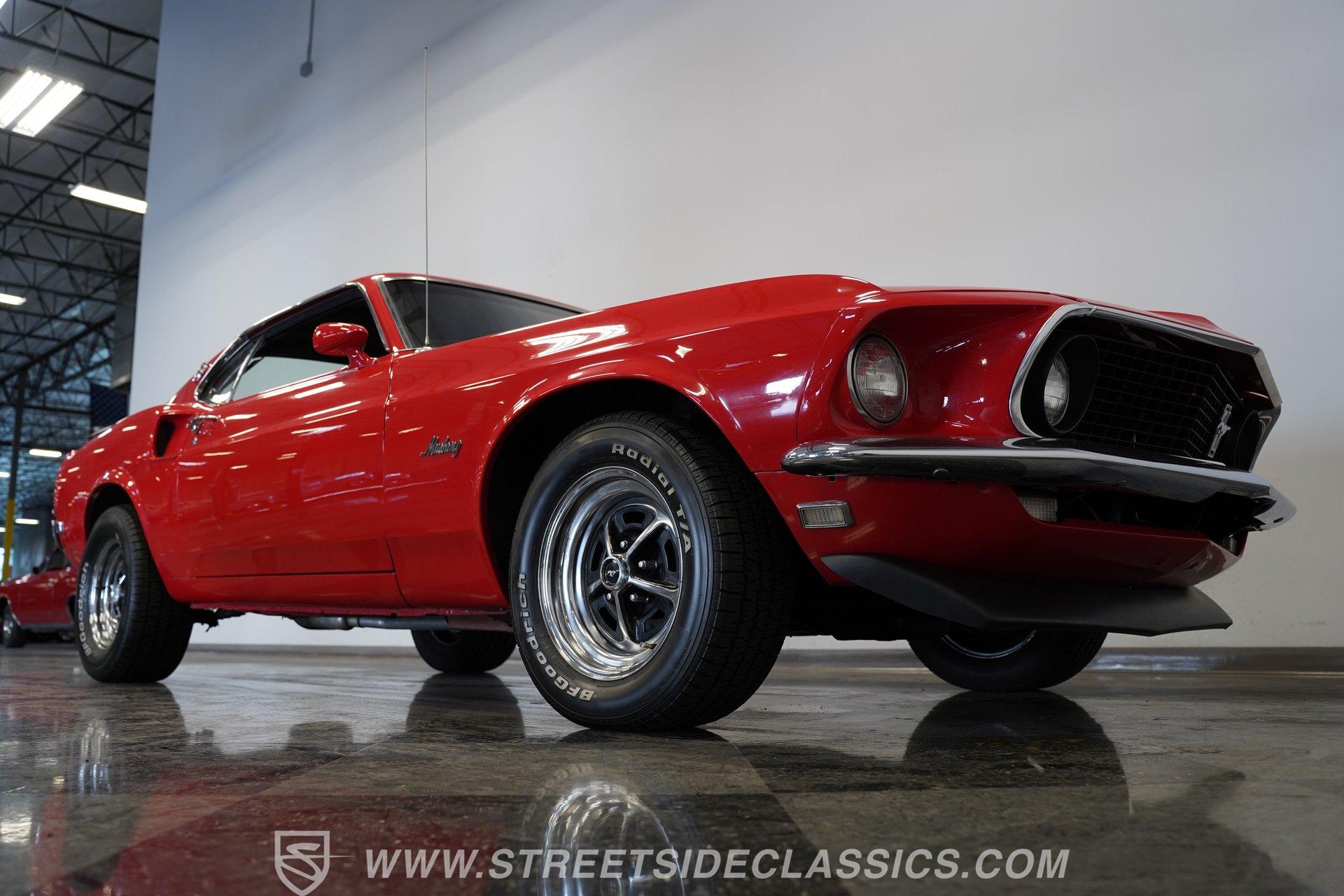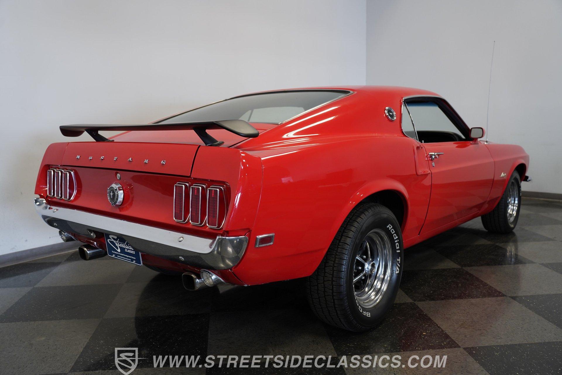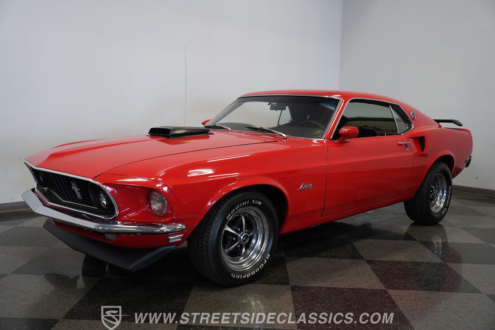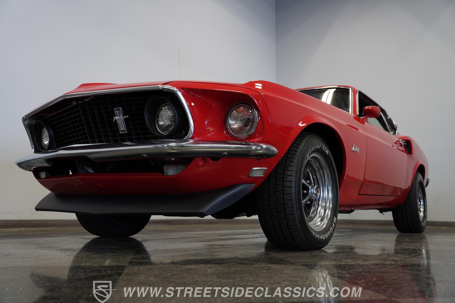 If a candy red classic has always been on your list, here's a top-of-the-line example. This 1969 Ford Mustang Fastback looks as good as it runs. Up front, a Shaker hood with full assembly rises above a clean grille and a bright bumper, featuring clear headlights and a lower black front spoiler that completes the aggressive look. Out back, the Mach 1–style rear spoiler, correct taillights, solid bumper, and dual exhaust carry the theme. Along both sides, the fenders, doors, and quarter panels, featuring signature side scoops, show well with only light wear from enjoying the car. Everything ties together perfectly with the classic Magnum 500 wheels.