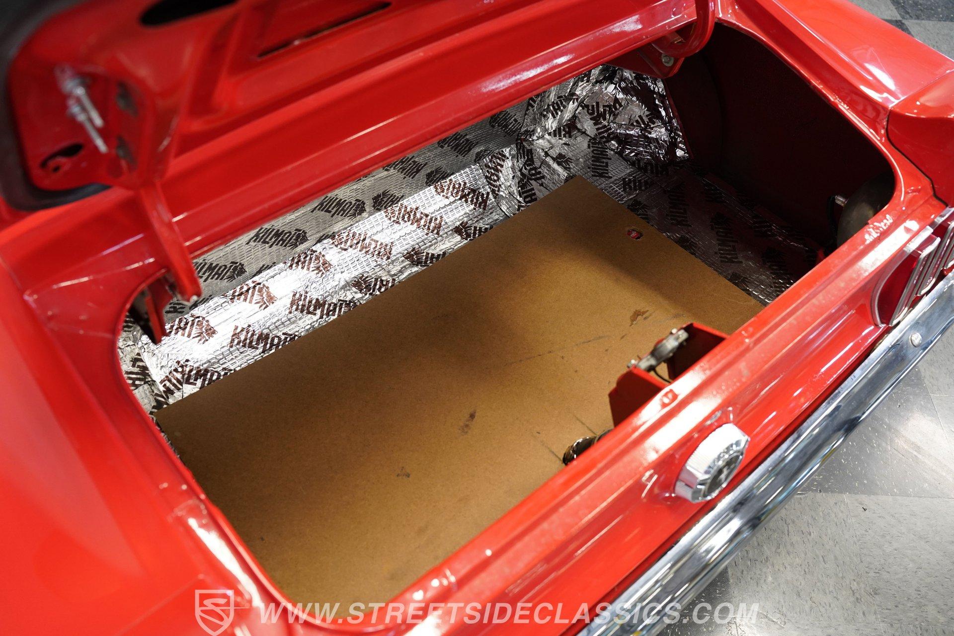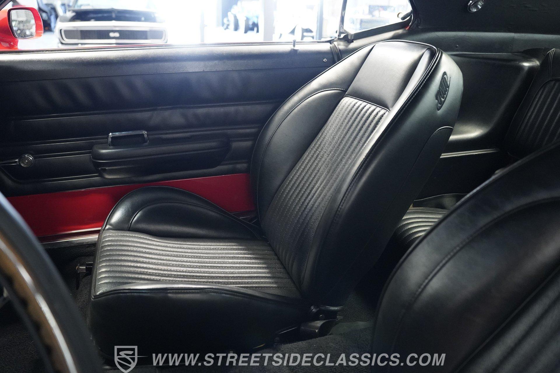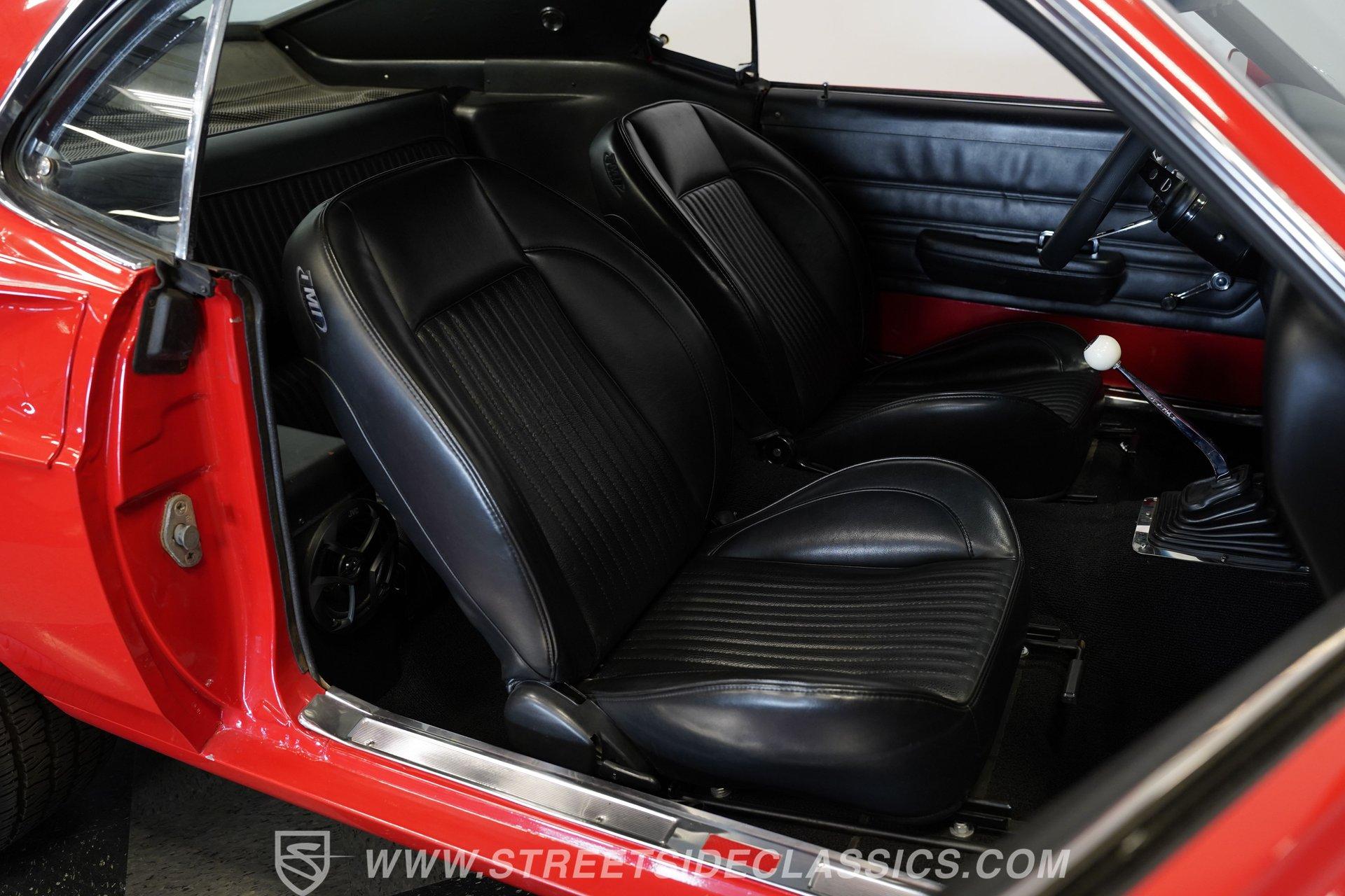 Inside, the black-on-black interior presents nicely. The front seats are aftermarket TMI bucket seats, paired with a Hurst floor-mounted shifter for quick, easy gear changes. The dashboard is in good condition, and the gauge cluster retains a factory-style layout that appears to use original gauges. An aftermarket steering wheel and premium steering components from CJ Pony Parts complement the upgraded, stock-appearing radio. Below that, the factory climate controls operate a full Classic Auto Air system while retaining the original control panel look. The headliner, carpets, and door panels are all in good condition. The door jambs and sill plates are clean, and the trunk appears to be lined with sound-deadening material and is tidy throughout.