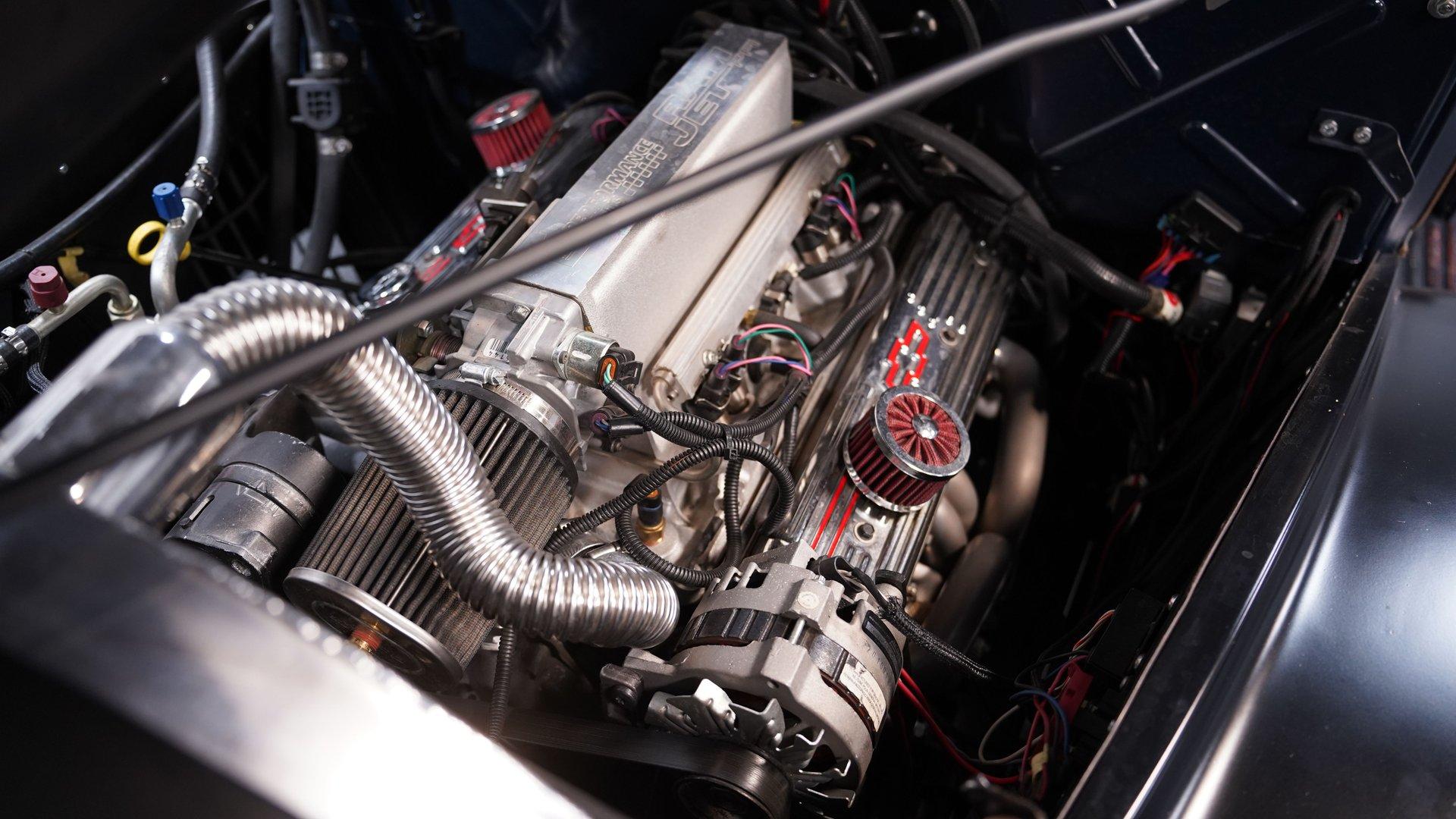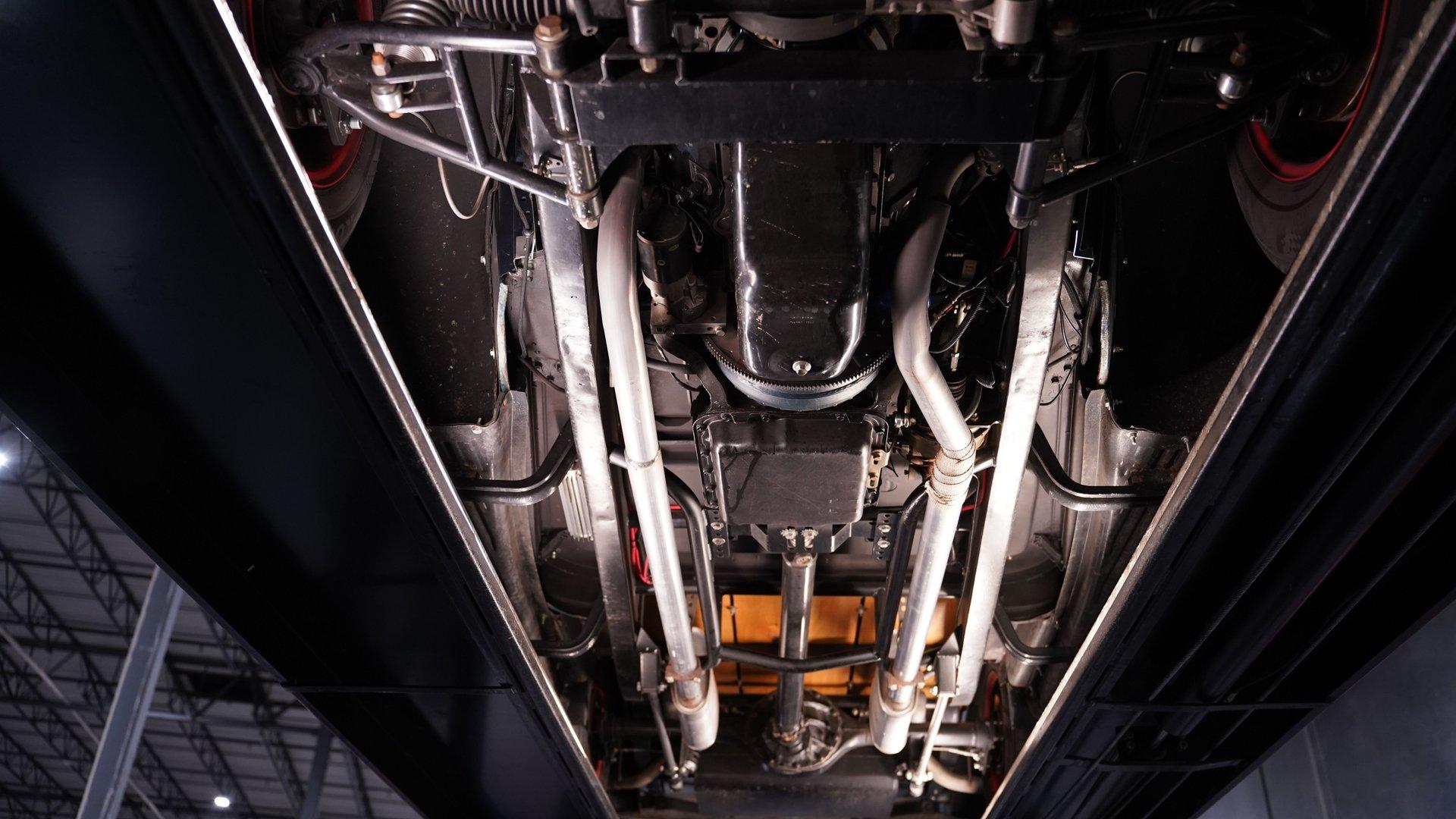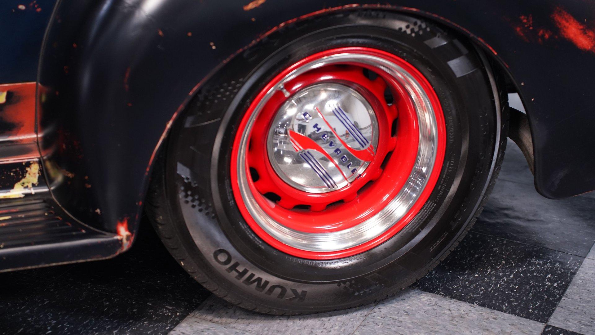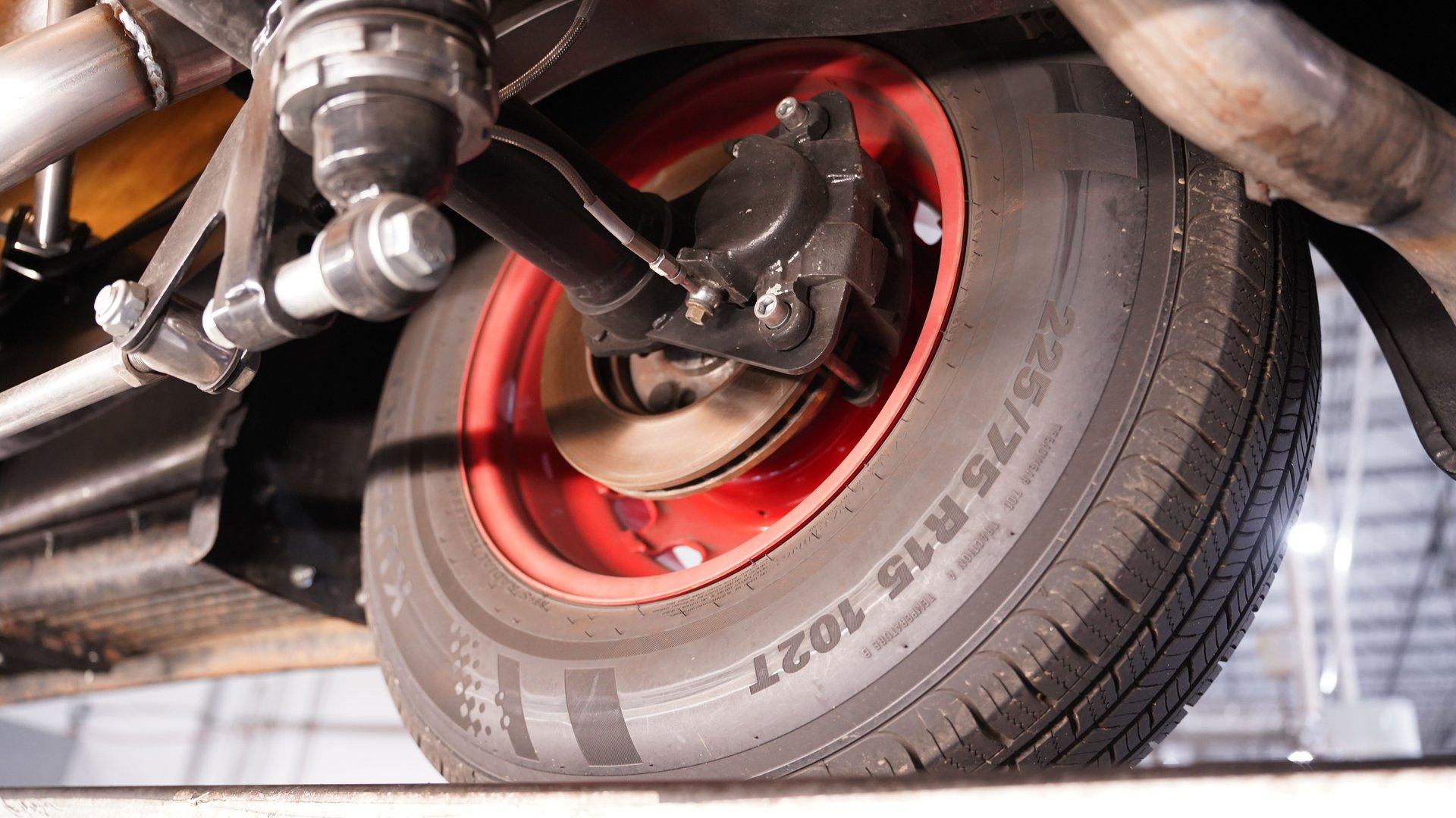 Under the hood, the engine bay is clean and well-presented. A fuel-injected 350 cubic-inch Ramjet V8 provides the power, kept cool by an aluminum radiator with an electric fan. The Ramjet is paired with a 700R4 four-speed automatic transmission that sends power to the factory rear end. Up front, a custom suspension setup includes control arms and coilovers. The rear suspension uses a rigid axle with coilovers and a two-link frame tie setup. Fifteen-inch red wheels with beauty rings and moon hub caps sit at all four corners, wrapped in 205/75R15 front and 225/75R15 rear tires. Power disc brakes at both ends provide confident stopping, while shorty headers feed into a dual exhaust system with aftermarket mufflers.