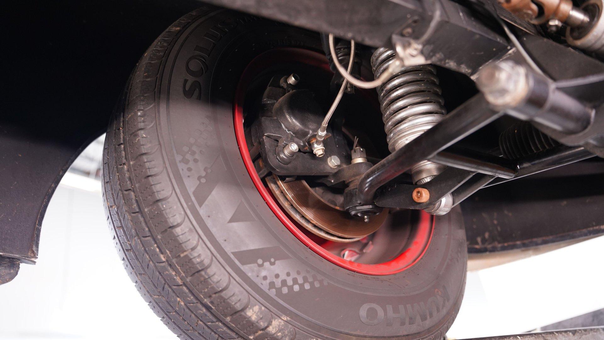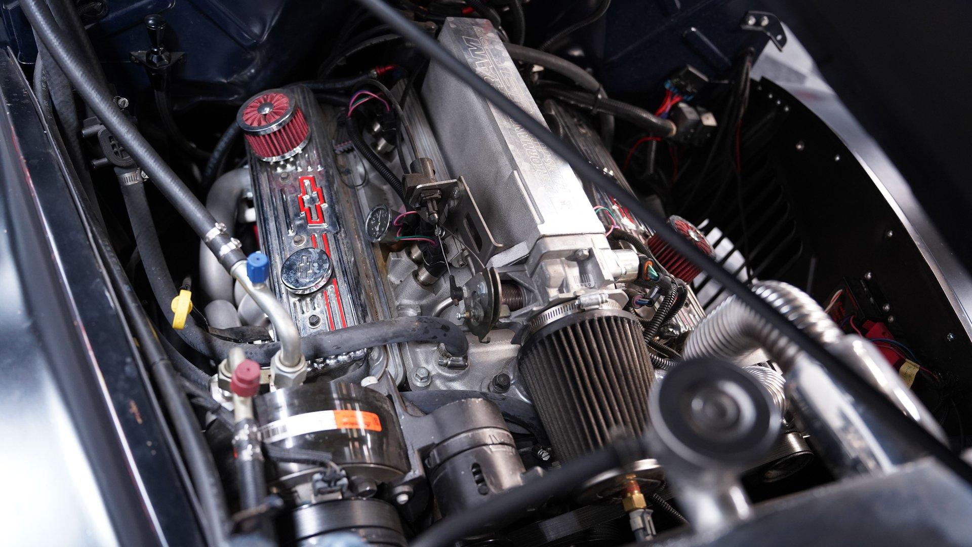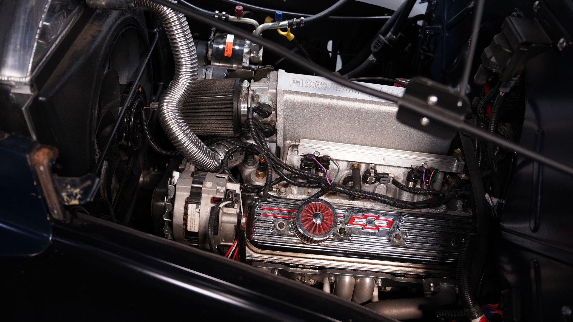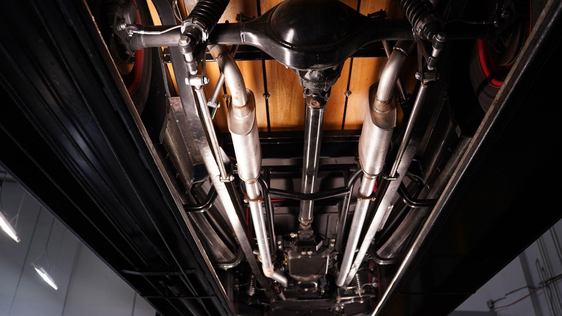 Under the hood, the engine bay is clean and well-presented. A fuel-injected 350 cubic-inch Ramjet V8 provides the power, kept cool by an aluminum radiator with an electric fan. The Ramjet is paired with a 700R4 four-speed automatic transmission that sends power to the factory rear end. Up front, a custom suspension setup includes control arms and coilovers. The rear suspension uses a rigid axle with coilovers and a two-link frame tie setup. Fifteen-inch red wheels with beauty rings and moon hub caps sit at all four corners, wrapped in 205/75R15 front and 225/75R15 rear tires. Power disc brakes at both ends provide confident stopping, while shorty headers feed into a dual exhaust system with aftermarket mufflers.