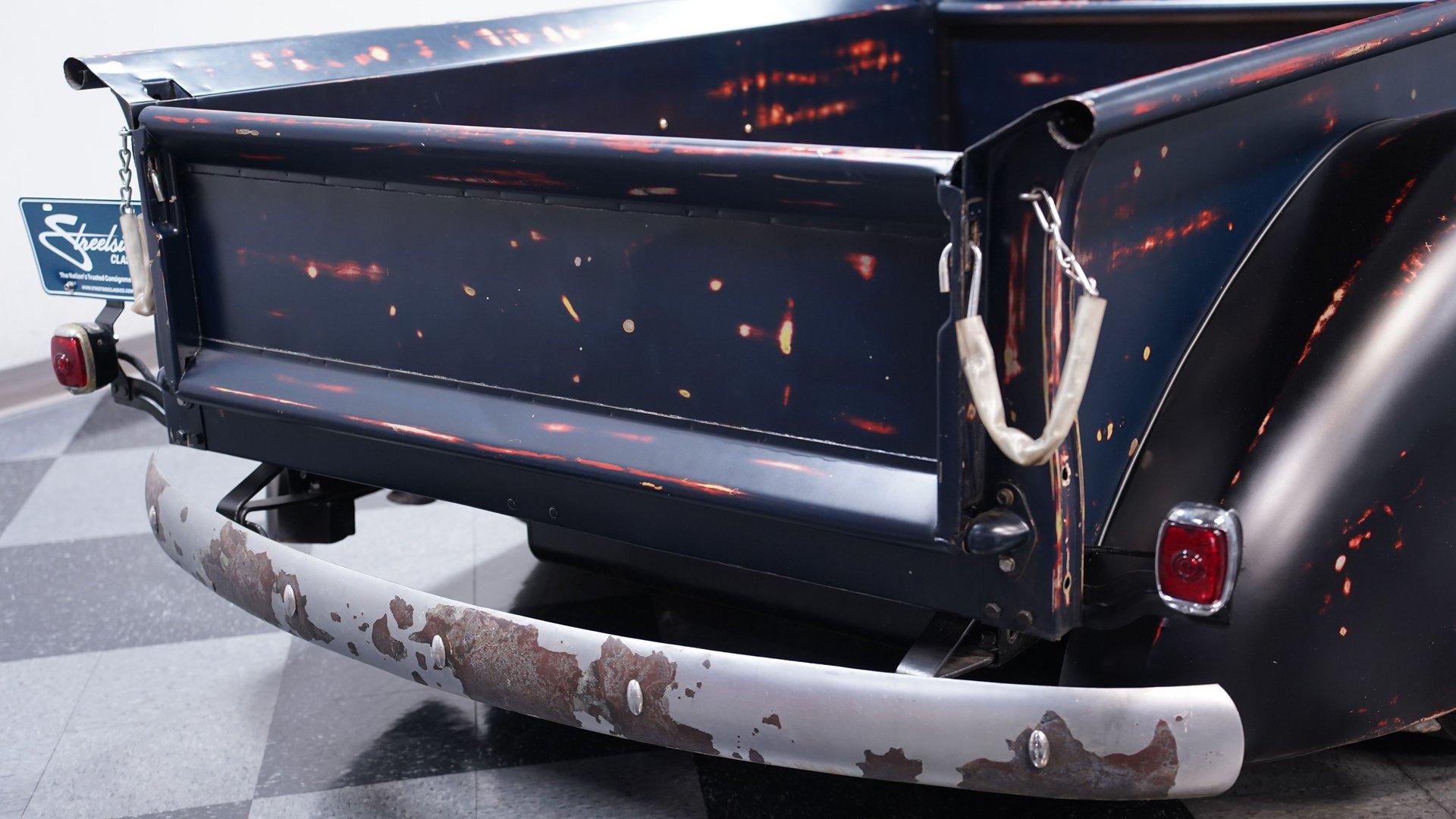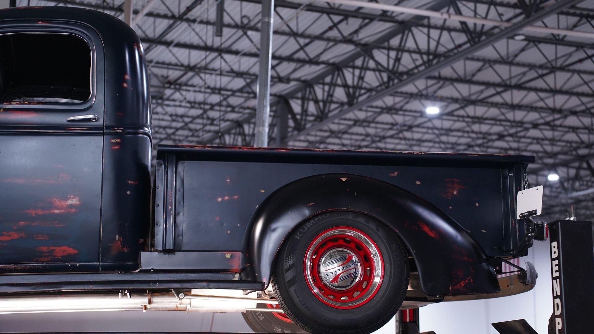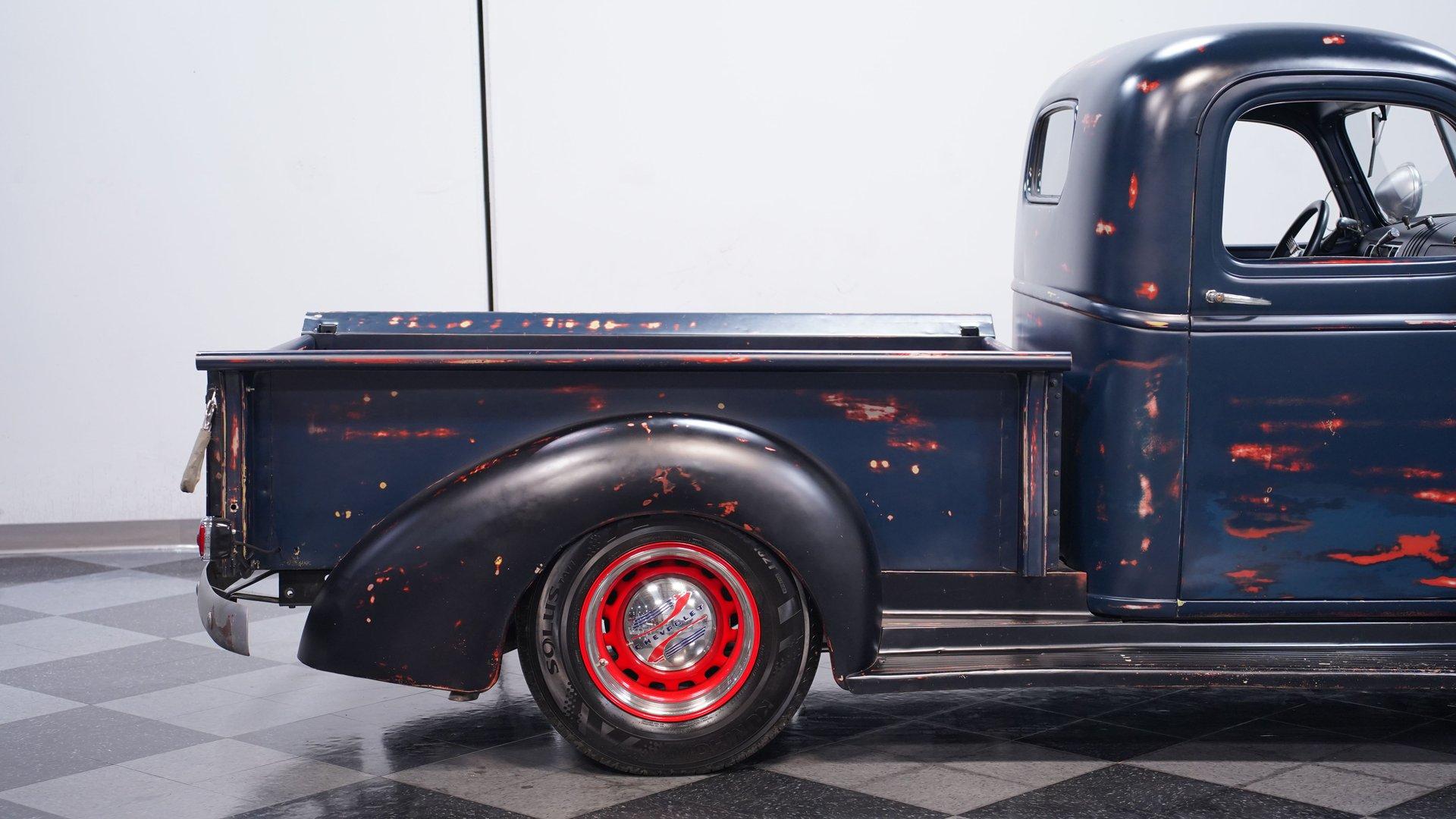 This 1941 Chevrolet Pickup Patina Restomod wears blue paint with red scrapes that give it a genuine work-truck vibe. The look is perfectly complemented by very clean red wheels with beauty rings and moon hub caps. Up front, the chrome bumper and what used to be a clean grille still present well, while LED headlights and front marker lights add modern visibility. The rear bumper shows its age, but it is mounted to a sturdy frame. The side steps may look a little sketchy, yet they are solidly attached to the fenders and ready to do their job. Out back, the truck bed features a beautiful wooden plank setup that adds a nice contrast to the patina exterior. What looks like an old farm truck is actually a solid restomod hiding in plain sight.