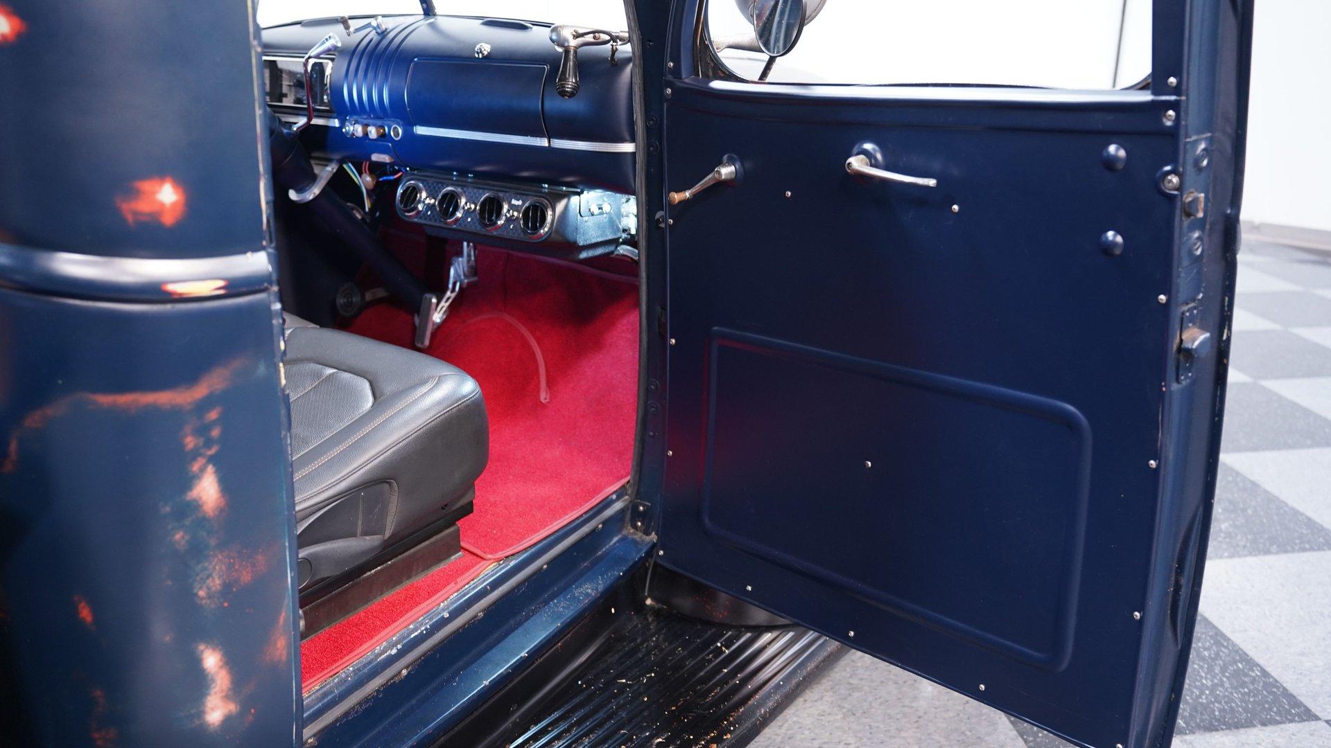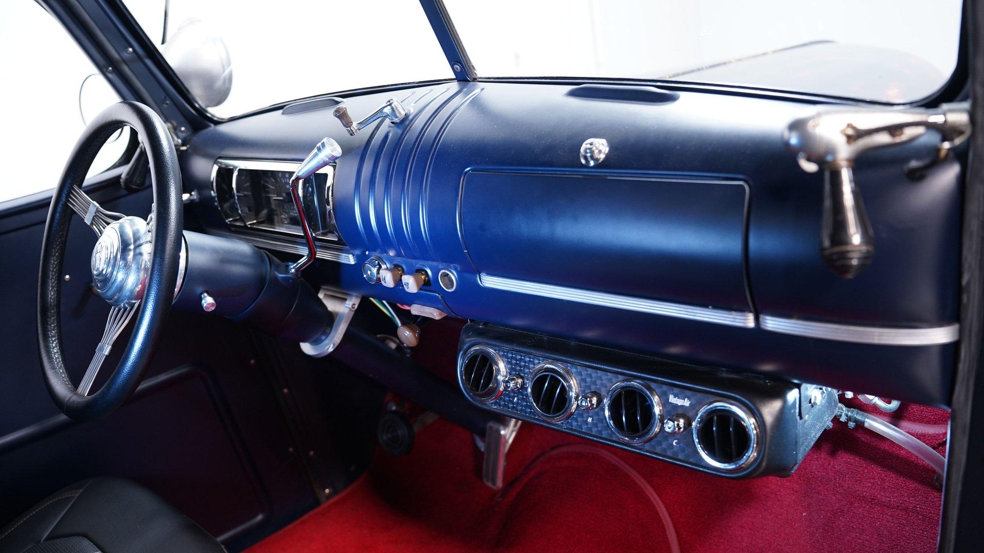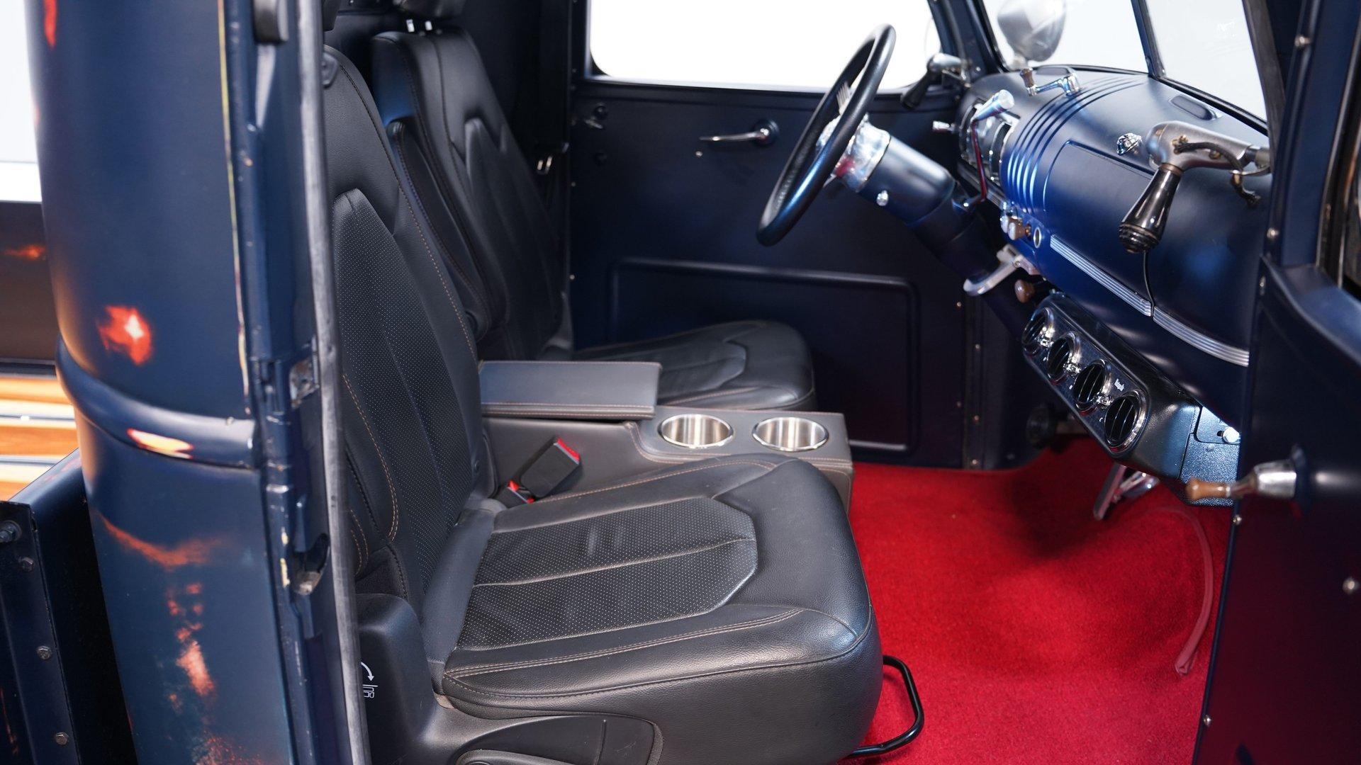 Inside, the story changes completely. The cabin features two newer bucket seats separated by a custom center console with built-in cup holders. A custom steering wheel sits on a tilt column ahead of a Dakota gauge cluster, while Vintage Air controls manage the climate settings. The red carpet and headliner are both in good condition, and much of the interior, including the door panels and dashboard, is painted blue to match the exterior. Functional spotlights mounted on both sides of the truck can be controlled from inside the cab. This interior truly feels like night and day compared to the rugged exterior.