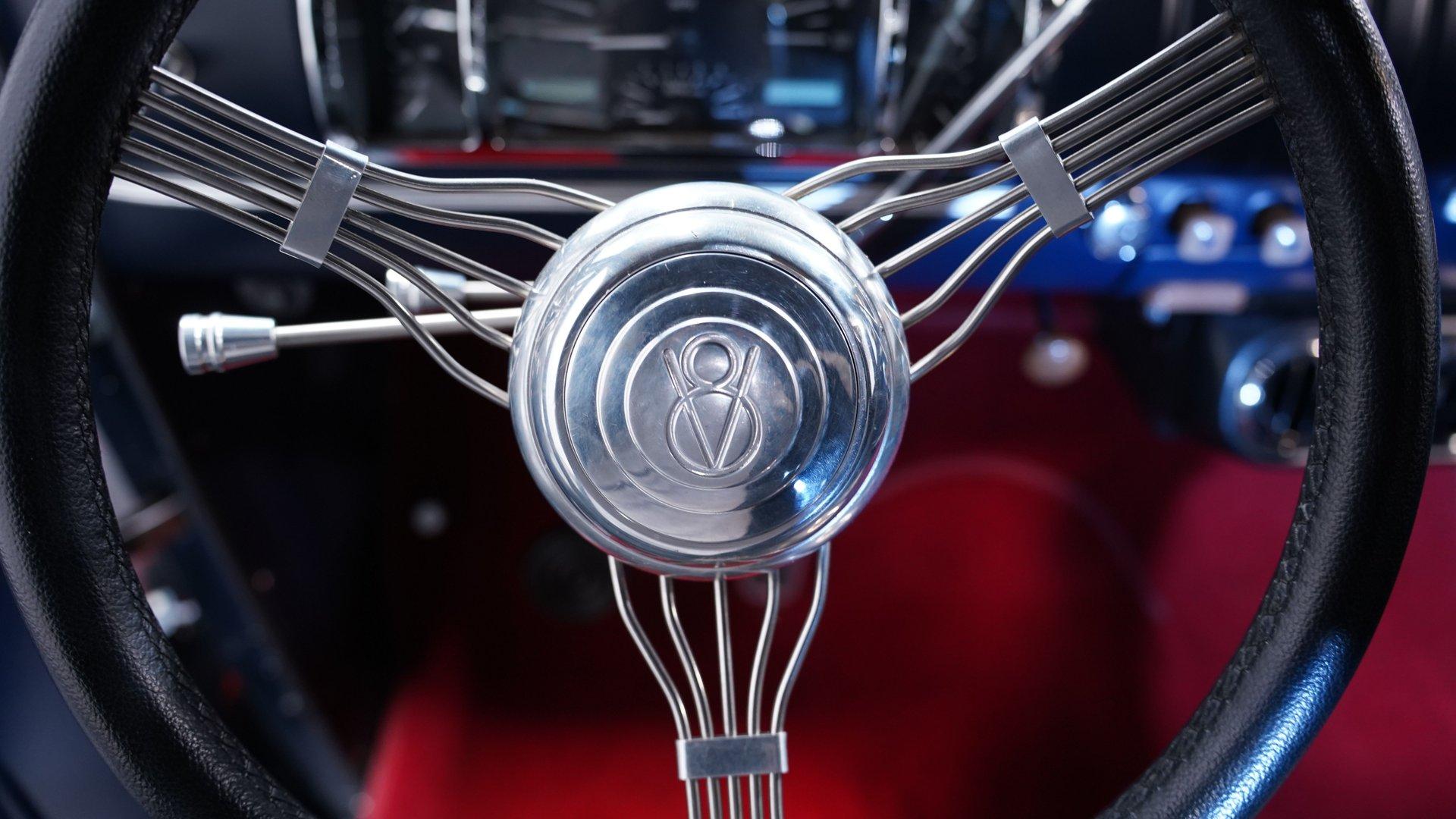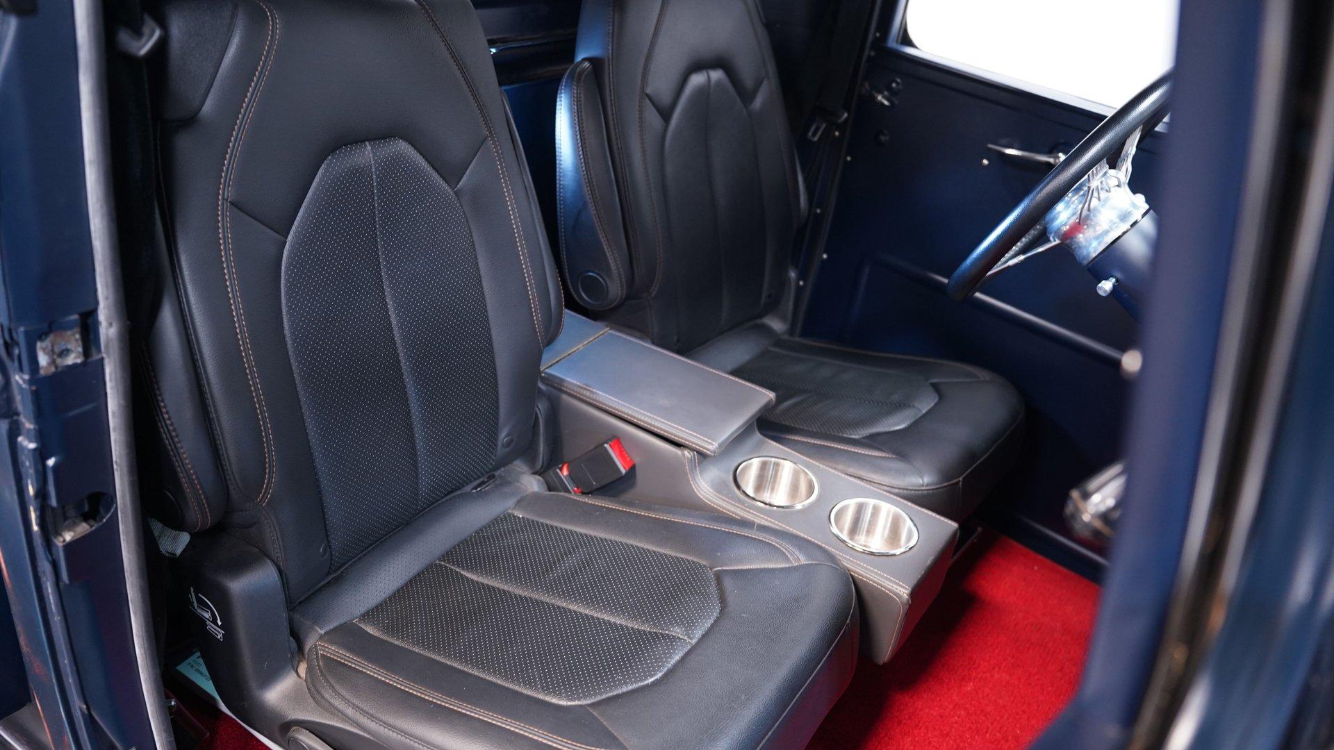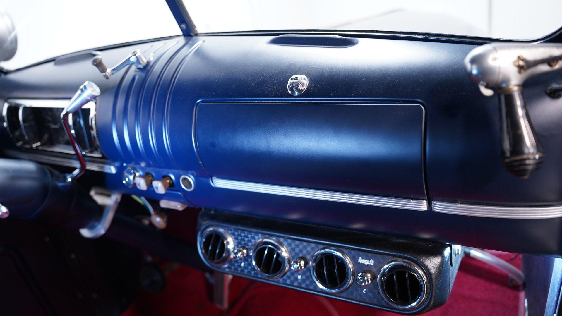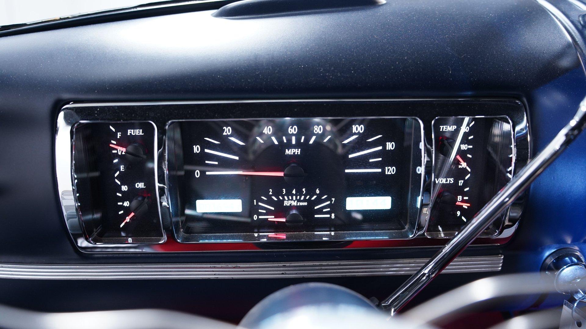 Inside, the story changes completely. The cabin features two newer bucket seats separated by a custom center console with built-in cup holders. A custom steering wheel sits on a tilt column ahead of a Dakota gauge cluster, while Vintage Air controls manage the climate settings. The red carpet and headliner are both in good condition, and much of the interior, including the door panels and dashboard, is painted blue to match the exterior. Functional spotlights mounted on both sides of the truck can be controlled from inside the cab. This interior truly feels like night and day compared to the rugged exterior.