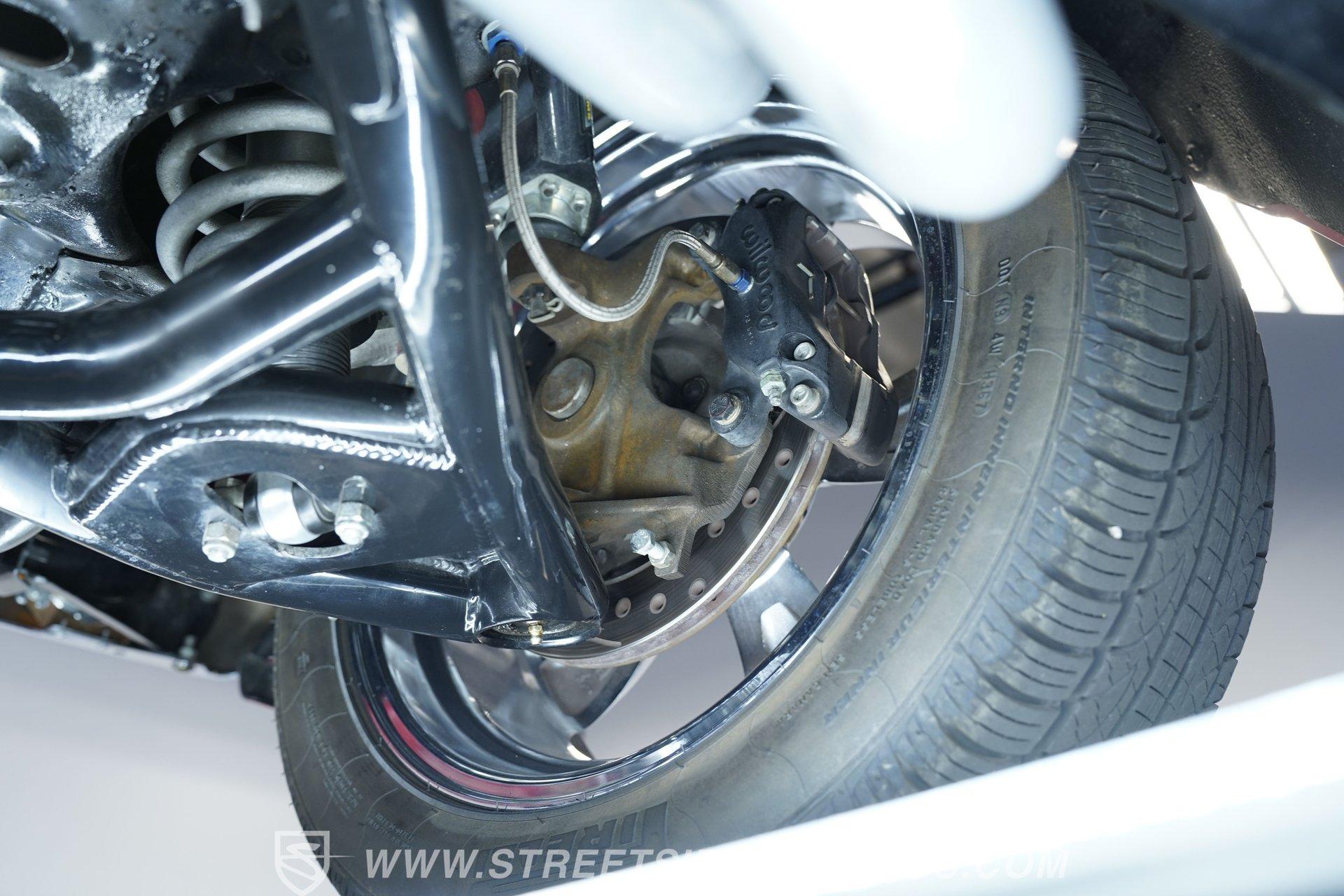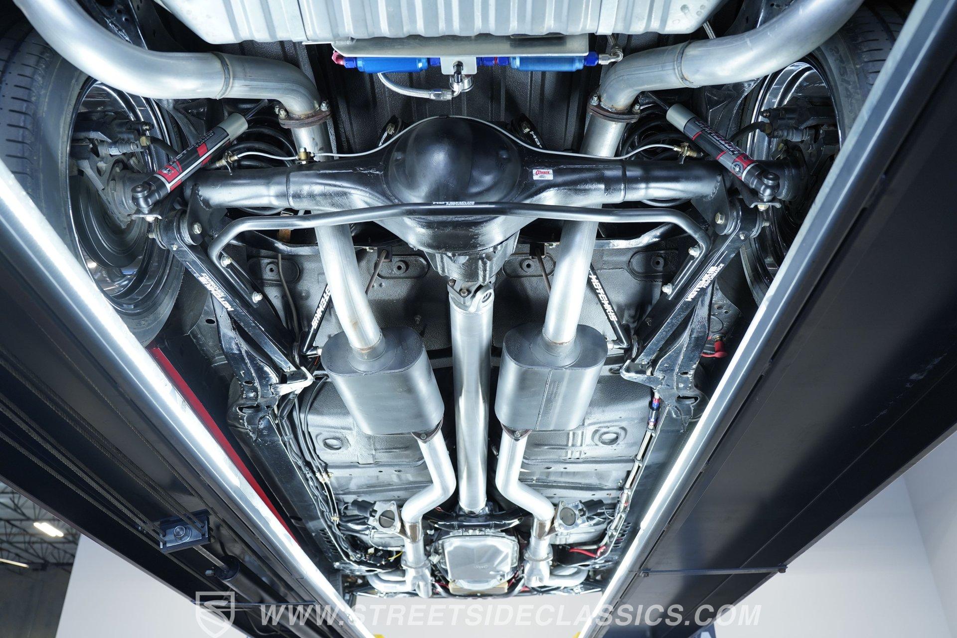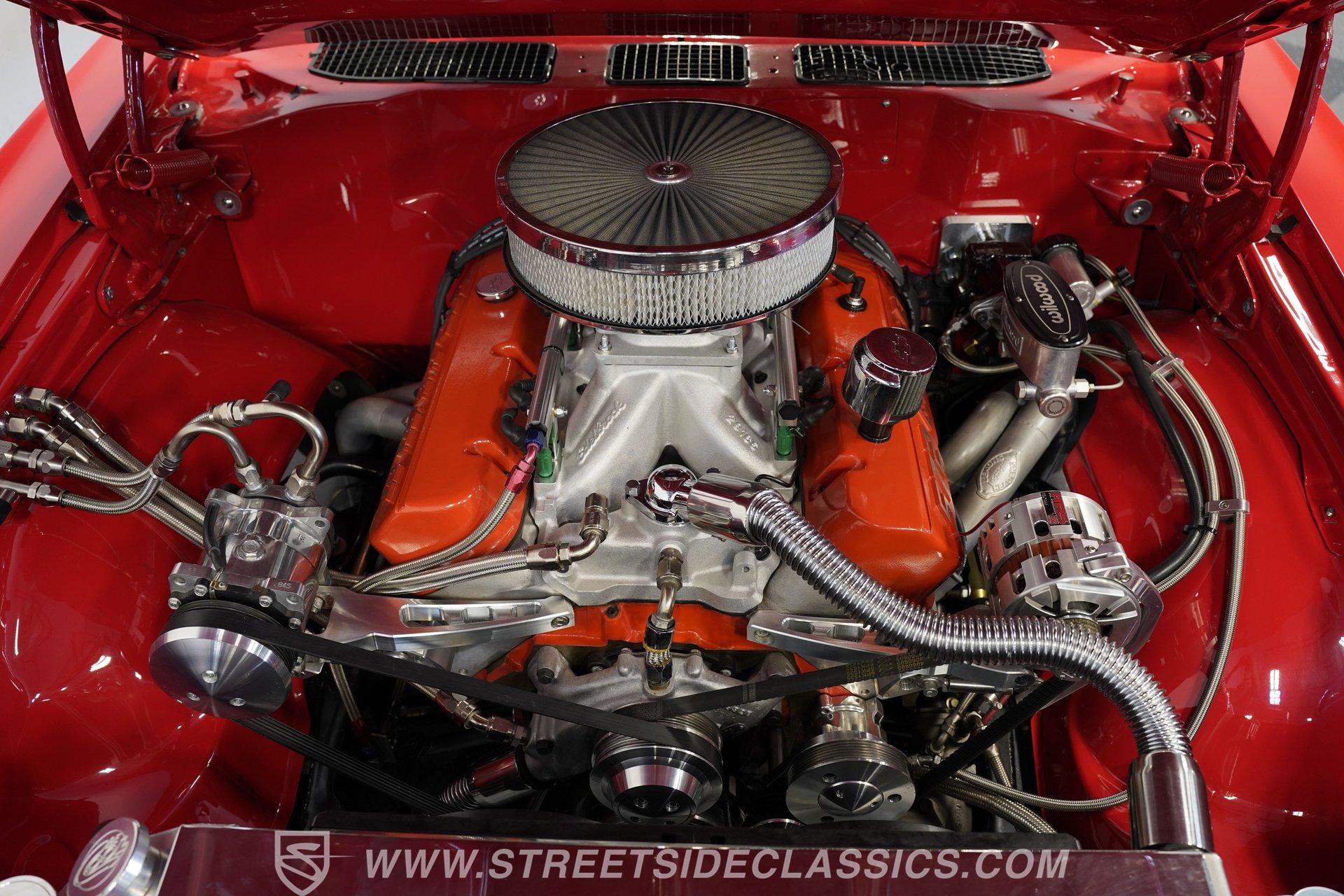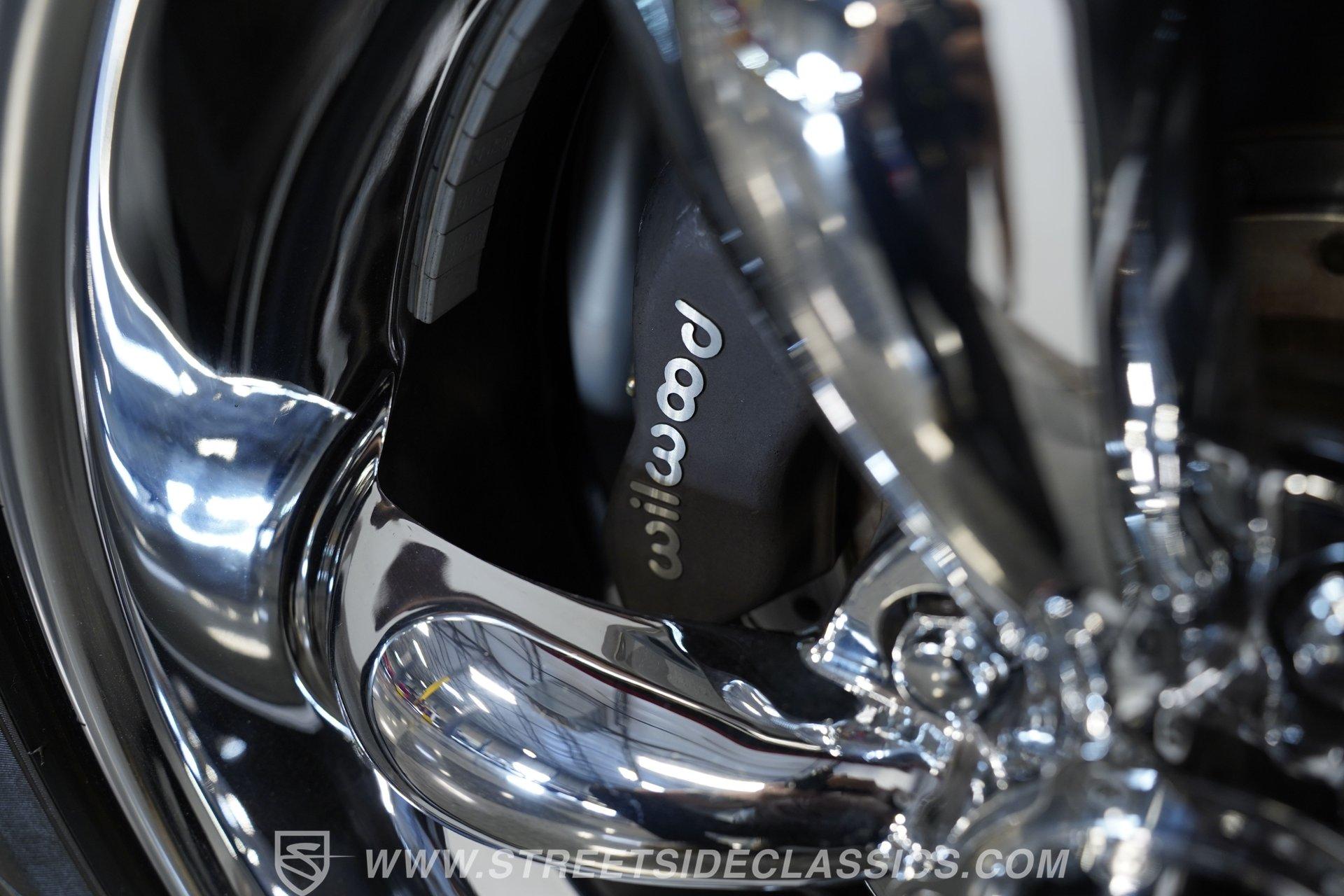 Raise that super-sized cowl induction hood, and you'll find an expansive 572-cubic-inch V8 sitting front and center in a very well-organized bay, surrounded by plenty of chrome components to offer additional eye candy. Equipped with aluminum heads and a performance cam, and fed by multi-point fuel injection, this engine is an absolute monster that's anchored by a ''Bowtie'' racing block specifically designed to handle its elite output. The accompanying 4-speed automatic 4L80E transmission is equipped with a Fast TCI transmission controller for shift point adjustability, and includes an overdrive gear to keep revs down at highway speeds. And you can only imagine the looks you'll get as you pass other motorists behind the wheel of this stellar, restomodded classic. Global West tubular upper and lower control arms at both ends give this Chevy a refined ride with plenty of adjustability, while four-wheel power disc brakes that feature drilled and slotted front rotors provide plenty of fade resistant stopping ability.