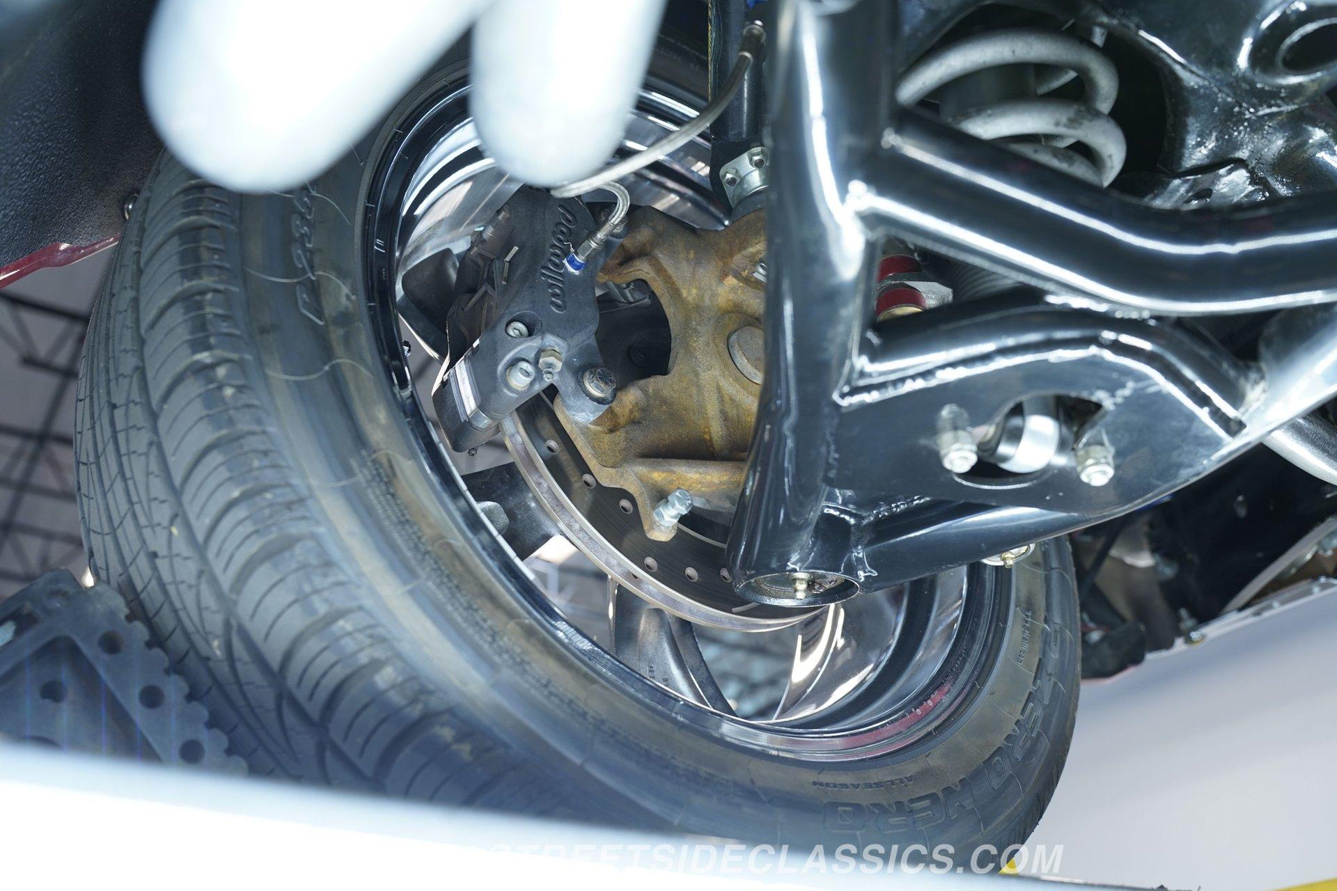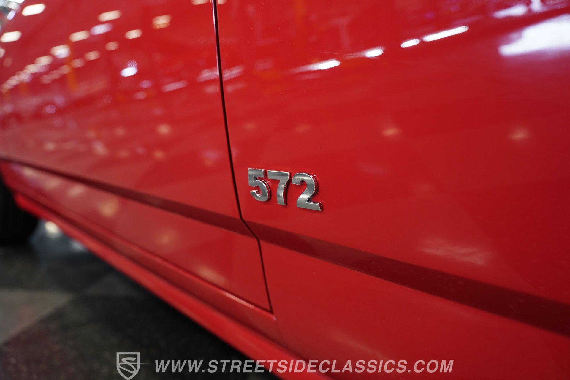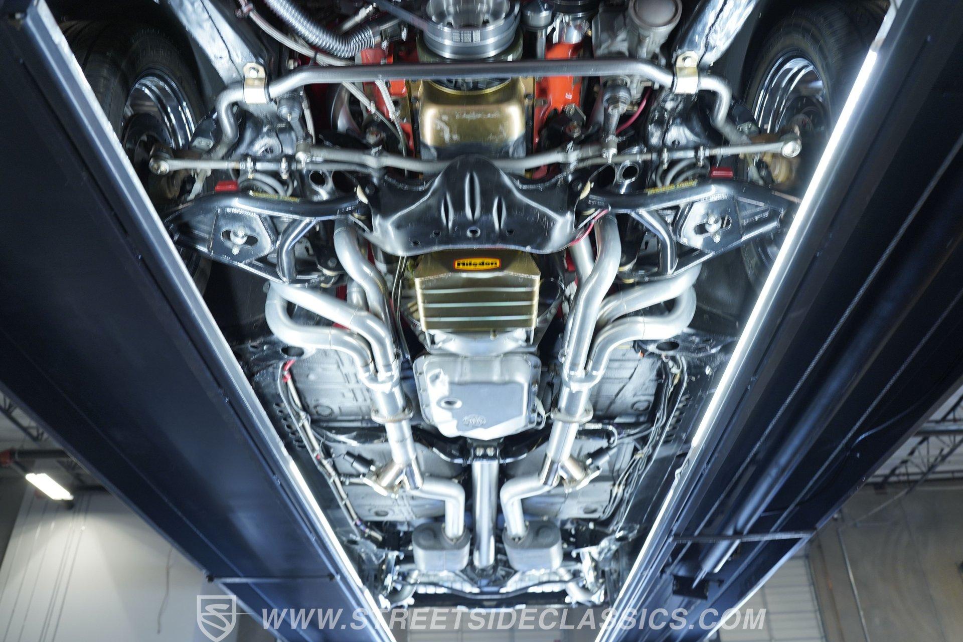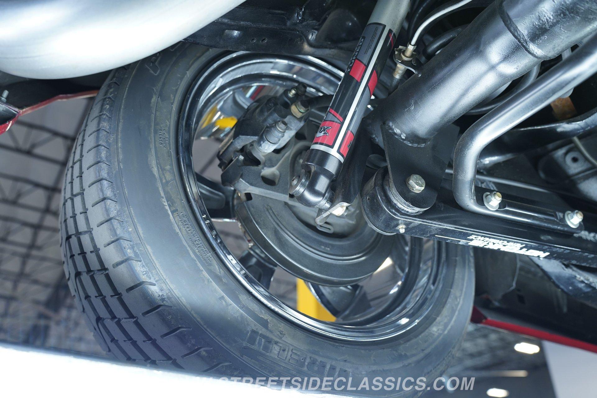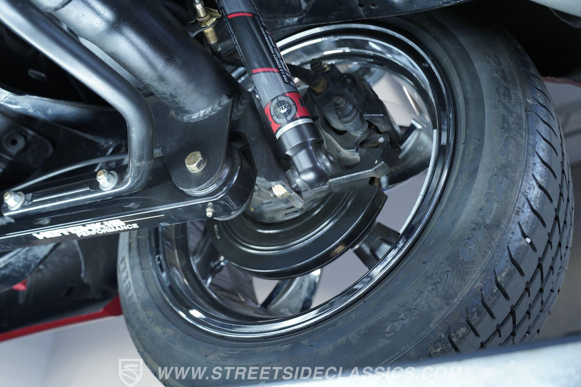 Raise that super-sized cowl induction hood, and you'll find an expansive 572-cubic-inch V8 sitting front and center in a very well-organized bay, surrounded by plenty of chrome components to offer additional eye candy. Equipped with aluminum heads and a performance cam, and fed by multi-point fuel injection, this engine is an absolute monster that's anchored by a ''Bowtie'' racing block specifically designed to handle its elite output. The accompanying 4-speed automatic 4L80E transmission is equipped with a Fast TCI transmission controller for shift point adjustability, and includes an overdrive gear to keep revs down at highway speeds. And you can only imagine the looks you'll get as you pass other motorists behind the wheel of this stellar, restomodded classic. Global West tubular upper and lower control arms at both ends give this Chevy a refined ride with plenty of adjustability, while four-wheel power disc brakes that feature drilled and slotted front rotors provide plenty of fade resistant stopping ability.
