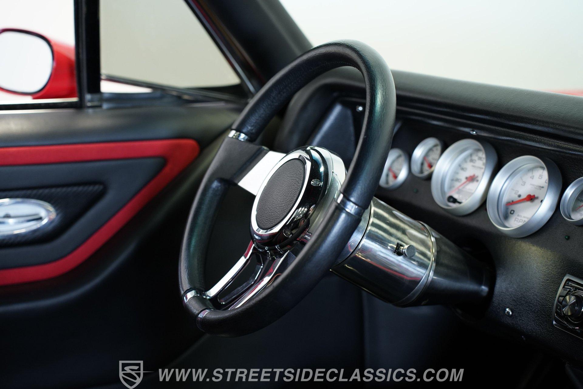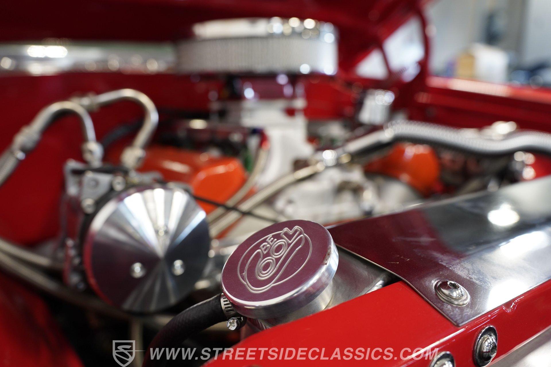 The custom black and red vinyl interior is in great shape throughout, with a pair of aftermarket bucket seats that straddle a center console that harbors the floor shifter, with a set of controls for the comfort and convenience items seamlessly incorporated, including the switch that moderates the exhaust cut outs that give this Chevy its one-of-a-kind sound. Pro Comp gauges provide an accurate read on vital motoring functions, and the added Vintage Air climate control system is in top form to keep you and your passengers comfortable throughout the year. You'll also enjoy a top-tier audio experience, with an Alpine AM/FM stereo with Bluetooth connectivity teaming with an assembly of custom-installed speakers to fill the cabin with sound.