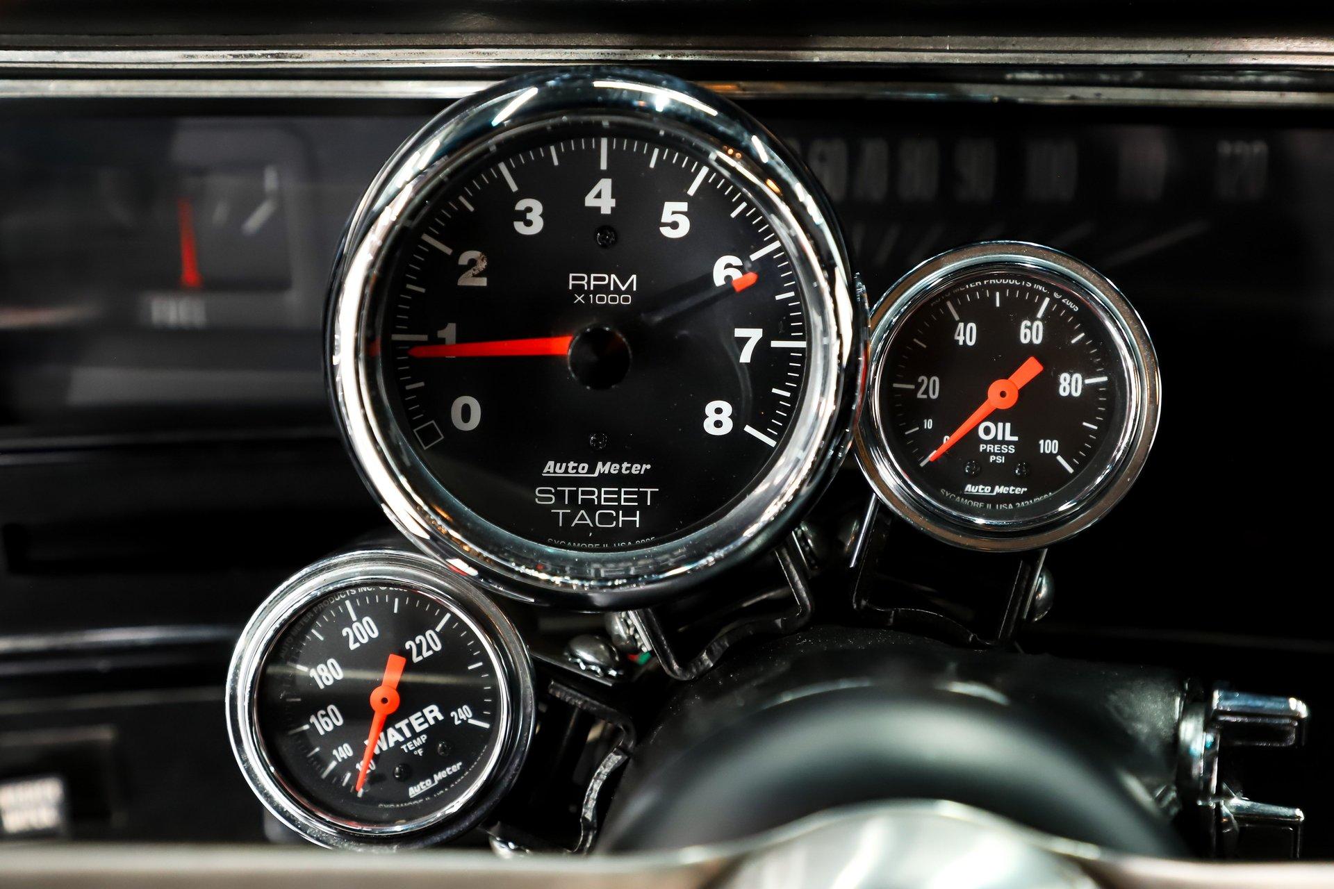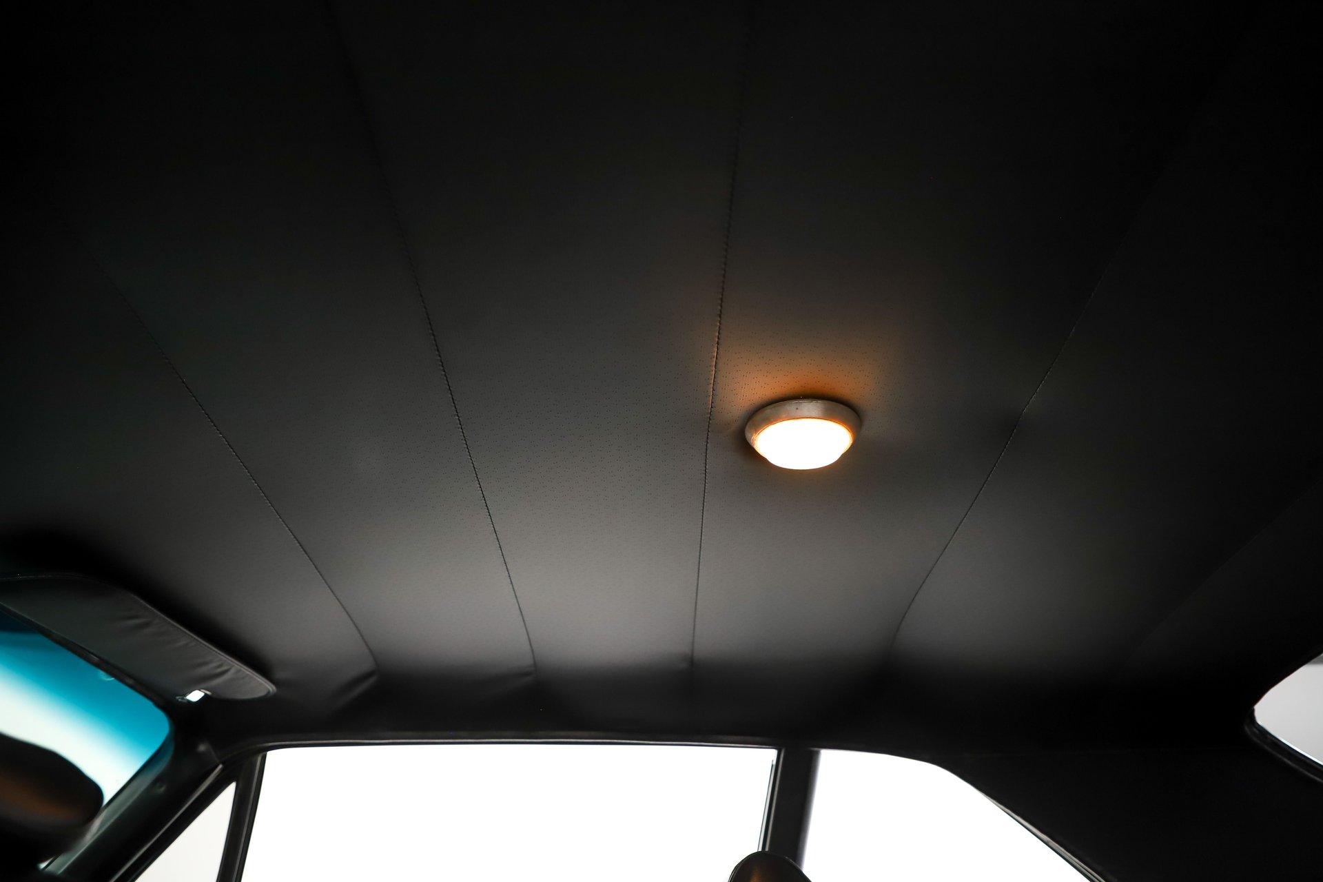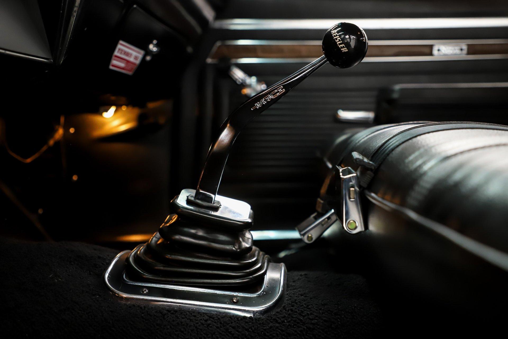 INTERIOR: It has been replaced for the most part. The seats have real good cushion and they've been reupholstered including the headrests. The door panels, armrests, window cranks have been replaced. In front of me is a new dash pad and Auto Meter tachometer, oil pressure and water temp gauges mounted to the column which has a walnut steering wheel. Down on the floor is real nice fitting carpet and a Hurst 5-speed shifter. The seat belts are new front and back. Up above the headliner and visors were replaced. The interior lights work.