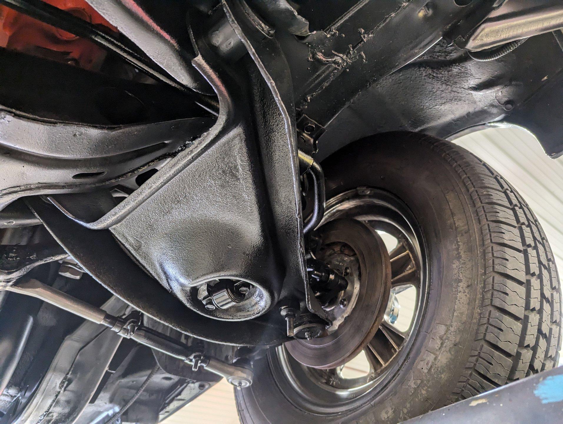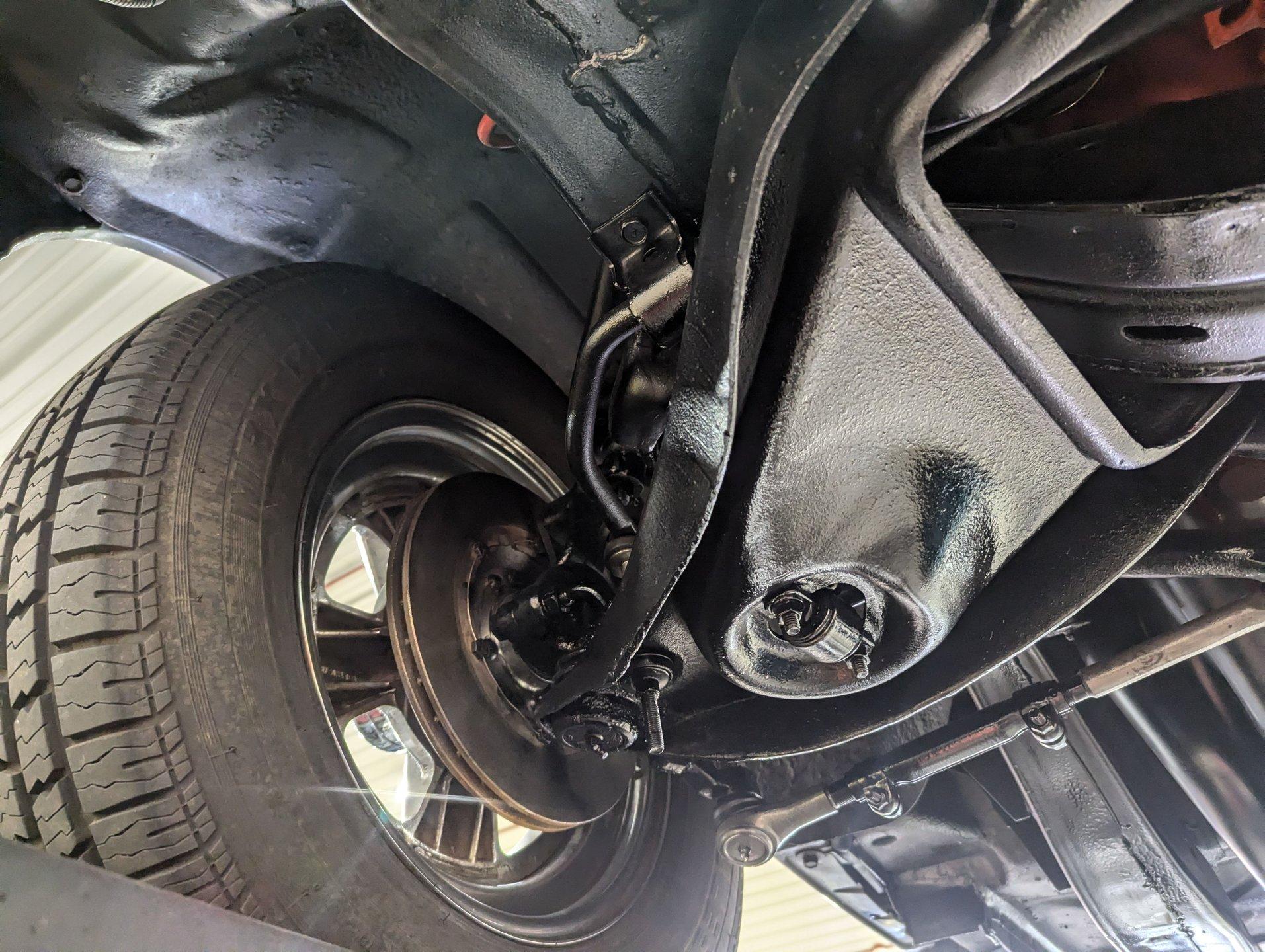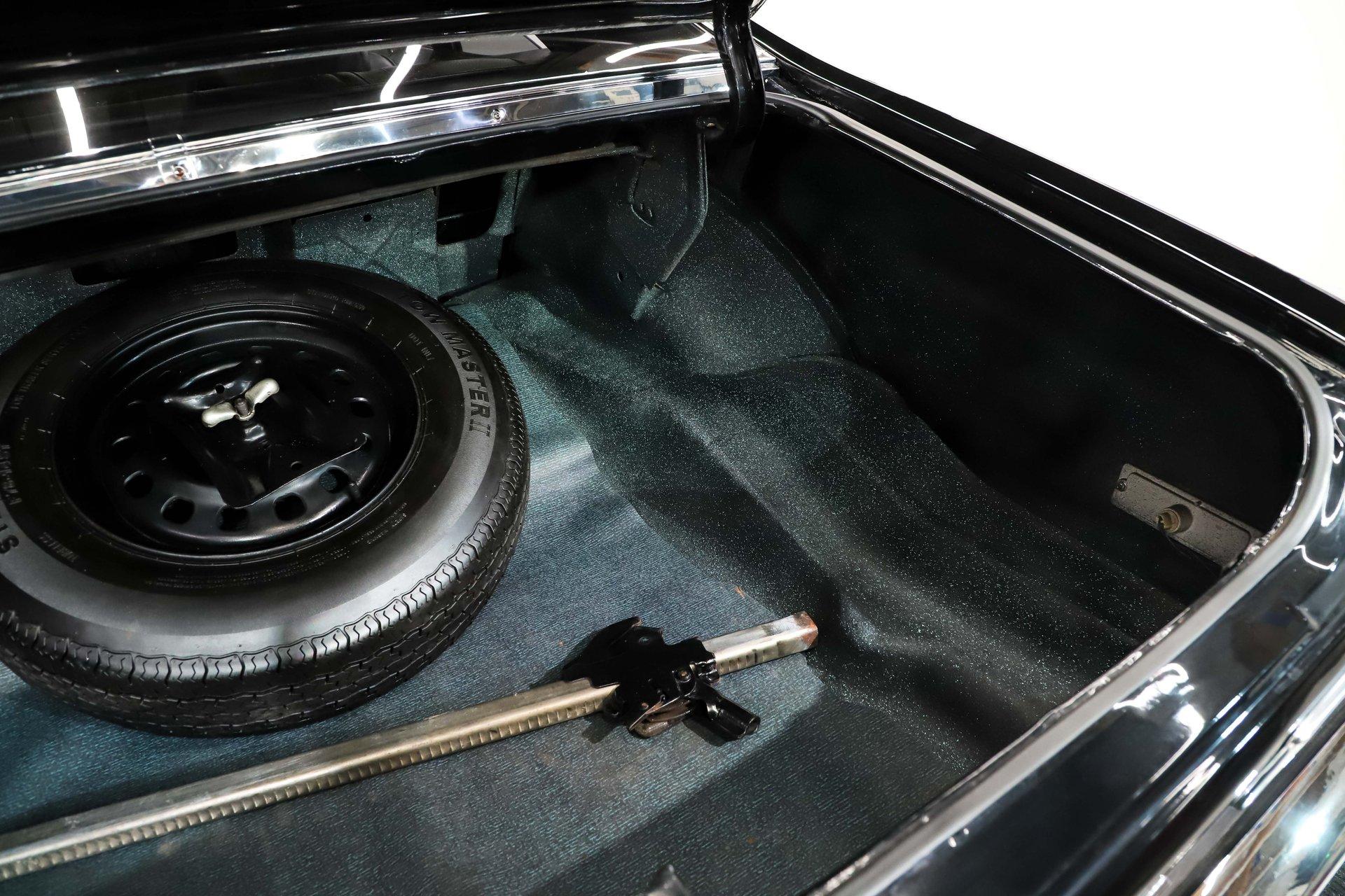 TRUNK COMPARTMENT: Under the trunk lid and the jamb are painted glossy. Inside is rock solid with a spatter finish. It has reproduction mats and weatherstrip. It is complete with a spare and jack assembly.