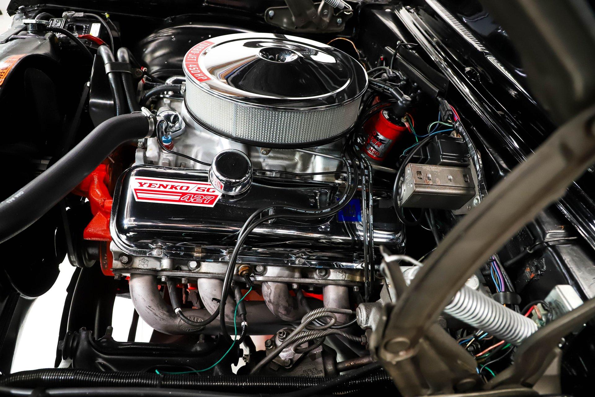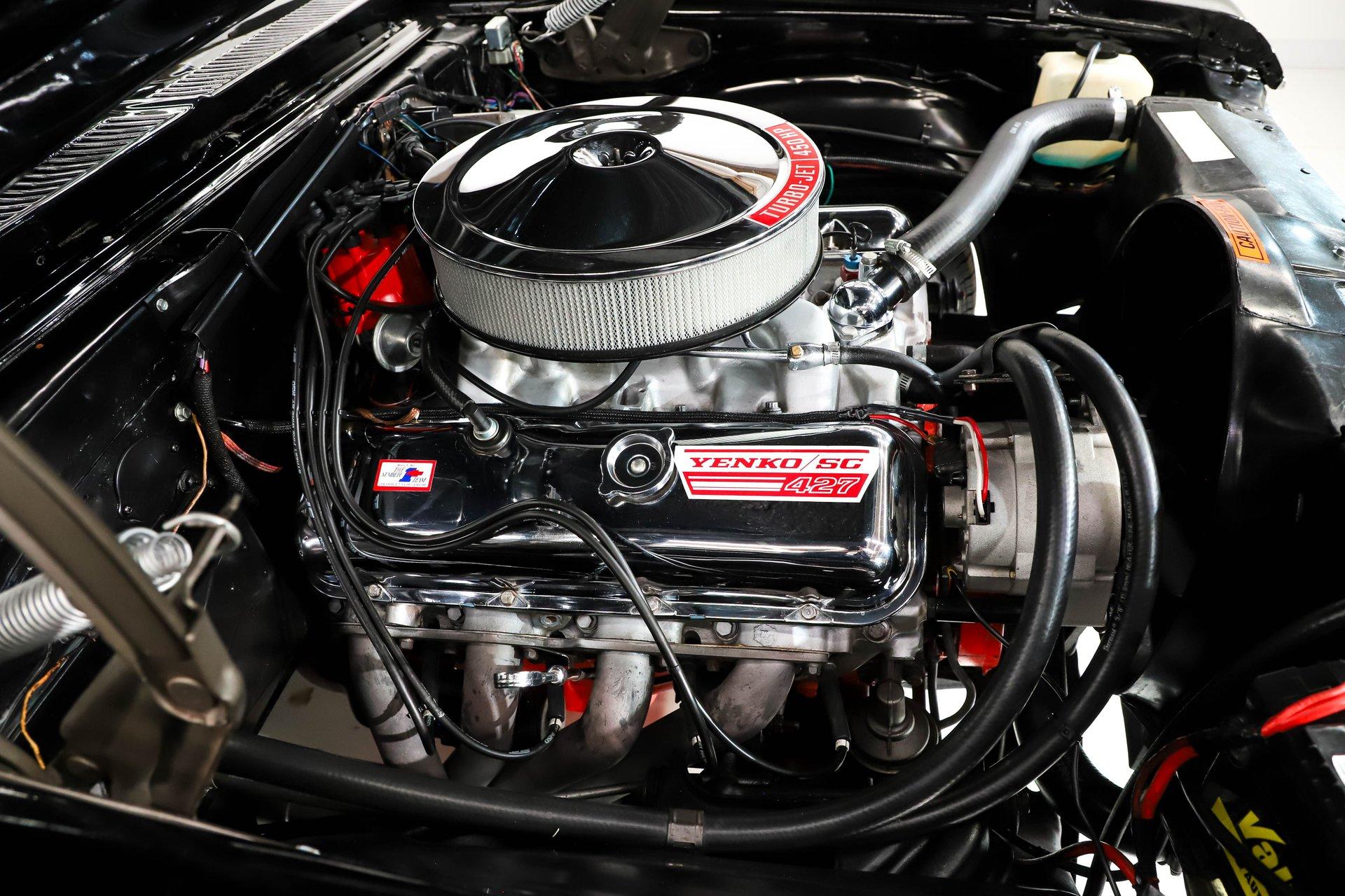 ENGINE COMPARTMENT: That's a 454 stuffed under the hood of this car and it has period GM snowflake aluminum heads and intake. It also has a dual feed Holley carb, MSD ignition and hooker headers. It dressed up with factory style chrome valve covers and intake and Yenko decals. The components look clean and proper. It has Reproduction hoses and clamps.