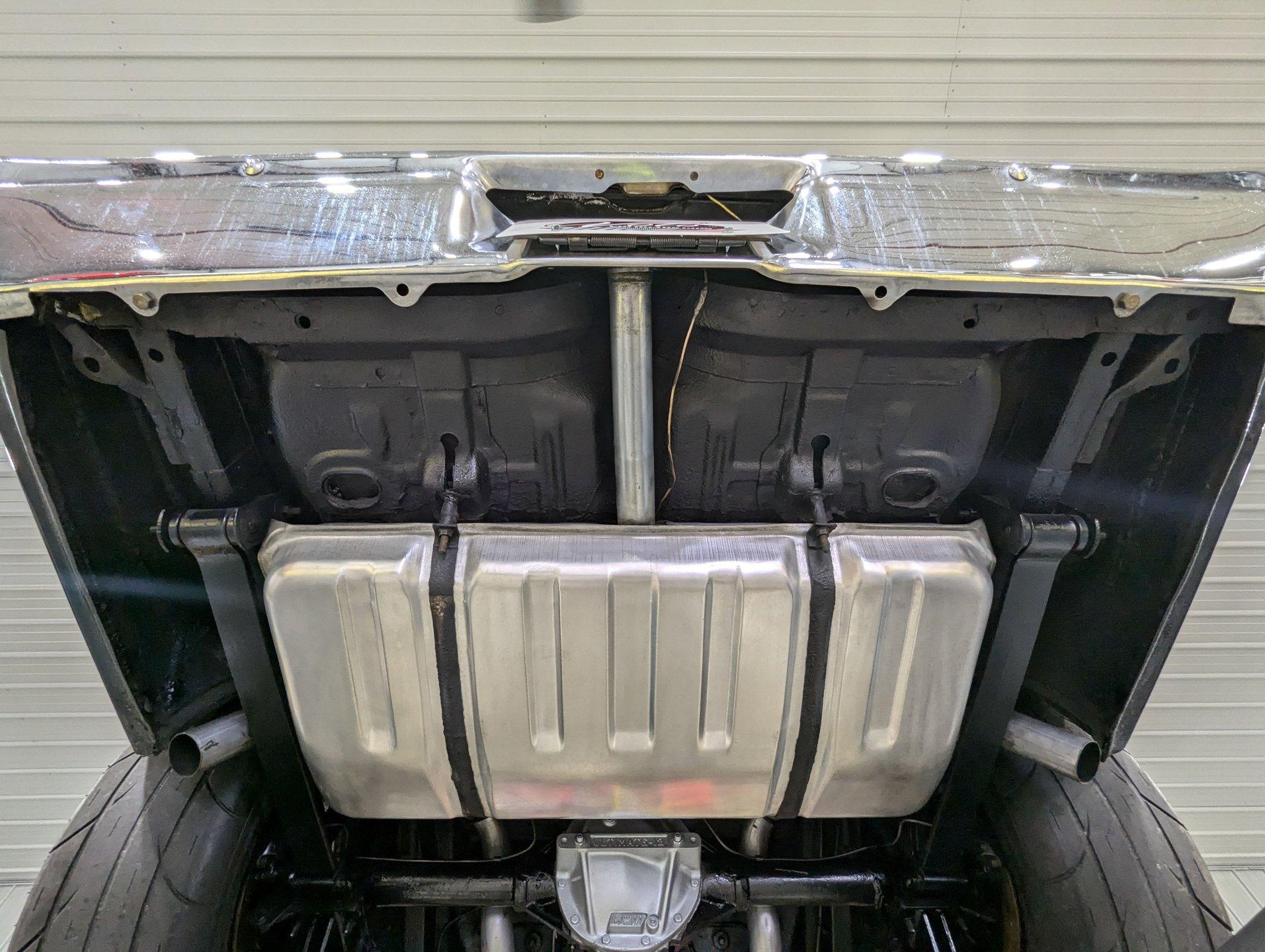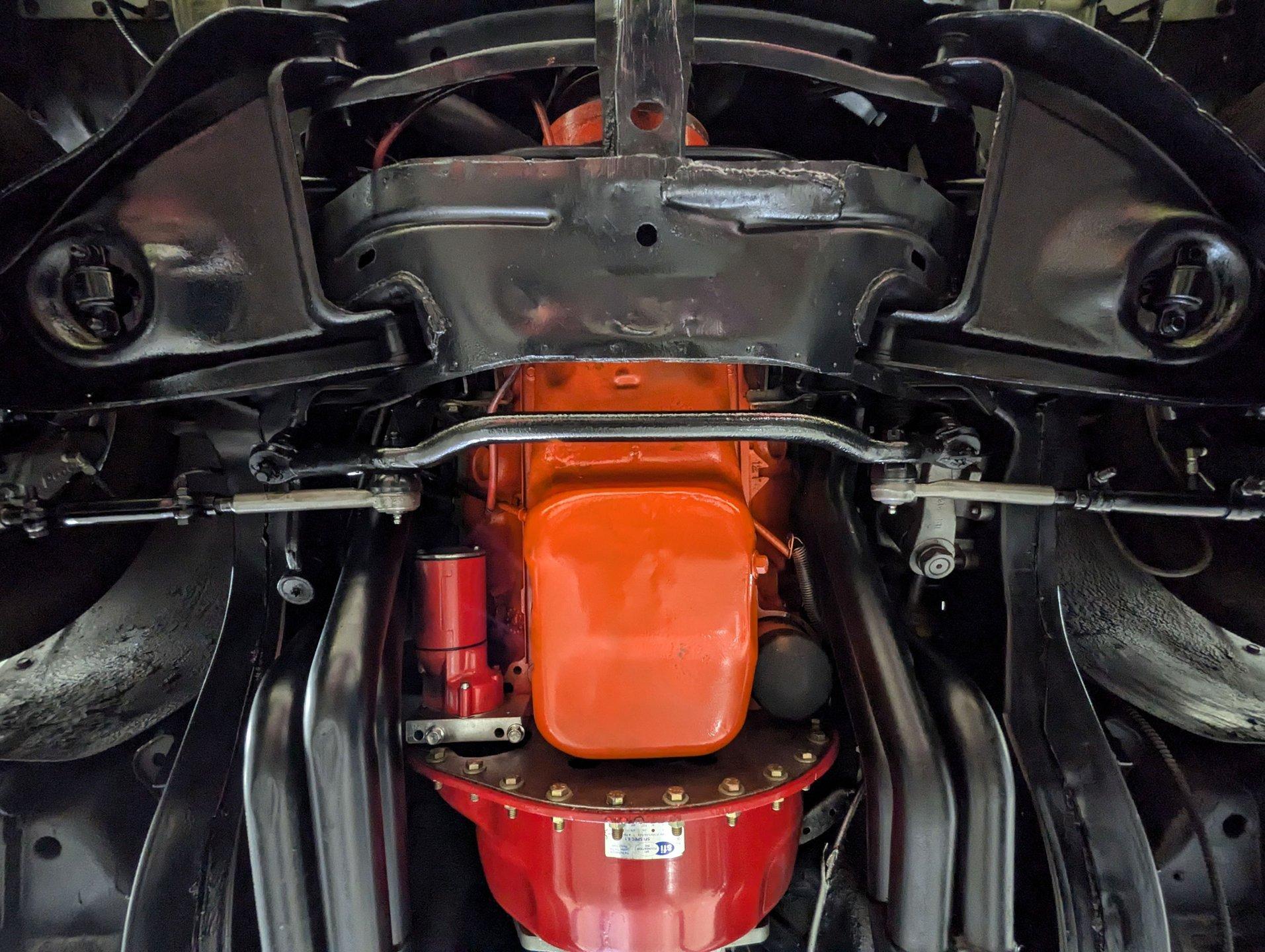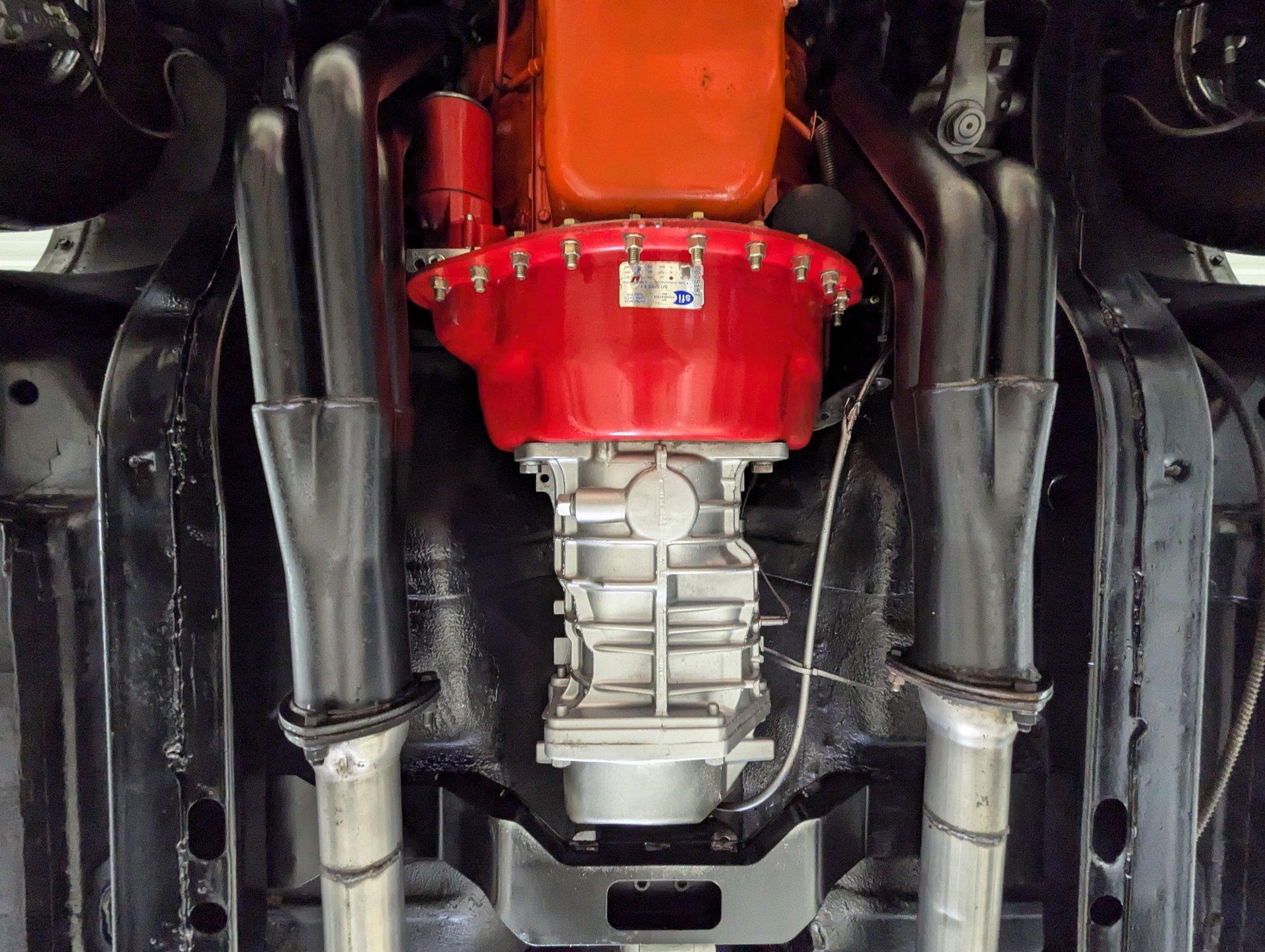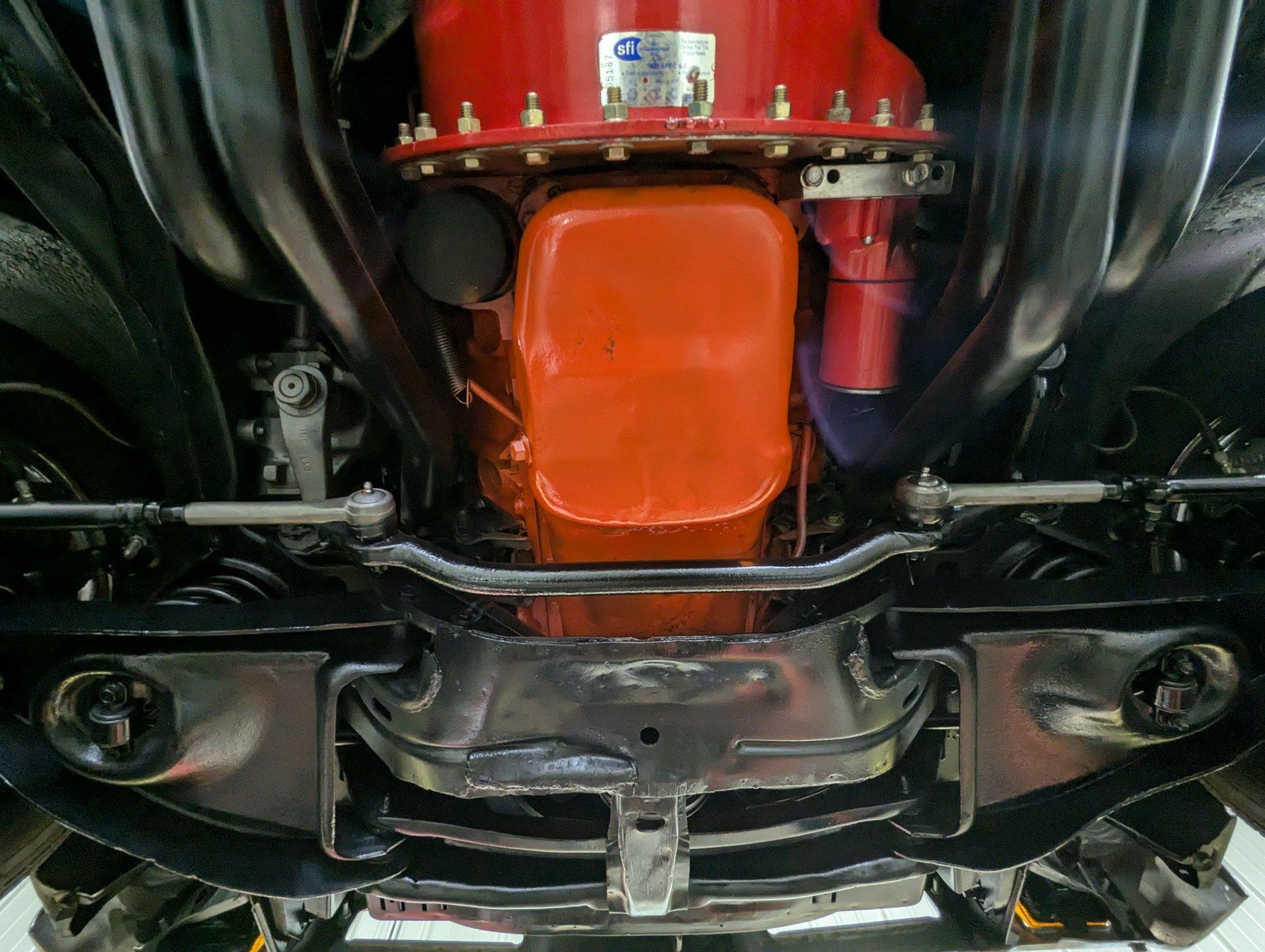 UNDERSIDE: The front end steering and suspension checks out good. Frame connectors and a driveshaft loop sturdies things up. It has tubular traction bars to keep those wheels from hoppin. Upgraded with disc brakes at all four wheels and it has custom e-brake cables. The fuel tank is new. It has a fat dual exhaust with new Flowmaster mufflers. Looking up at the motor it is clean Chevy Orange with a new high torque starter. There's an explosion proof scatter shield covering the McLeod clutch. Upgraded Tremec 5-speed trans and in back is a 12 bolt rear end with 4.30 posi gears and an aluminum girdle cover. The floors look solid.
