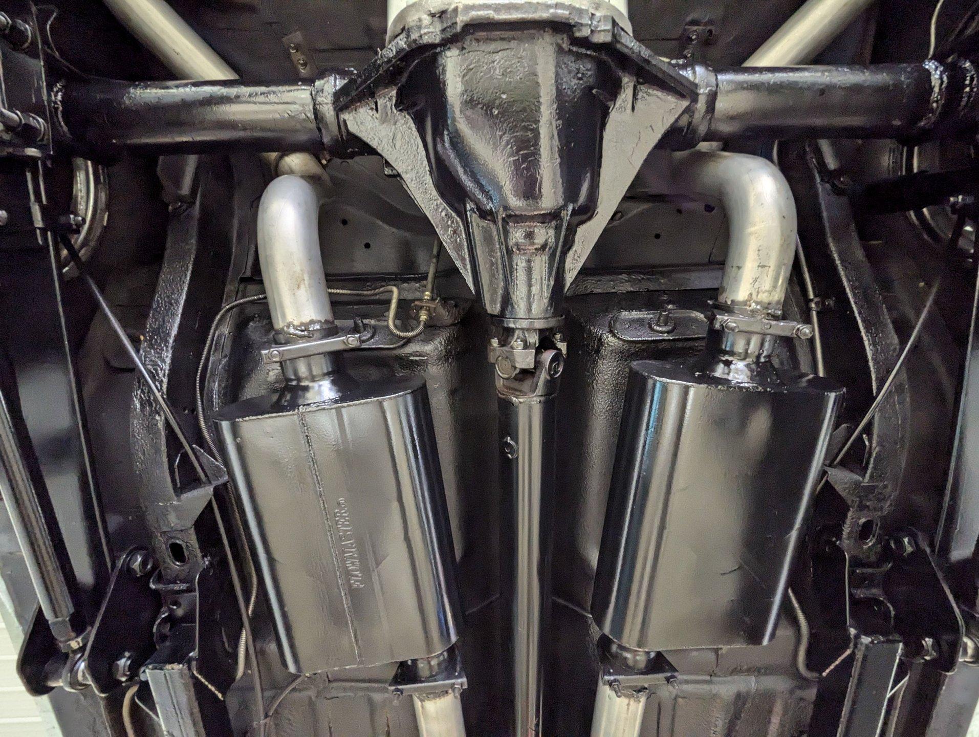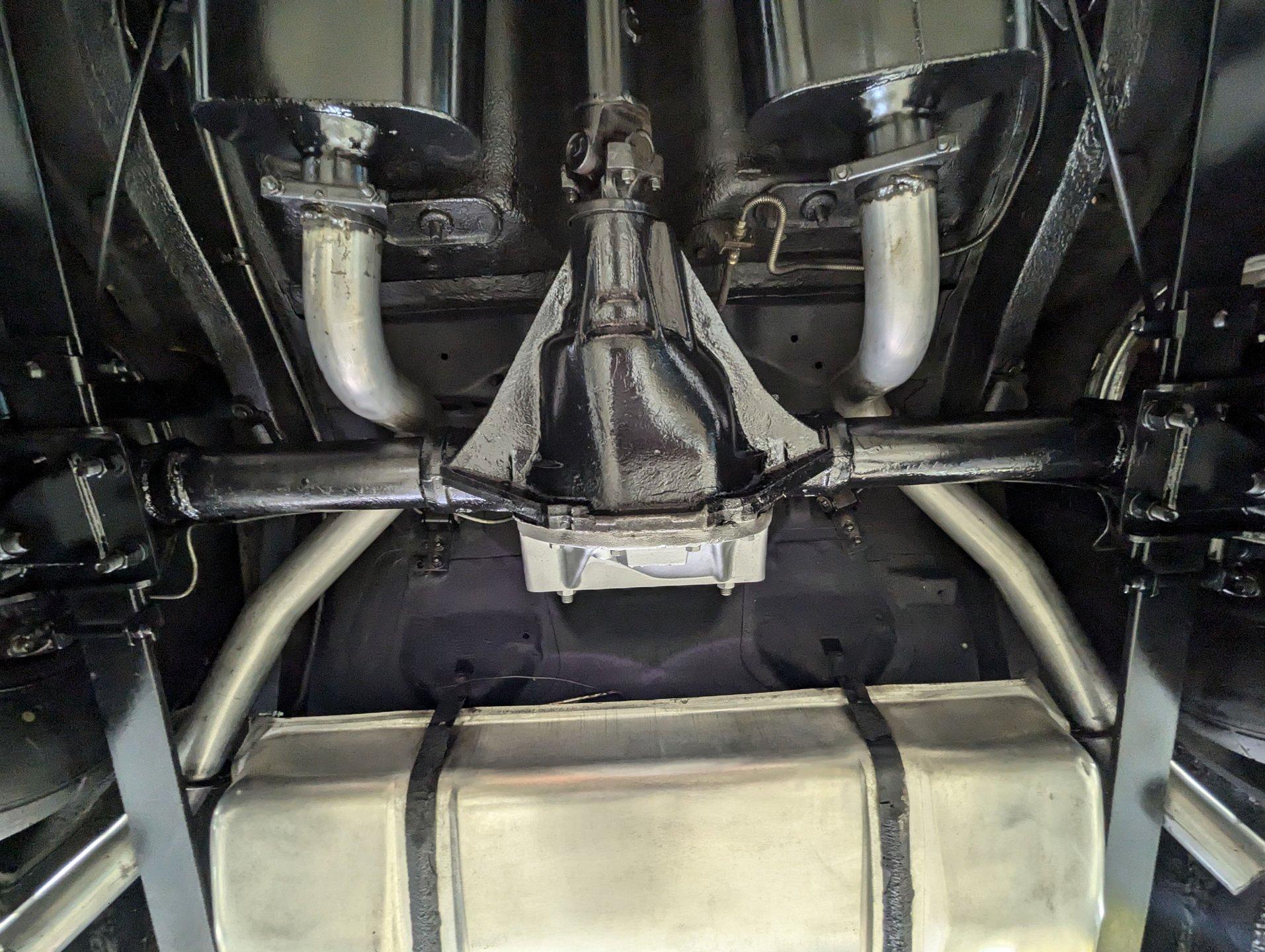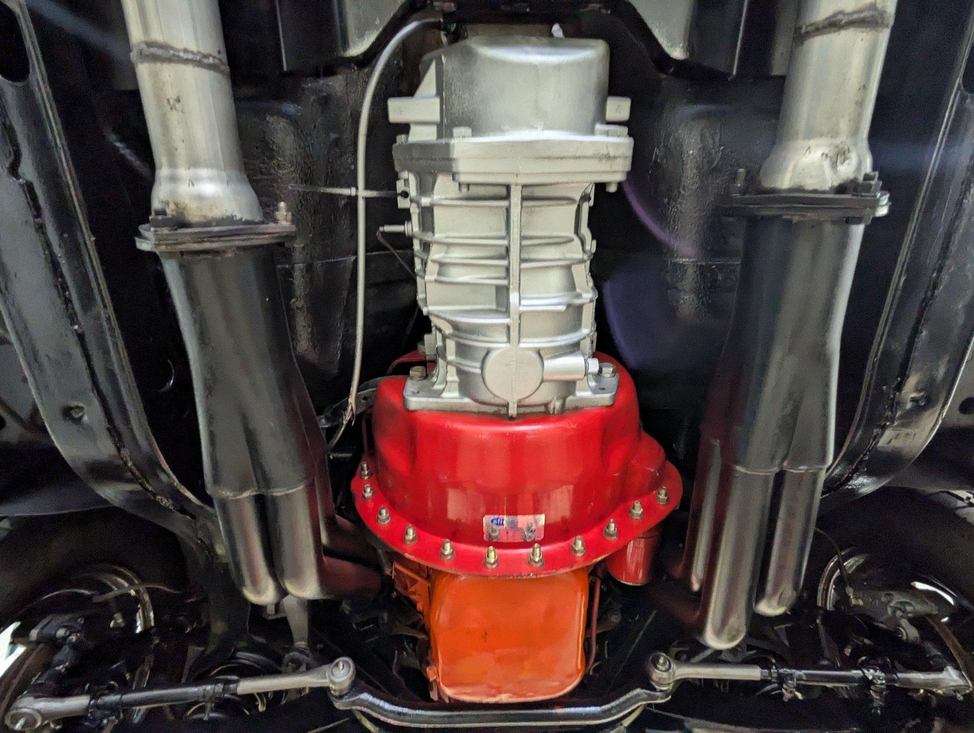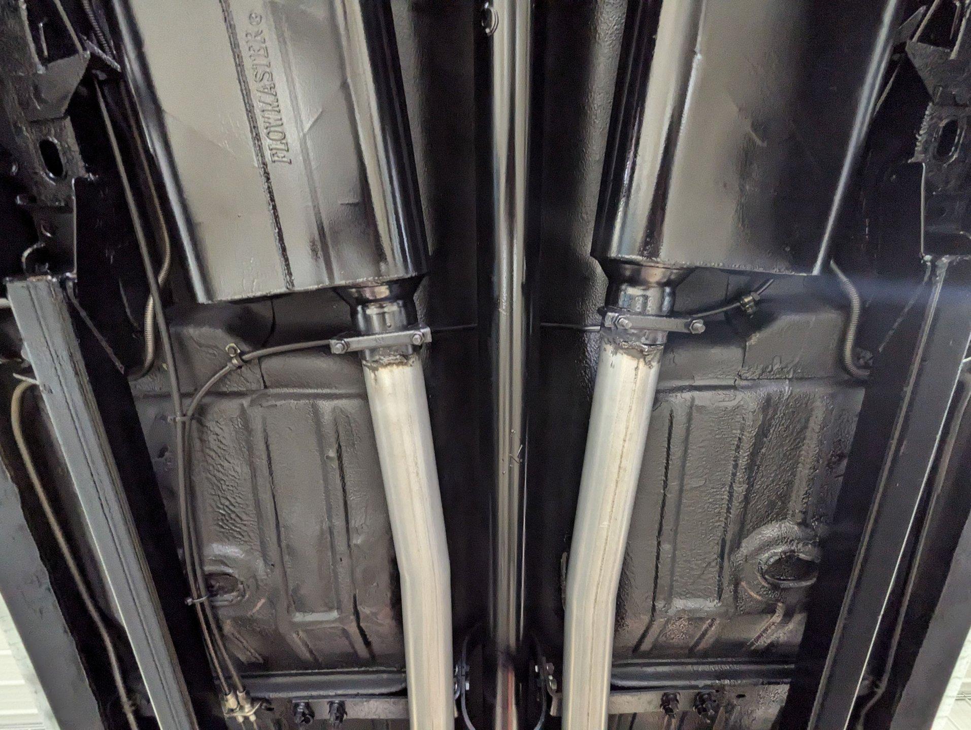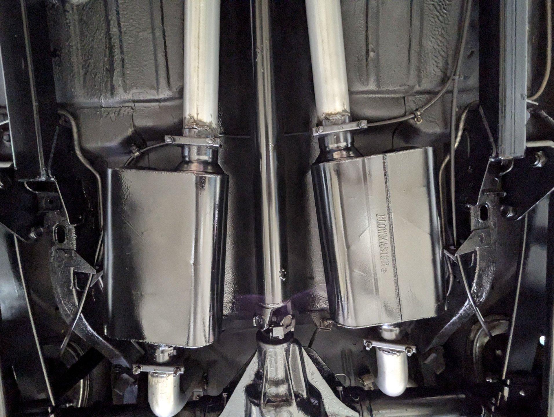 UNDERSIDE: The front end steering and suspension checks out good. Frame connectors and a driveshaft loop sturdies things up. It has tubular traction bars to keep those wheels from hoppin. Upgraded with disc brakes at all four wheels and it has custom e-brake cables. The fuel tank is new. It has a fat dual exhaust with new Flowmaster mufflers. Looking up at the motor it is clean Chevy Orange with a new high torque starter. There's an explosion proof scatter shield covering the McLeod clutch. Upgraded Tremec 5-speed trans and in back is a 12 bolt rear end with 4.30 posi gears and an aluminum girdle cover. The floors look solid.