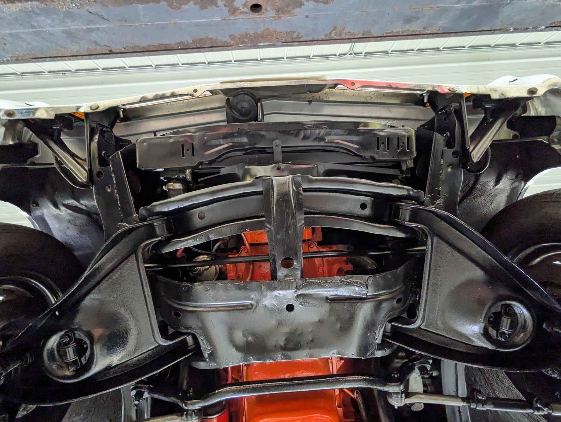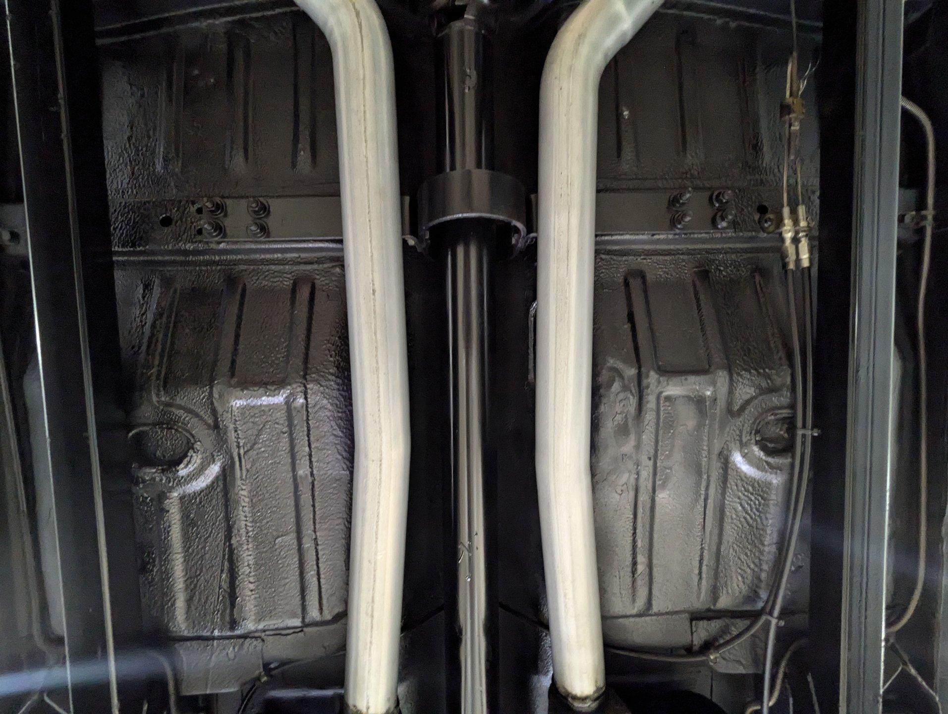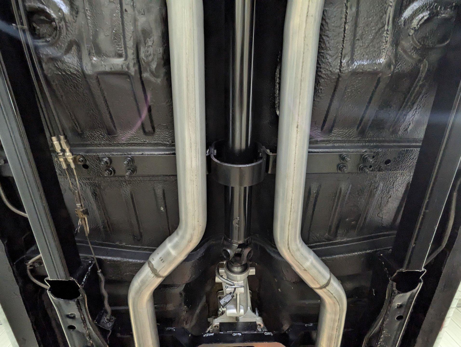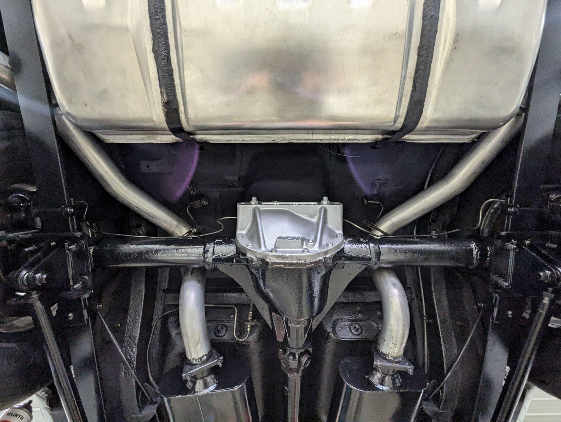 UNDERSIDE: The front end steering and suspension checks out good. Frame connectors and a driveshaft loop sturdies things up. It has tubular traction bars to keep those wheels from hoppin. Upgraded with disc brakes at all four wheels and it has custom e-brake cables. The fuel tank is new. It has a fat dual exhaust with new Flowmaster mufflers. Looking up at the motor it is clean Chevy Orange with a new high torque starter. There's an explosion proof scatter shield covering the McLeod clutch. Upgraded Tremec 5-speed trans and in back is a 12 bolt rear end with 4.30 posi gears and an aluminum girdle cover. The floors look solid.