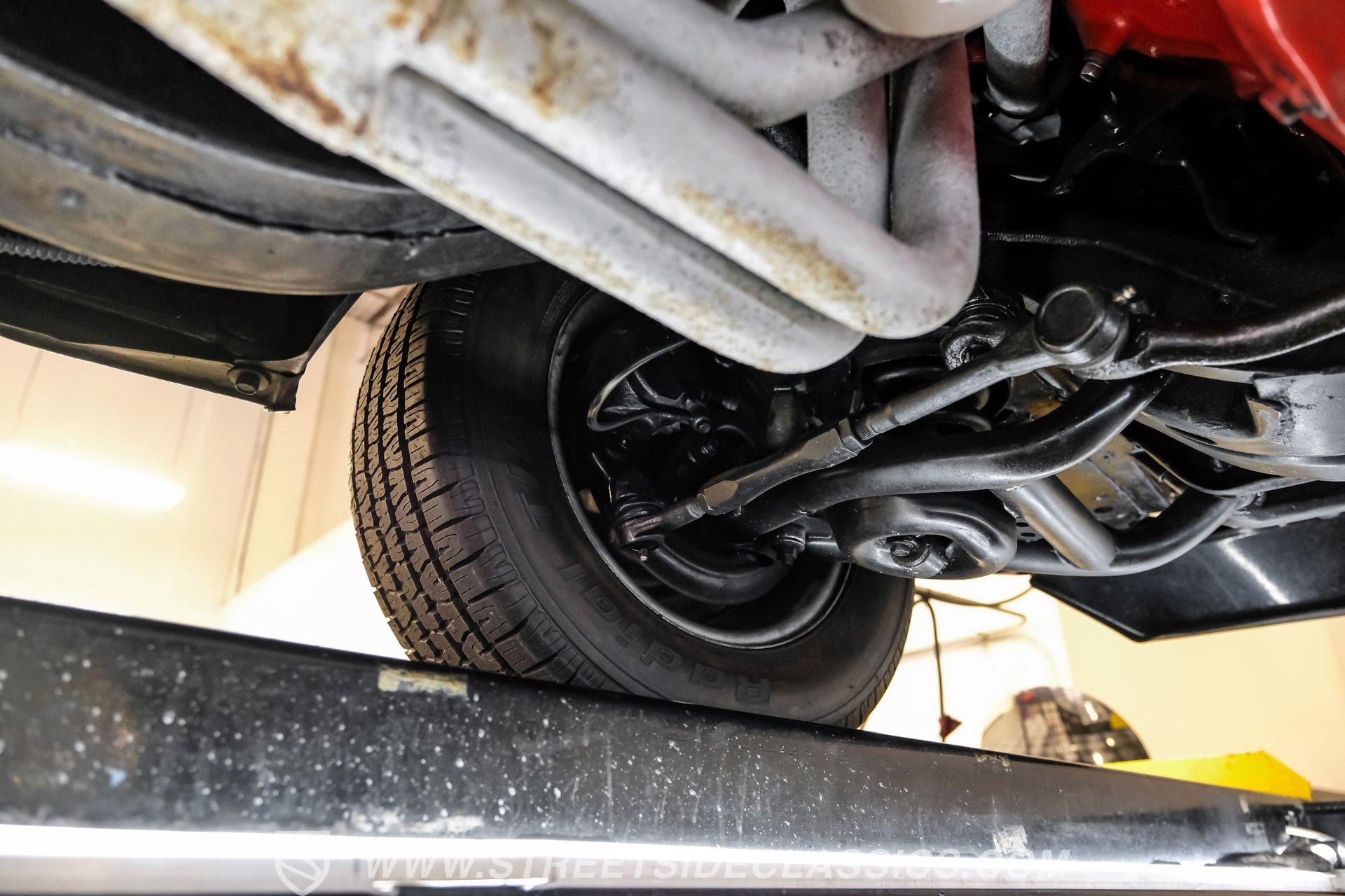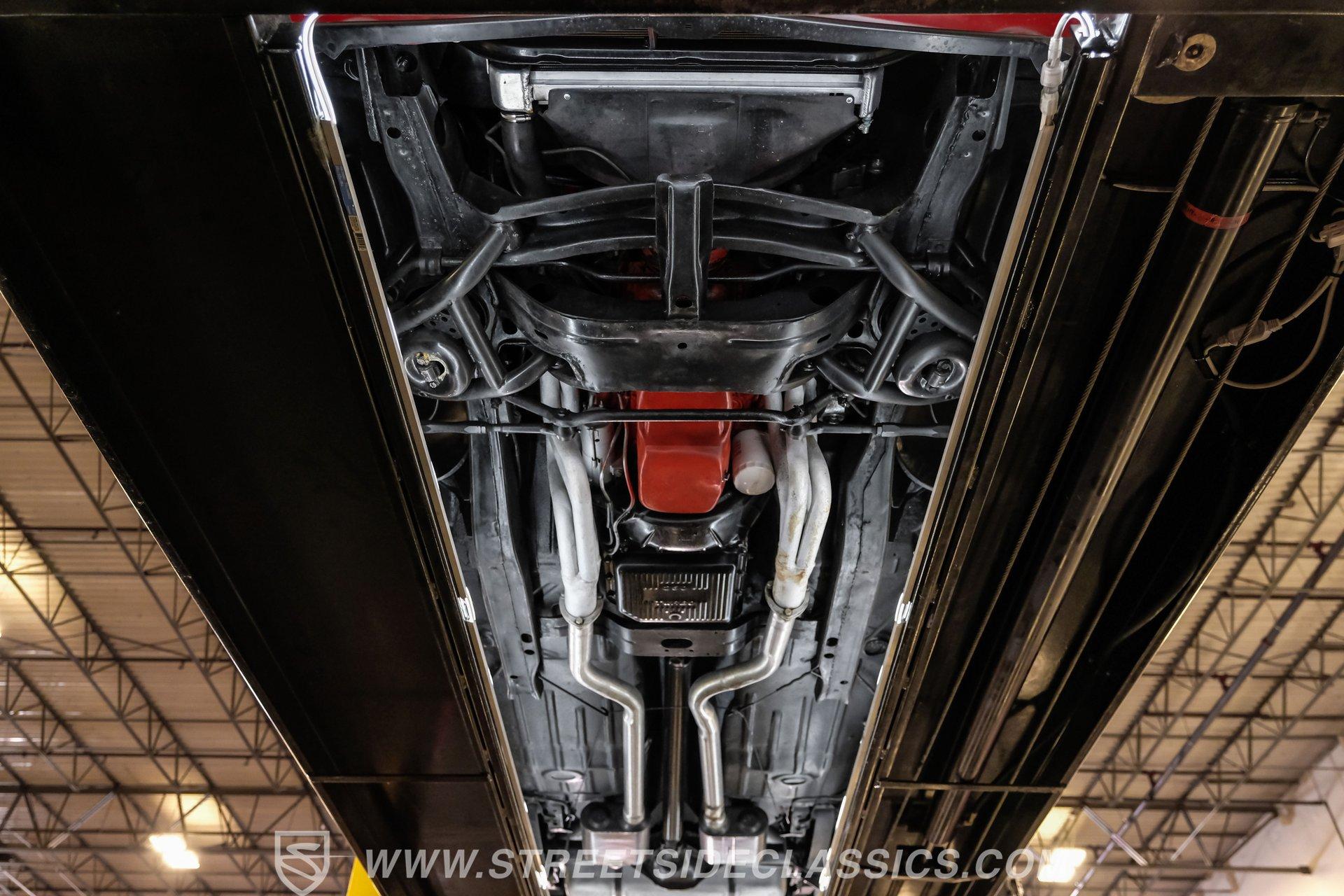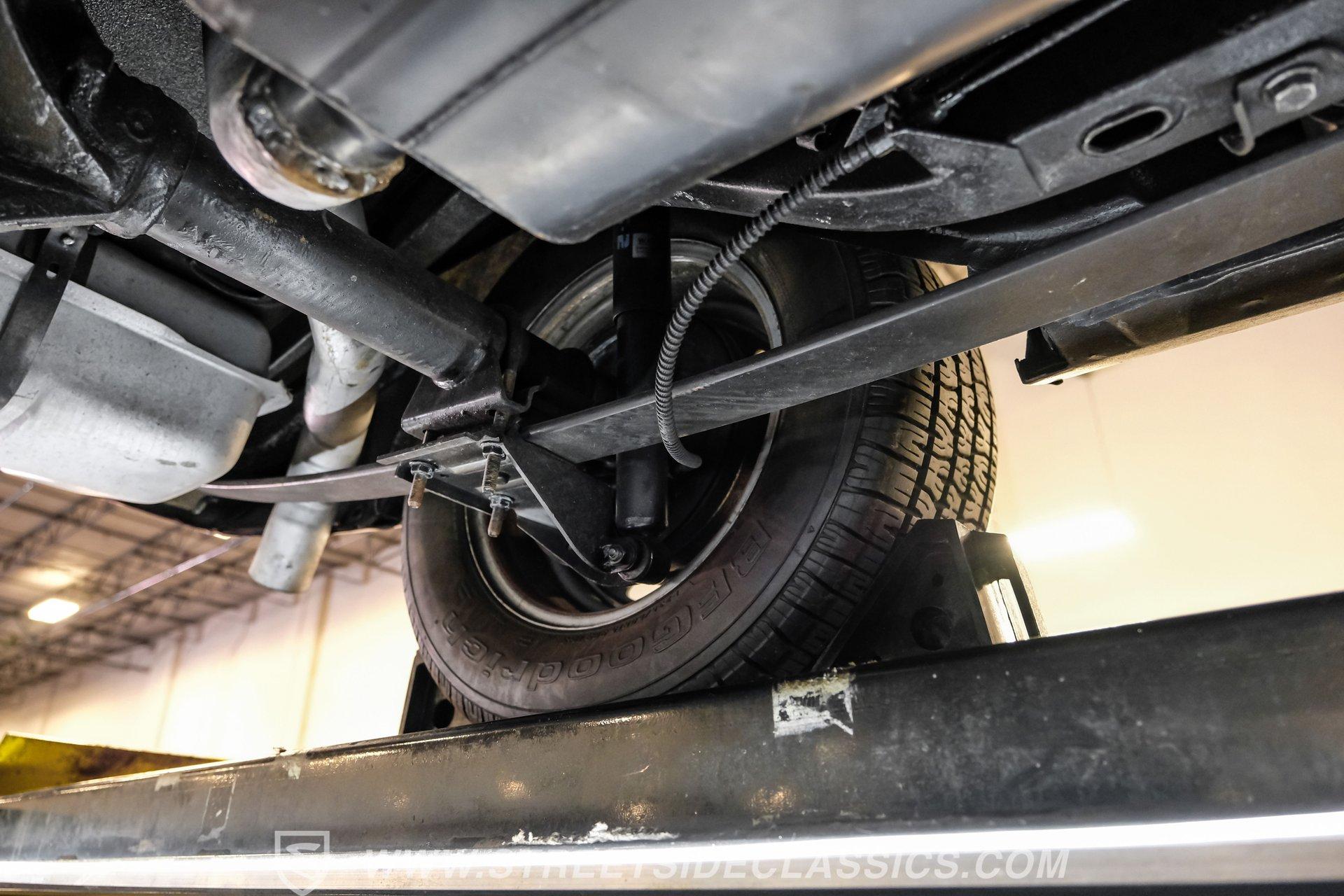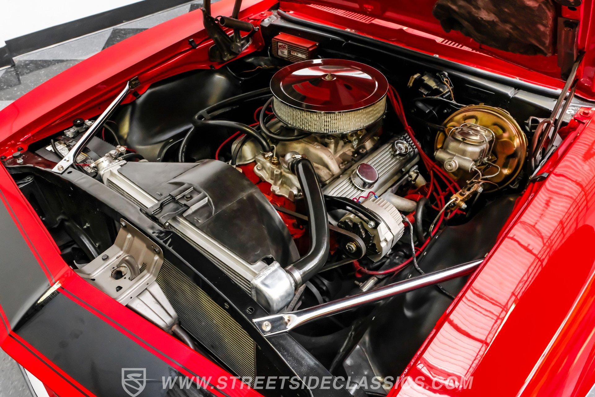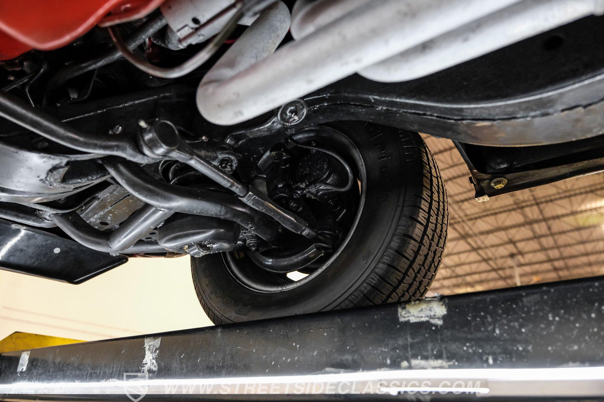 The suspension features tubular A-arms with coilovers up front to help lower the stance, while the rear uses leaf springs with lowering blocks and shocks. Fifteen-inch Rally wheels sit at all four corners, wrapped in 215/65R15 front and 235/60R15 rear BFGoodrich tires. Braking comes from front power disc brakes and rear power drum brakes. For the perfect muscle car rumble, long-tube headers feed a dual exhaust system that runs through Flowmaster mufflers.