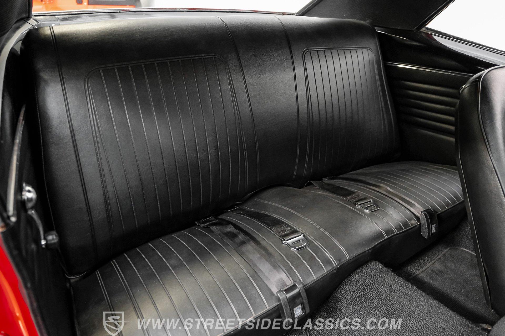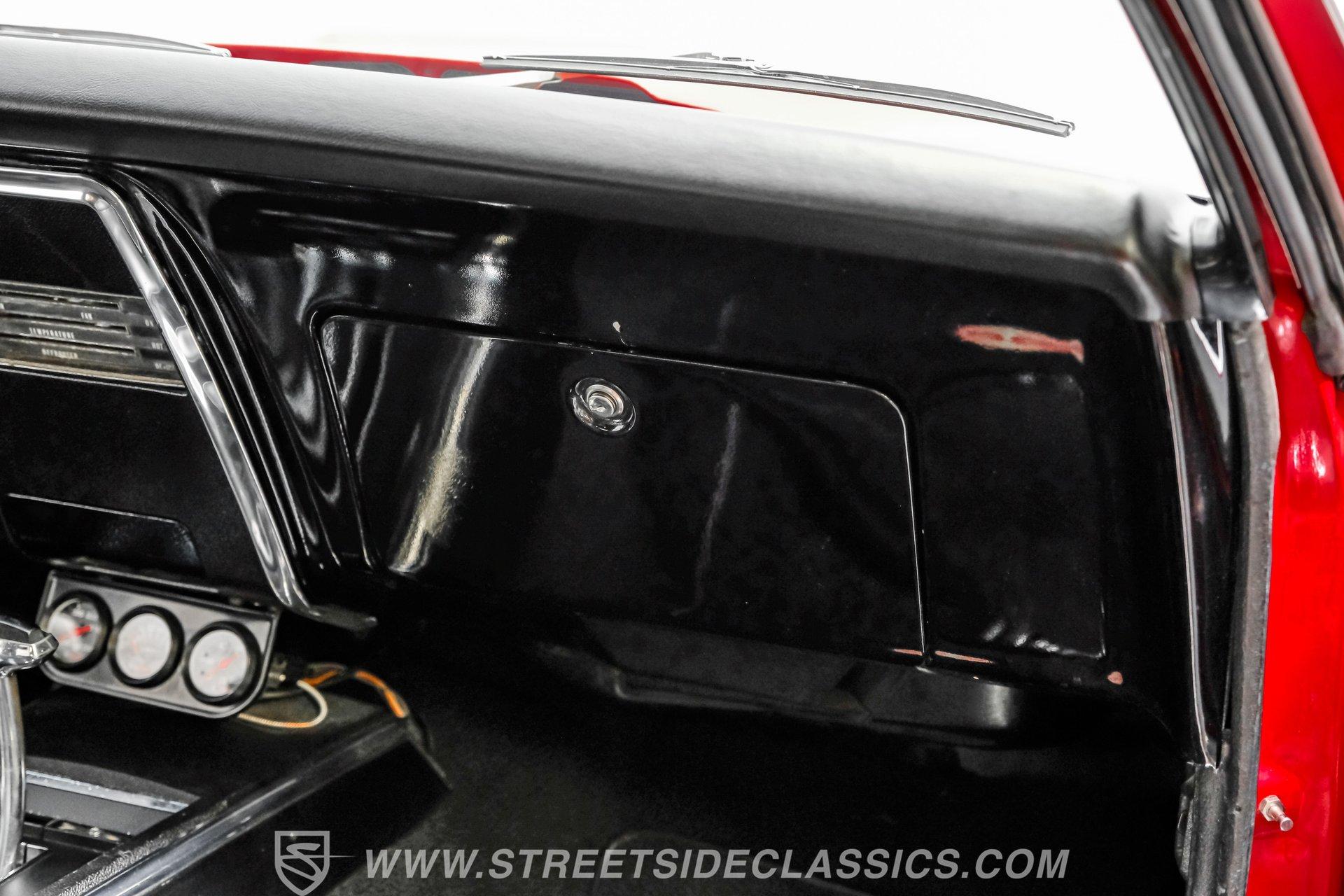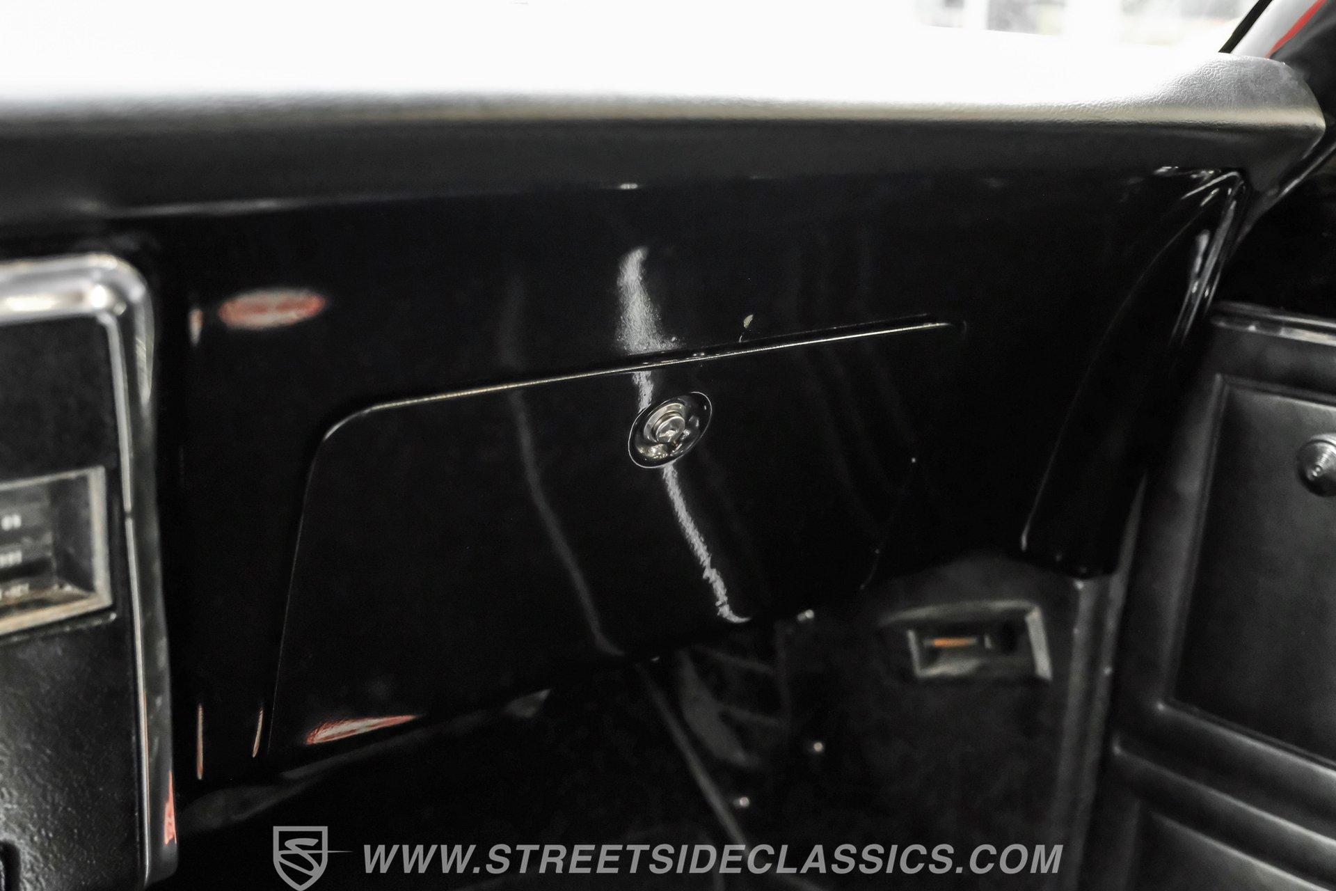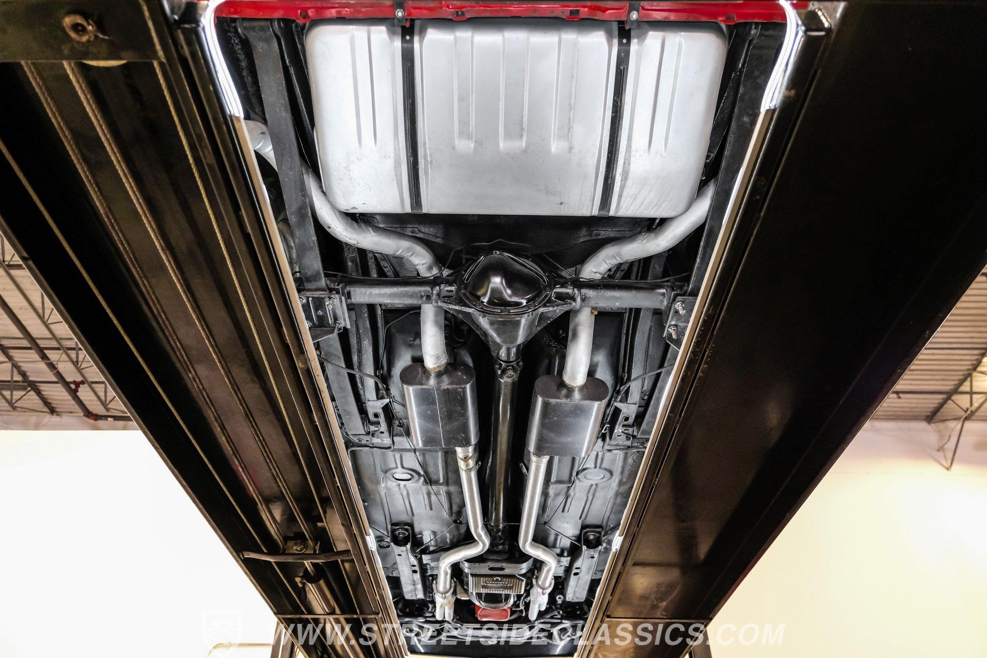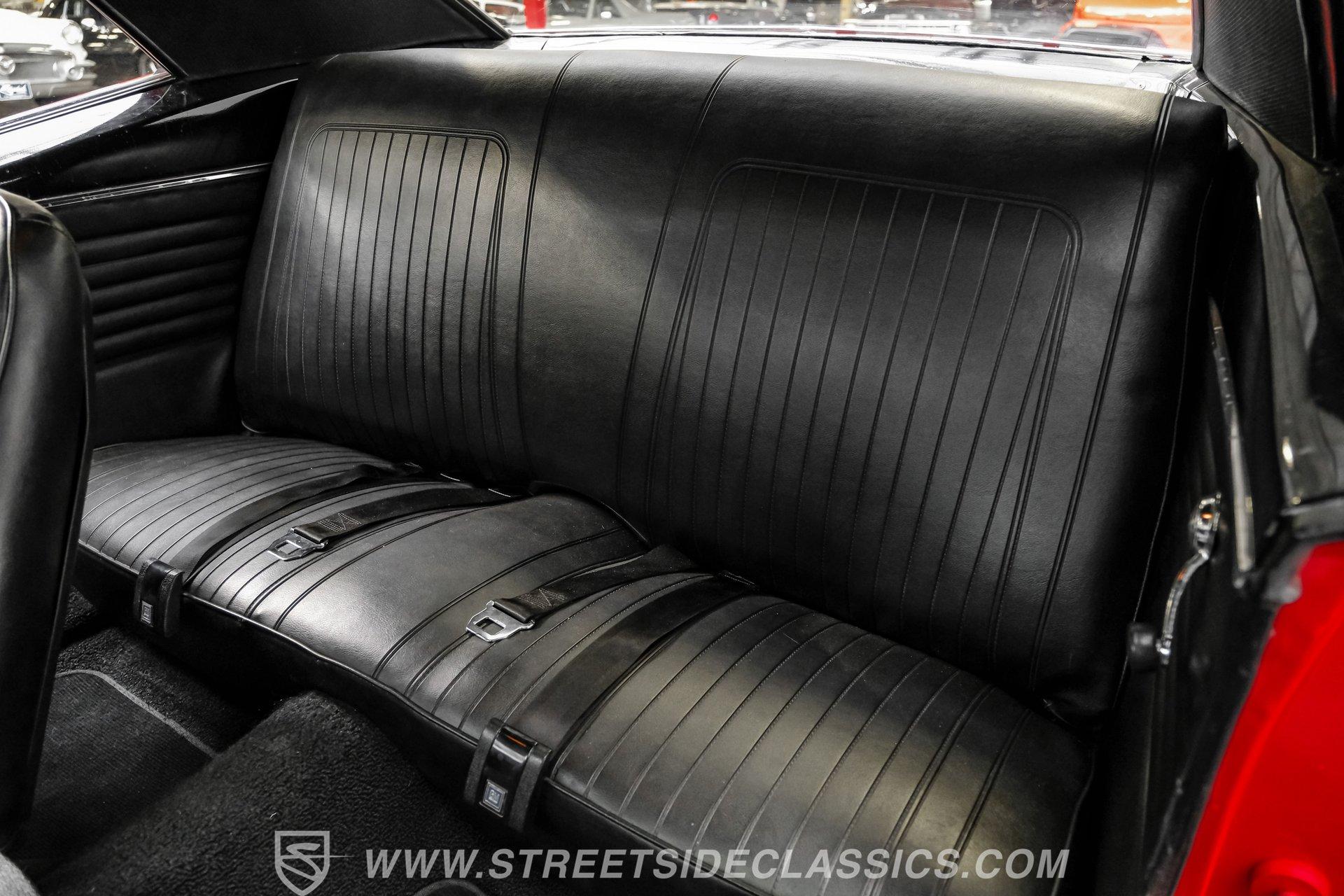 The suspension features tubular A-arms with coilovers up front to help lower the stance, while the rear uses leaf springs with lowering blocks and shocks. Fifteen-inch Rally wheels sit at all four corners, wrapped in 215/65R15 front and 235/60R15 rear BFGoodrich tires. Braking comes from front power disc brakes and rear power drum brakes. For the perfect muscle car rumble, long-tube headers feed a dual exhaust system that runs through Flowmaster mufflers.