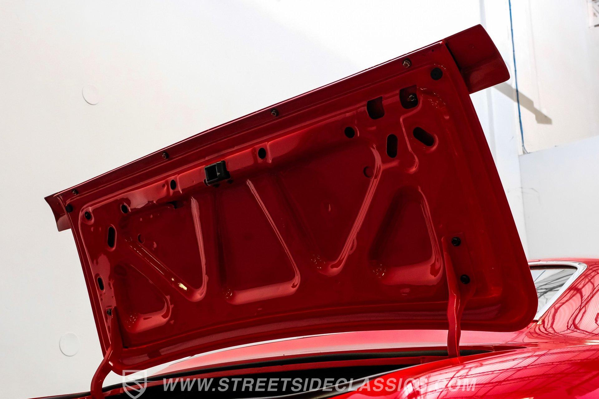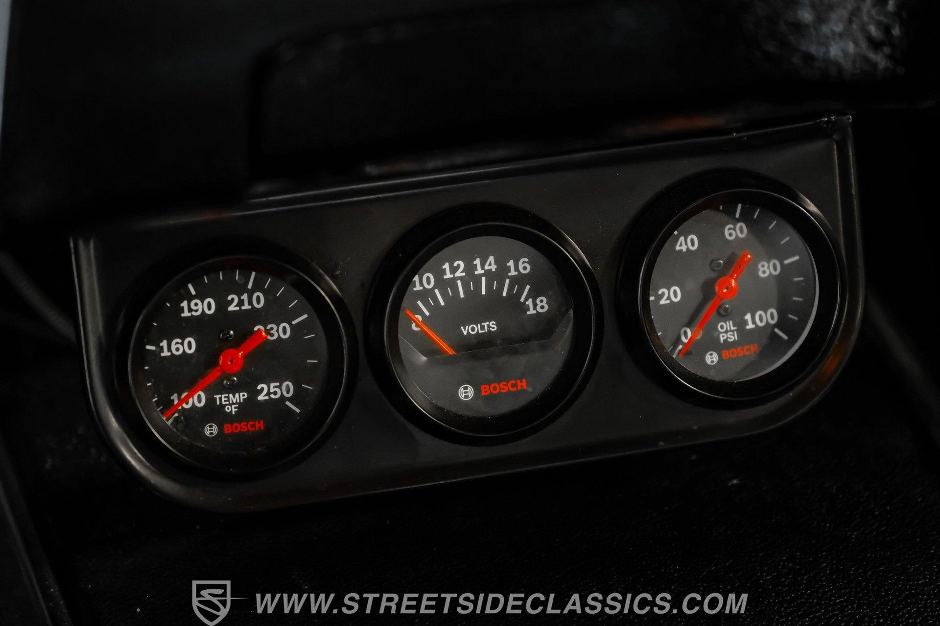 Inside, the all-black interior is clean and well cared for. The vinyl bucket seats and matching door panels are in great condition with no rips or tears. The headliner, carpeting, and dashboard show equally well. A stock-appearing steering wheel and gauge cluster maintain the factory look and show no signs of major damage. Under the dashboard sits a gauge pod with Bosch gauges monitoring temperature, oil pressure, and volts. The center console is in good shape and houses a chrome T-shifter, while the climate control cluster shows a little age. The door jambs and sill plates are clean, and the trunk is tidy with a liner installed.