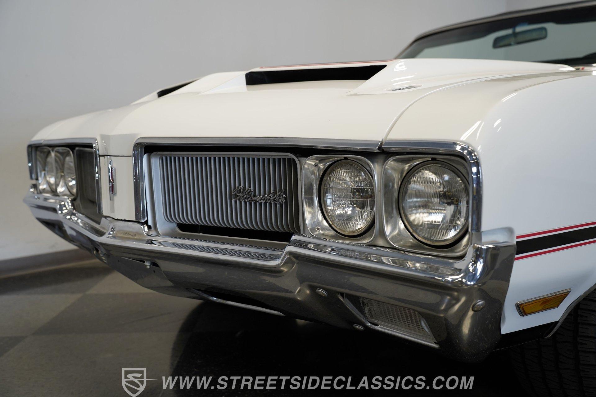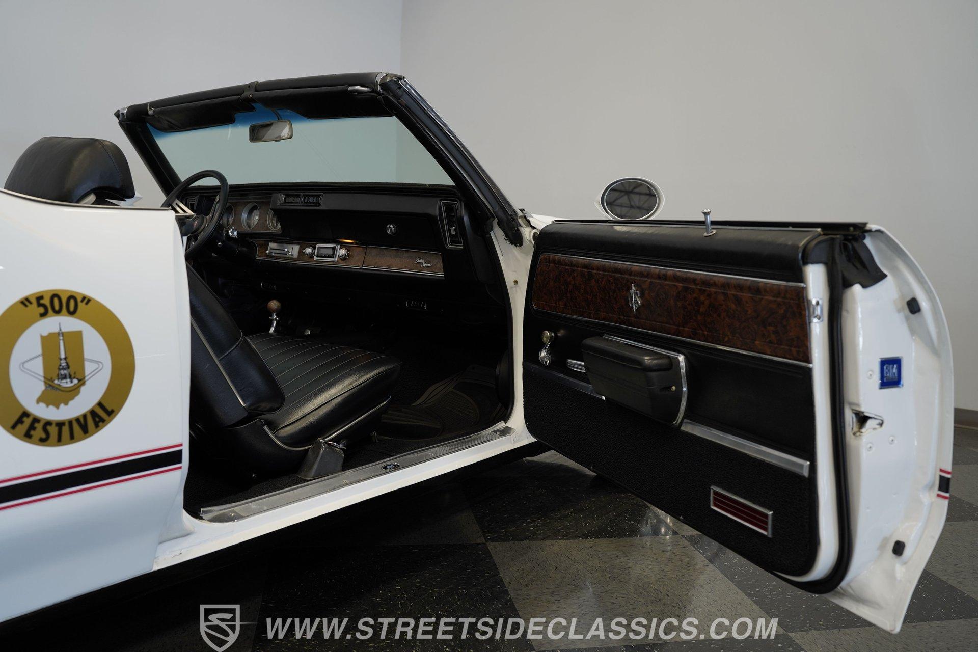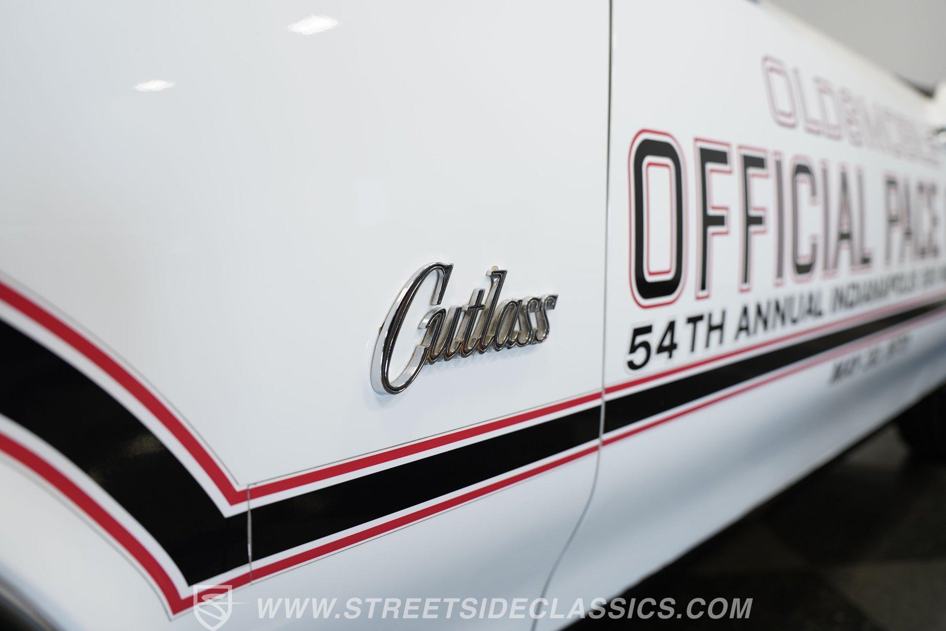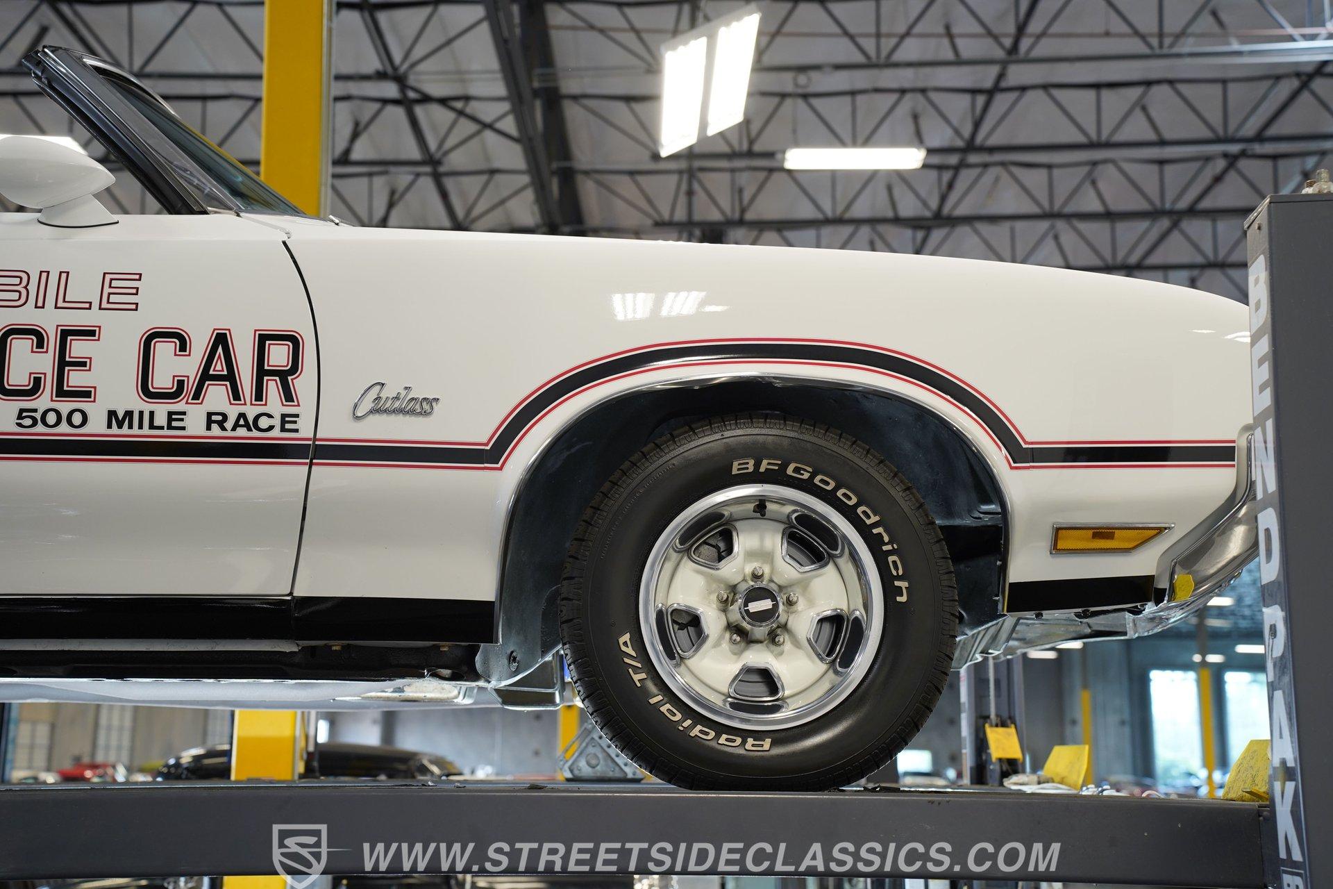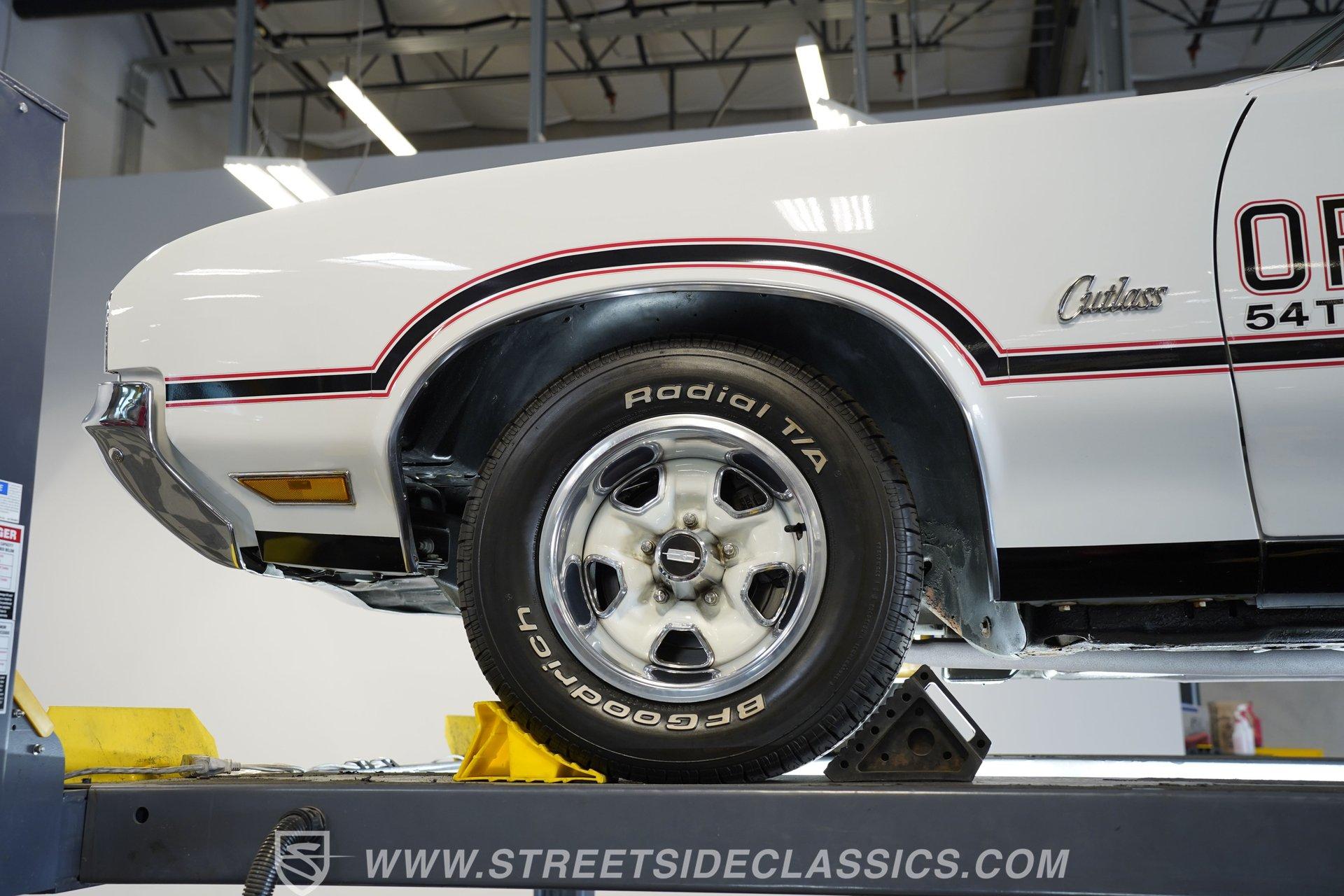 Finished in Porcelain White with a white convertible top, this Pace Car features black racing stripes on the hood and across the deck lid, outlined with red pin stripping. Matching colored side stripes run down the side of the car, and the Oldsmobile Official Pace Car decals are hard to miss. The chrome bumpers present well, and the Ram Air hood, deck lid, fenders, doors, and quarter panels all appear straight and clean. Factory-style white Oldsmobile wheels complete the period-correct look and give the car the proper stance.
