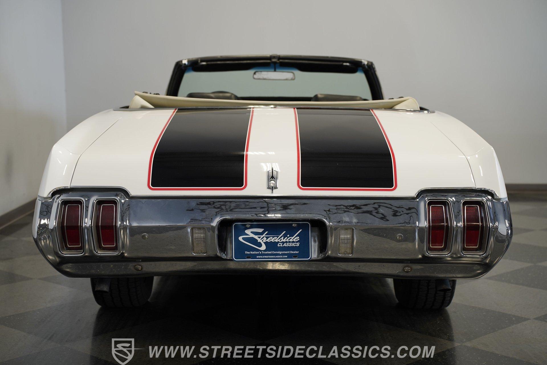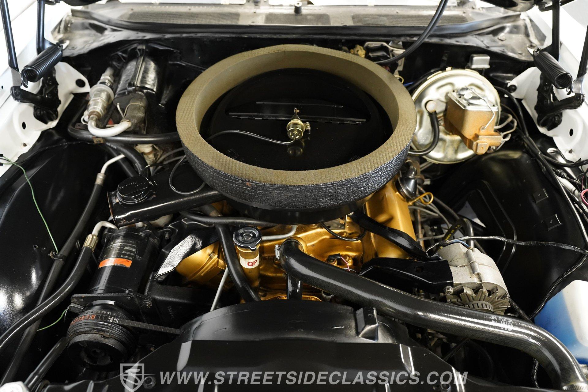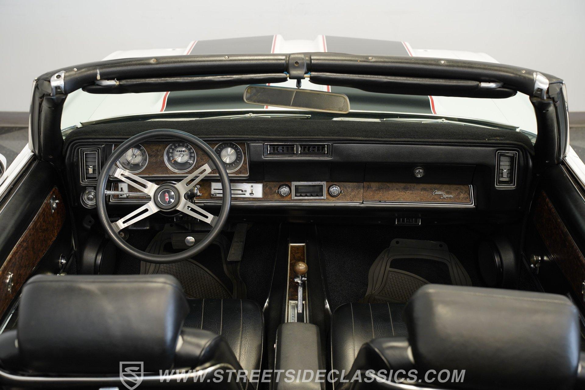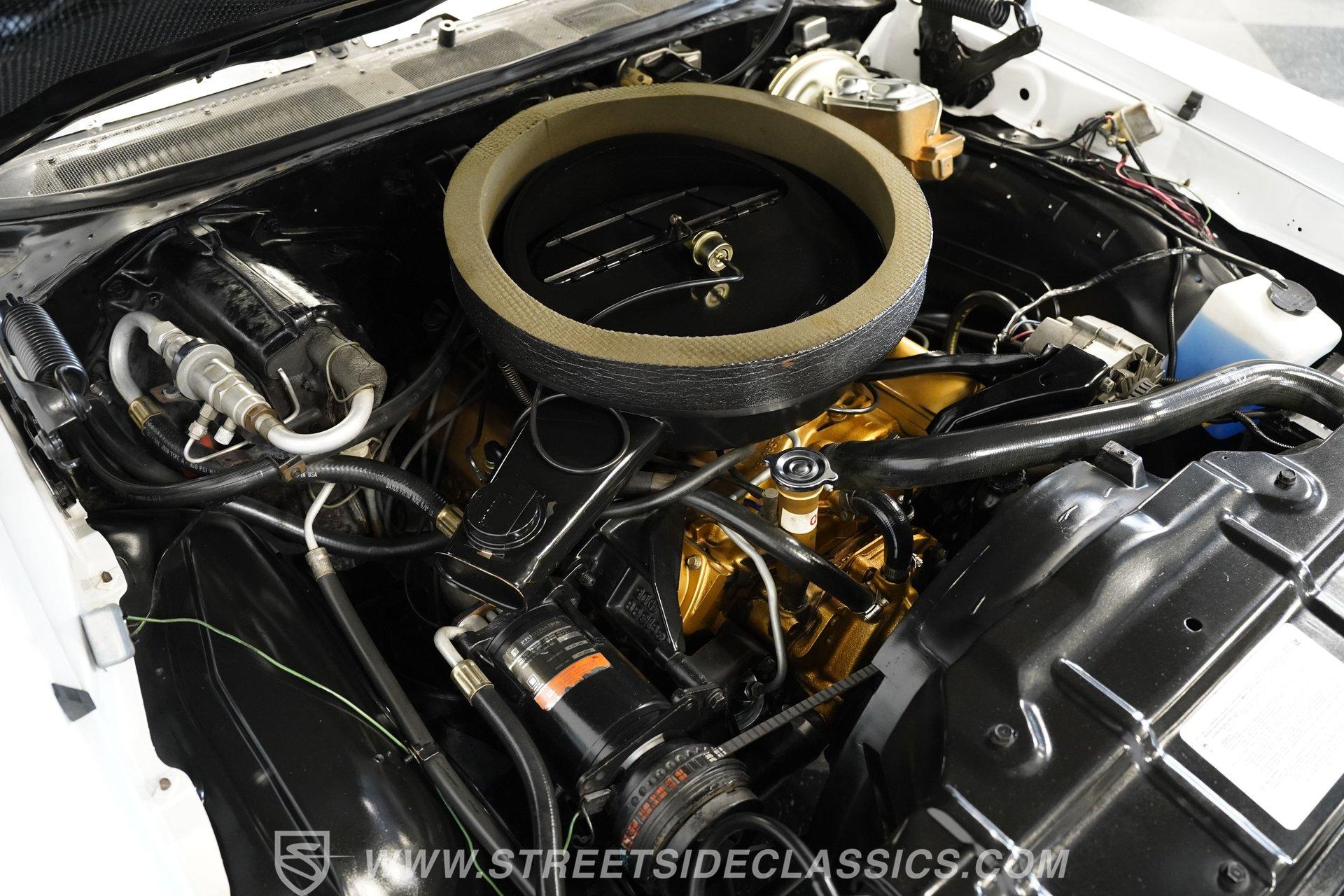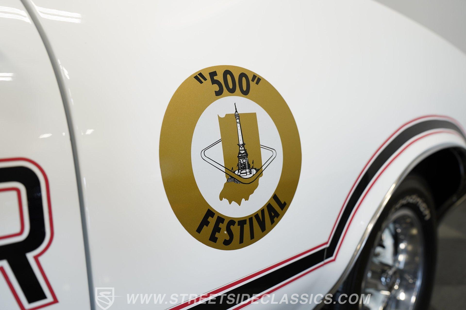 Finished in Porcelain White with a white convertible top, this Pace Car features black racing stripes on the hood and across the deck lid, outlined with red pin stripping. Matching colored side stripes run down the side of the car, and the Oldsmobile Official Pace Car decals are hard to miss. The chrome bumpers present well, and the Ram Air hood, deck lid, fenders, doors, and quarter panels all appear straight and clean. Factory-style white Oldsmobile wheels complete the period-correct look and give the car the proper stance.