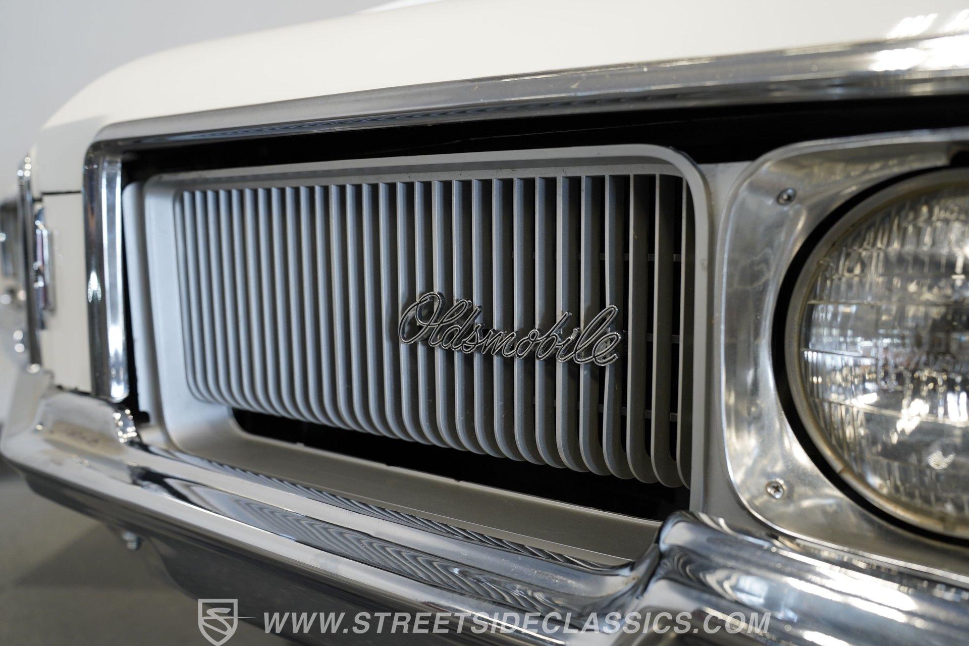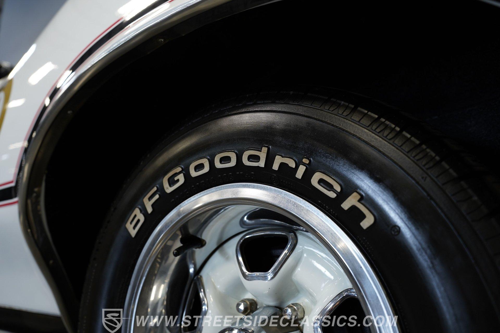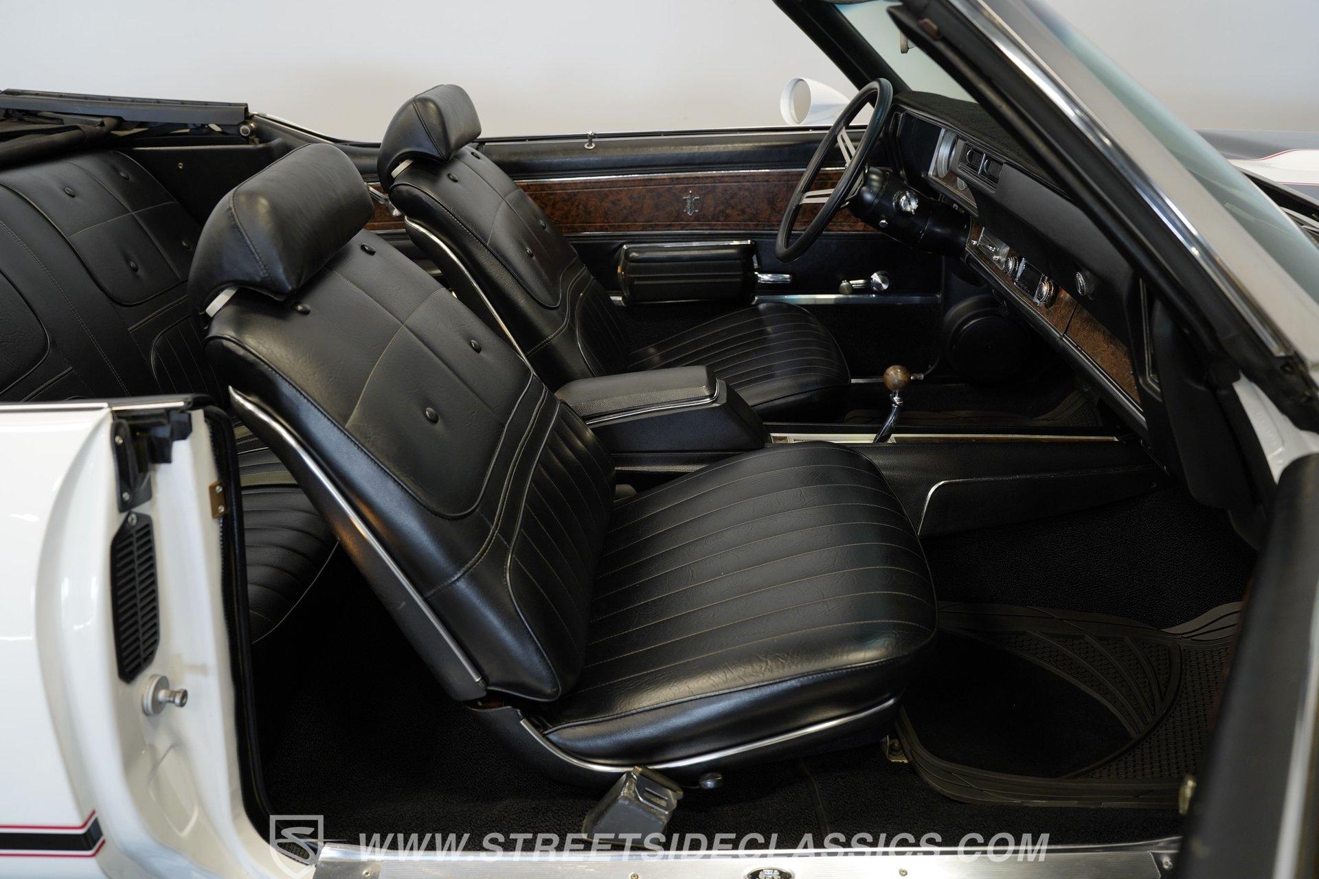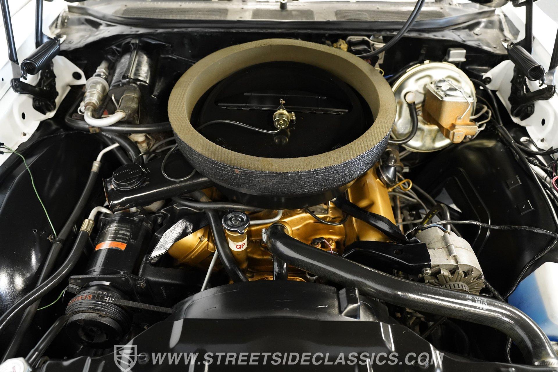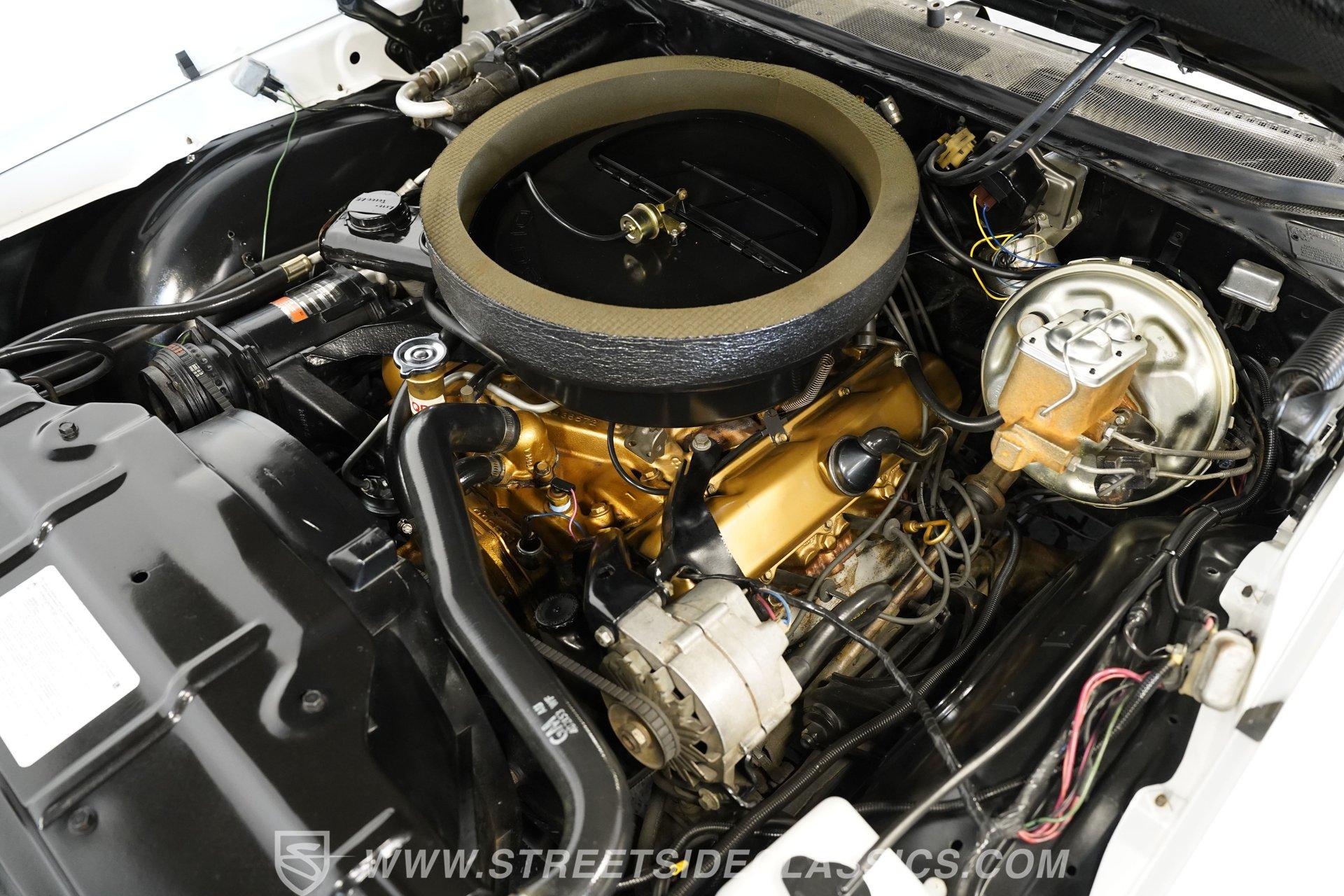 Finished in Porcelain White with a white convertible top, this Pace Car features black racing stripes on the hood and across the deck lid, outlined with red pin stripping. Matching colored side stripes run down the side of the car, and the Oldsmobile Official Pace Car decals are hard to miss. The chrome bumpers present well, and the Ram Air hood, deck lid, fenders, doors, and quarter panels all appear straight and clean. Factory-style white Oldsmobile wheels complete the period-correct look and give the car the proper stance.