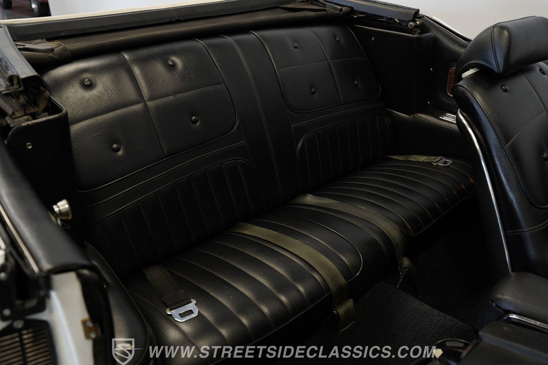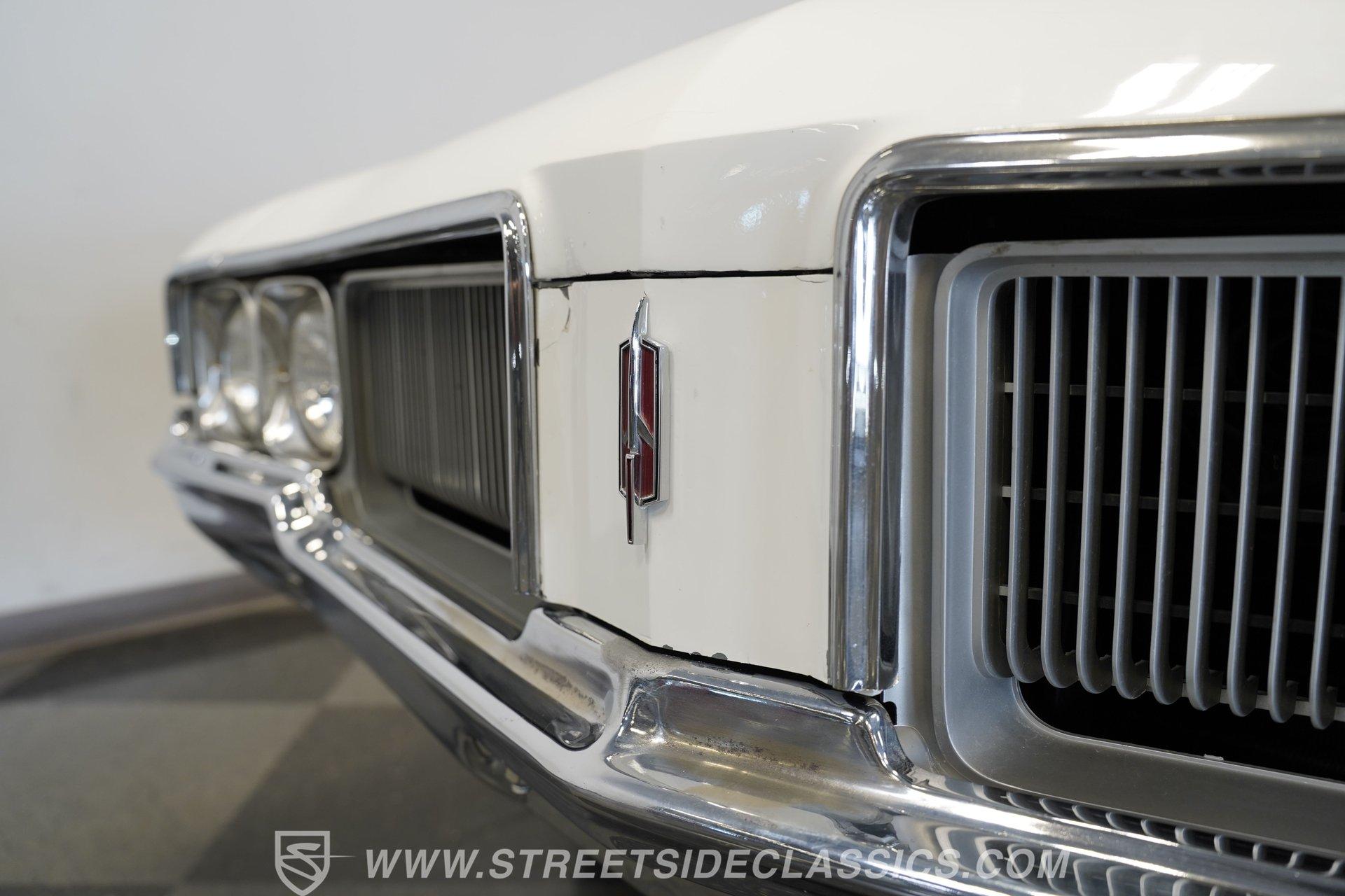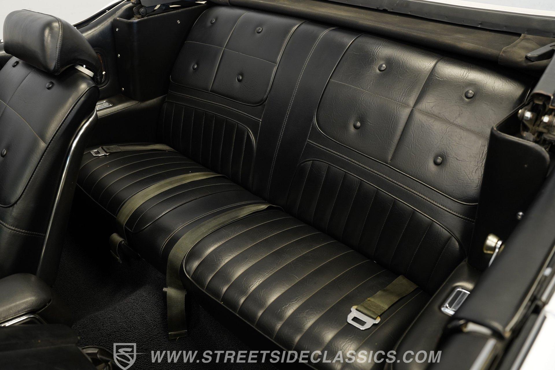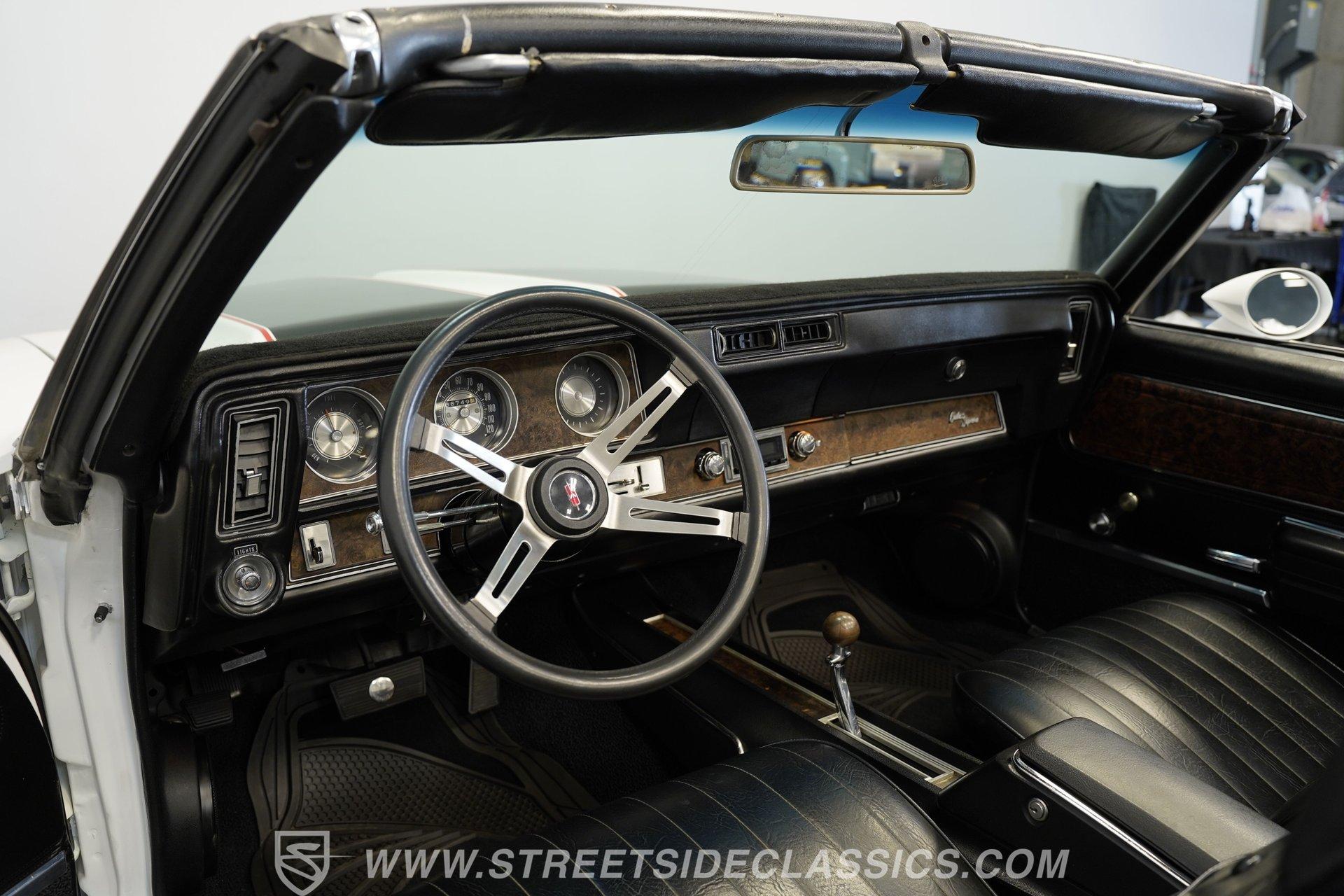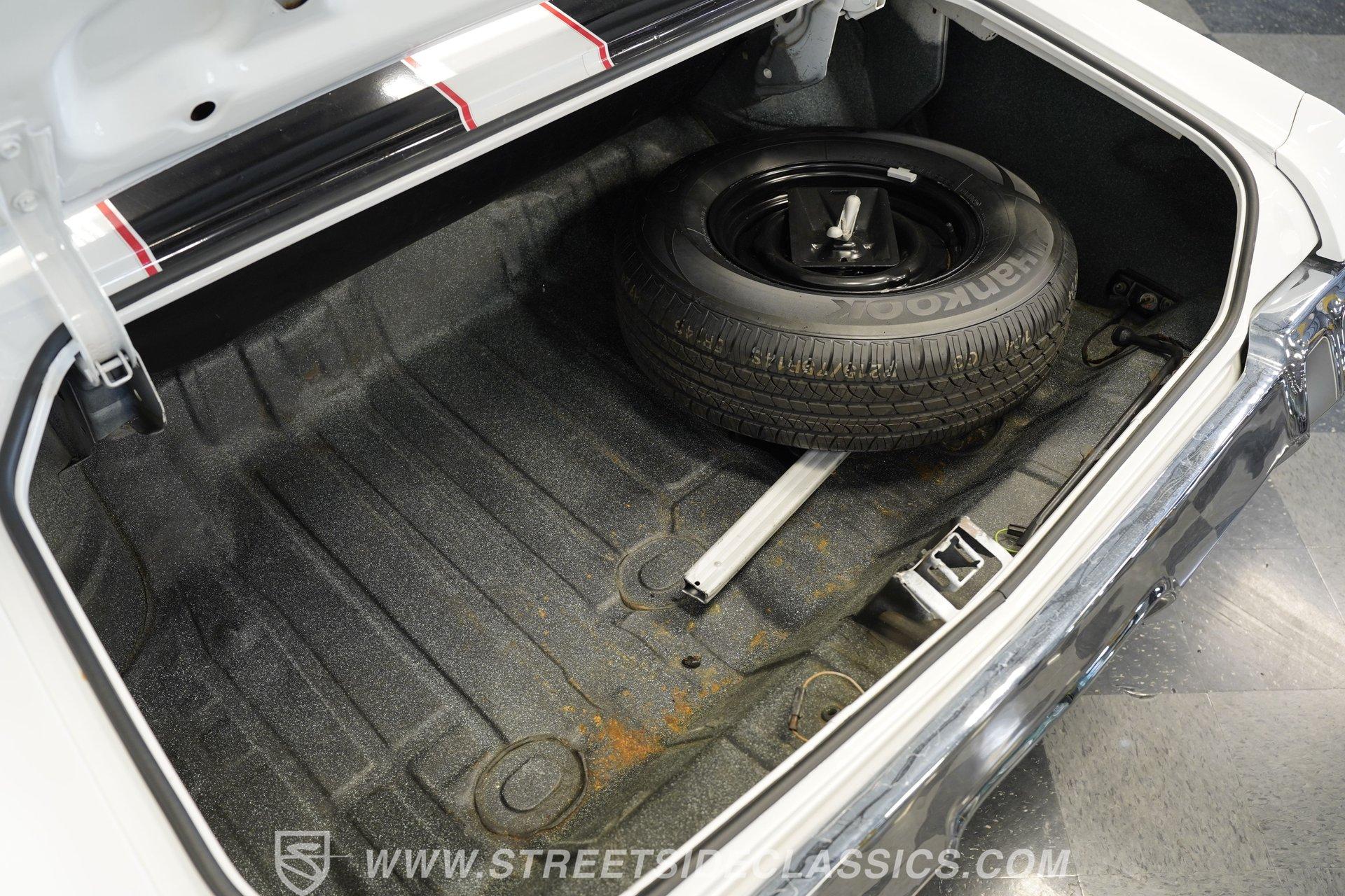 Finished in Porcelain White with a white convertible top, this Pace Car features black racing stripes on the hood and across the deck lid, outlined with red pin stripping. Matching colored side stripes run down the side of the car, and the Oldsmobile Official Pace Car decals are hard to miss. The chrome bumpers present well, and the Ram Air hood, deck lid, fenders, doors, and quarter panels all appear straight and clean. Factory-style white Oldsmobile wheels complete the period-correct look and give the car the proper stance.