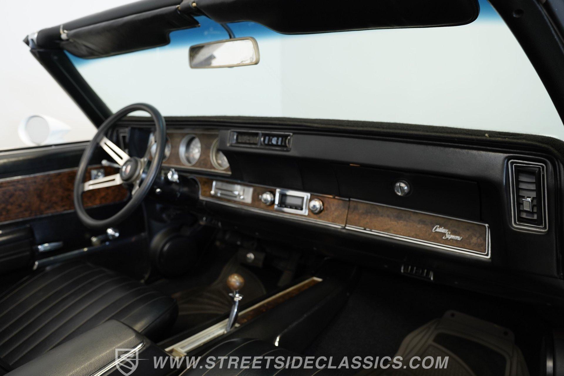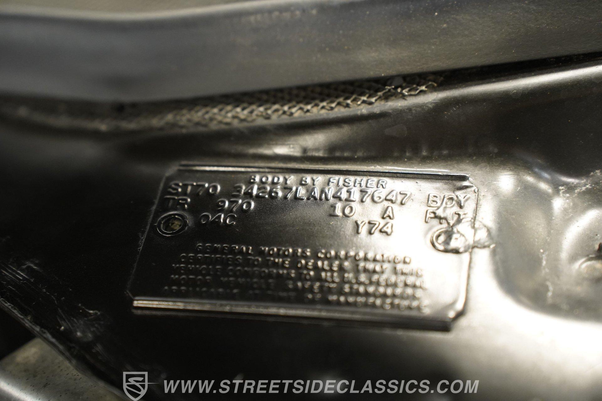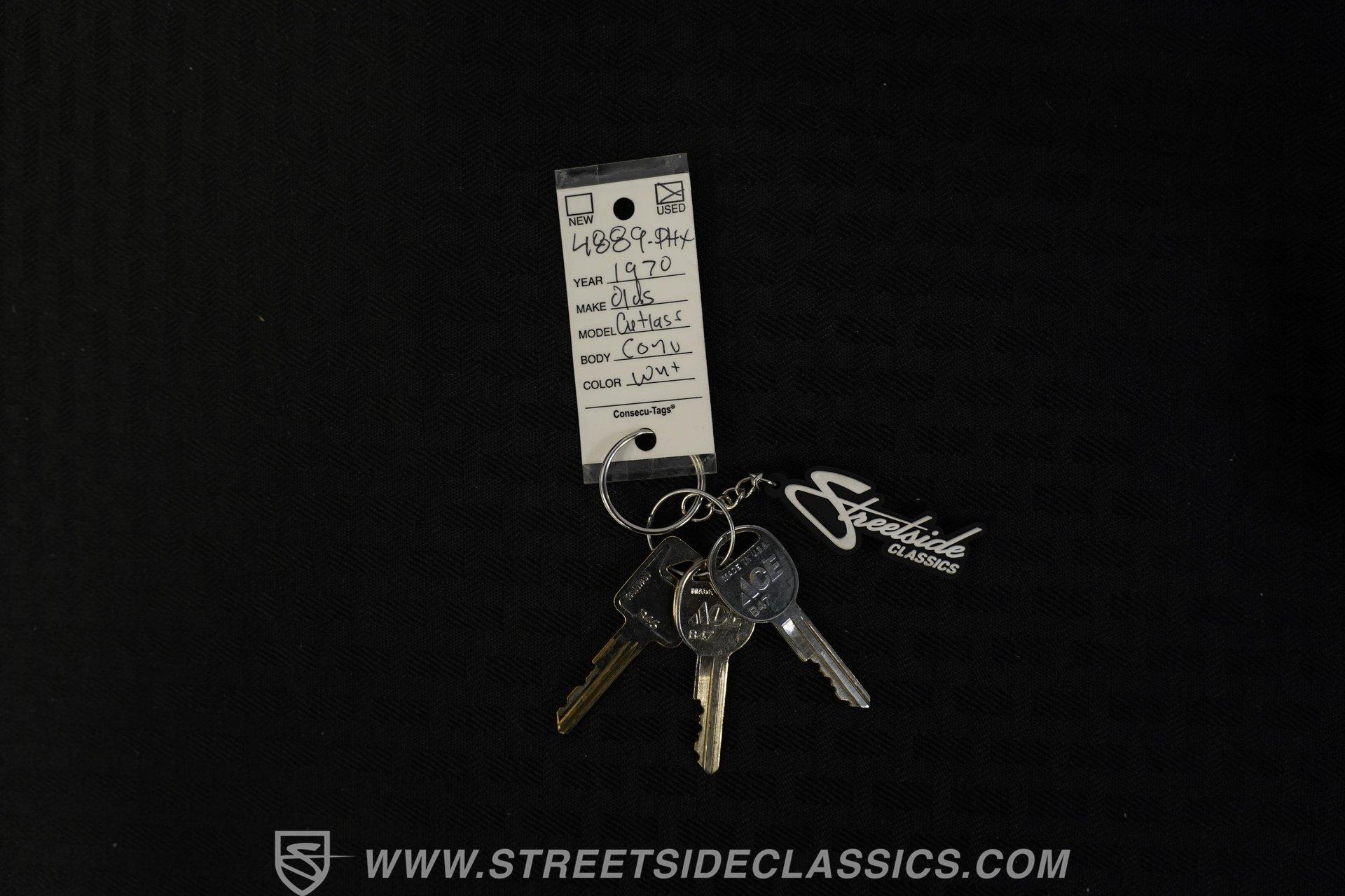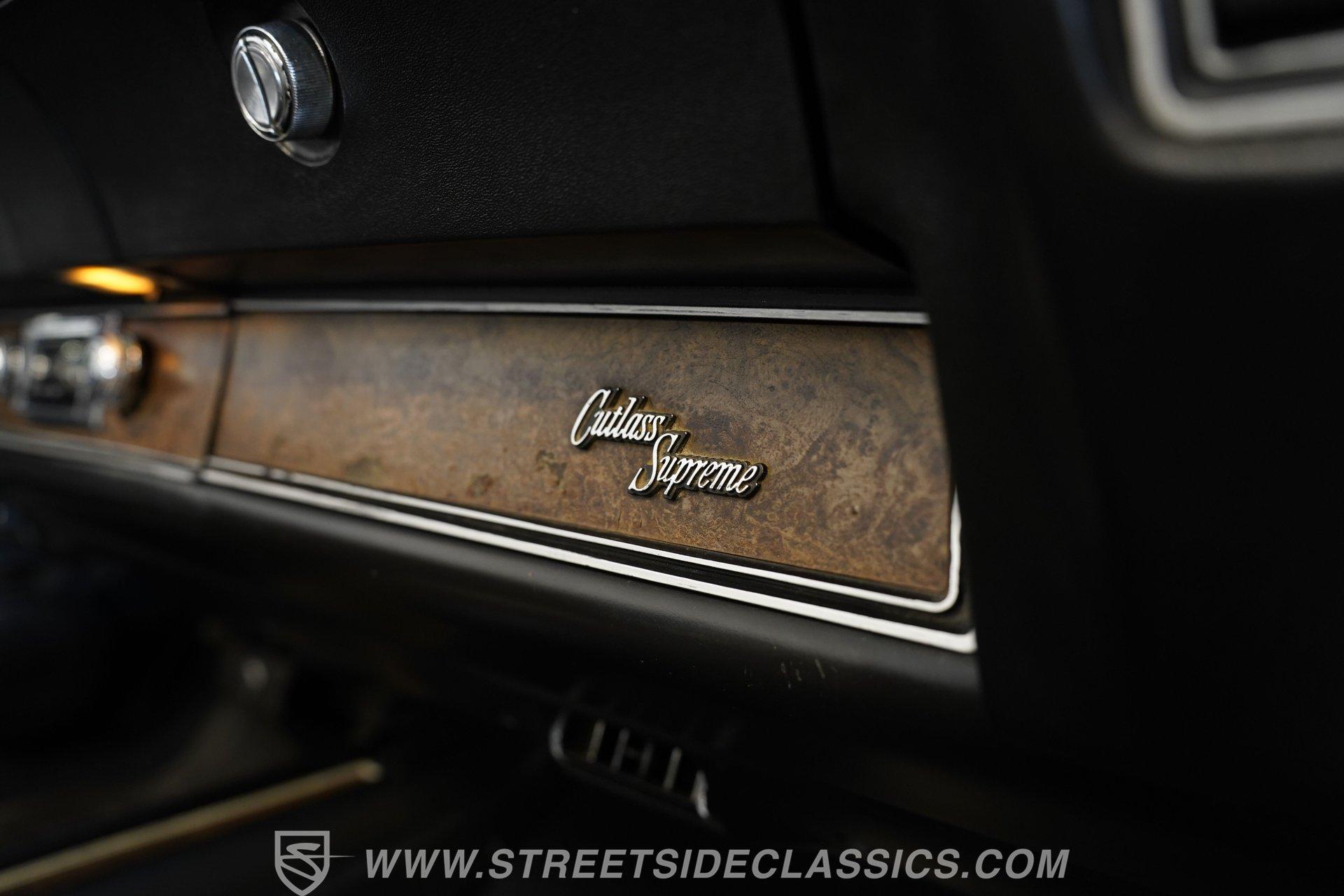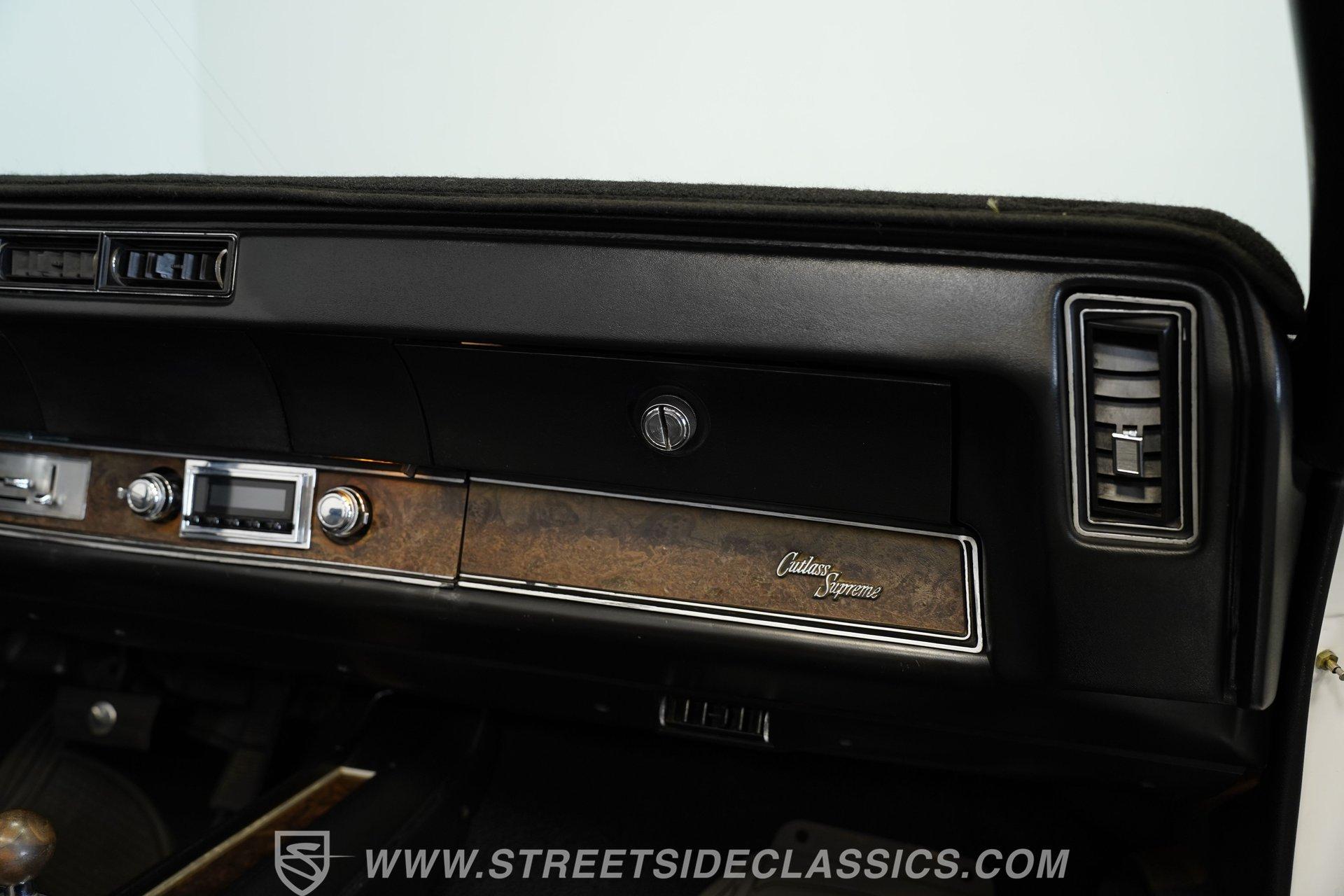Under the hood sits the numbers-matching 350 cubic-inch V8, finished in the correct Oldsmobile engine color. Power is sent through a TH350 3-speed automatic transmission to a 12-bolt rear axle. The underside remains clean with factory-style front and rear suspension. White-painted 14-inch rally wheels wear BF Goodrich Radial TA 245/60R14 tires at all four corners. Stopping power comes from front power disc brakes and rear power drum brakes, while dual exhaust with aftermarket mufflers provides a healthy V8 tone.