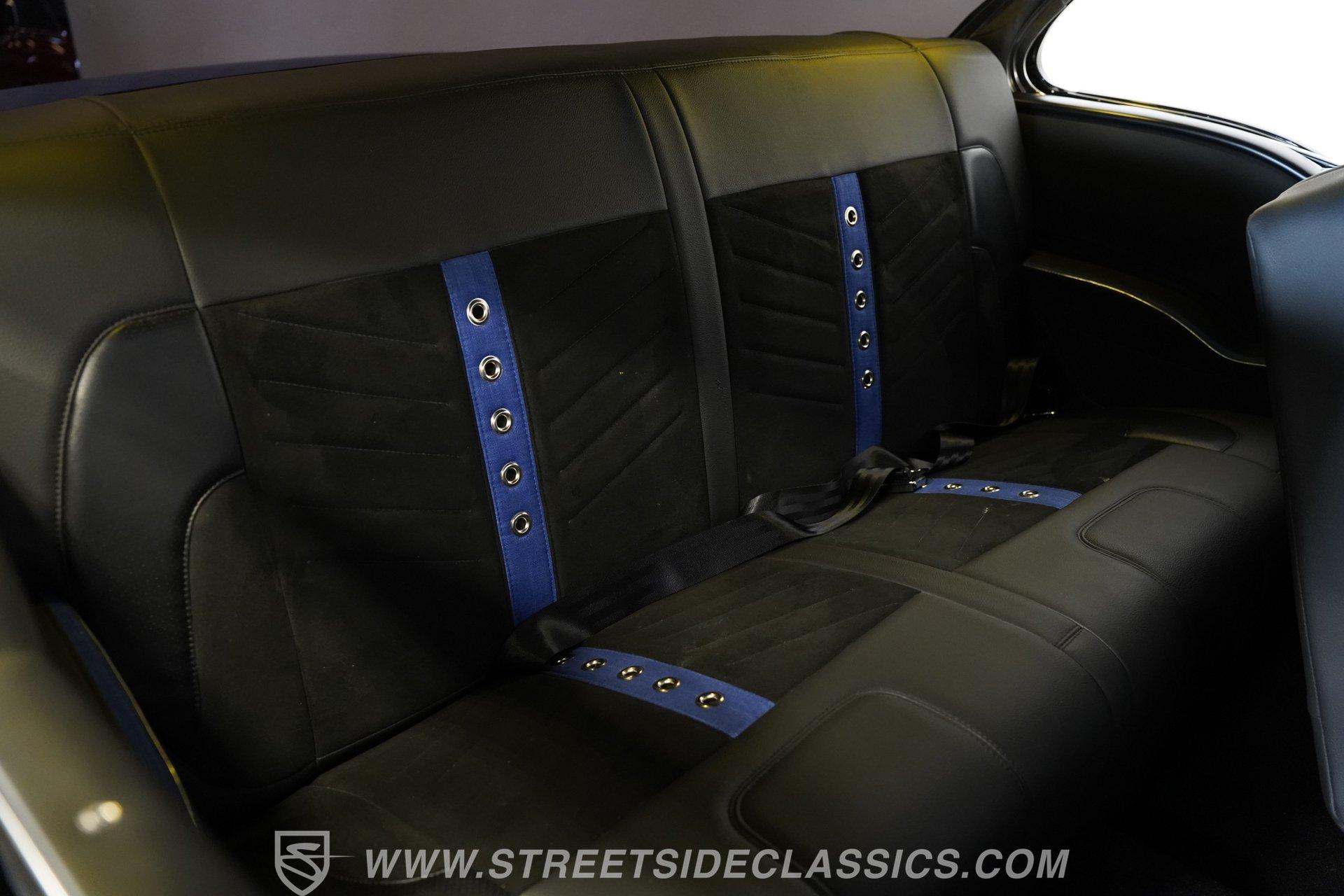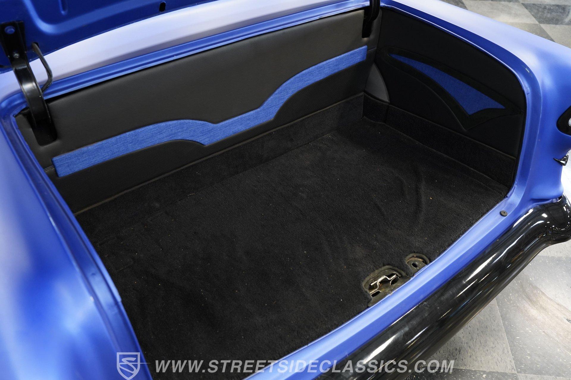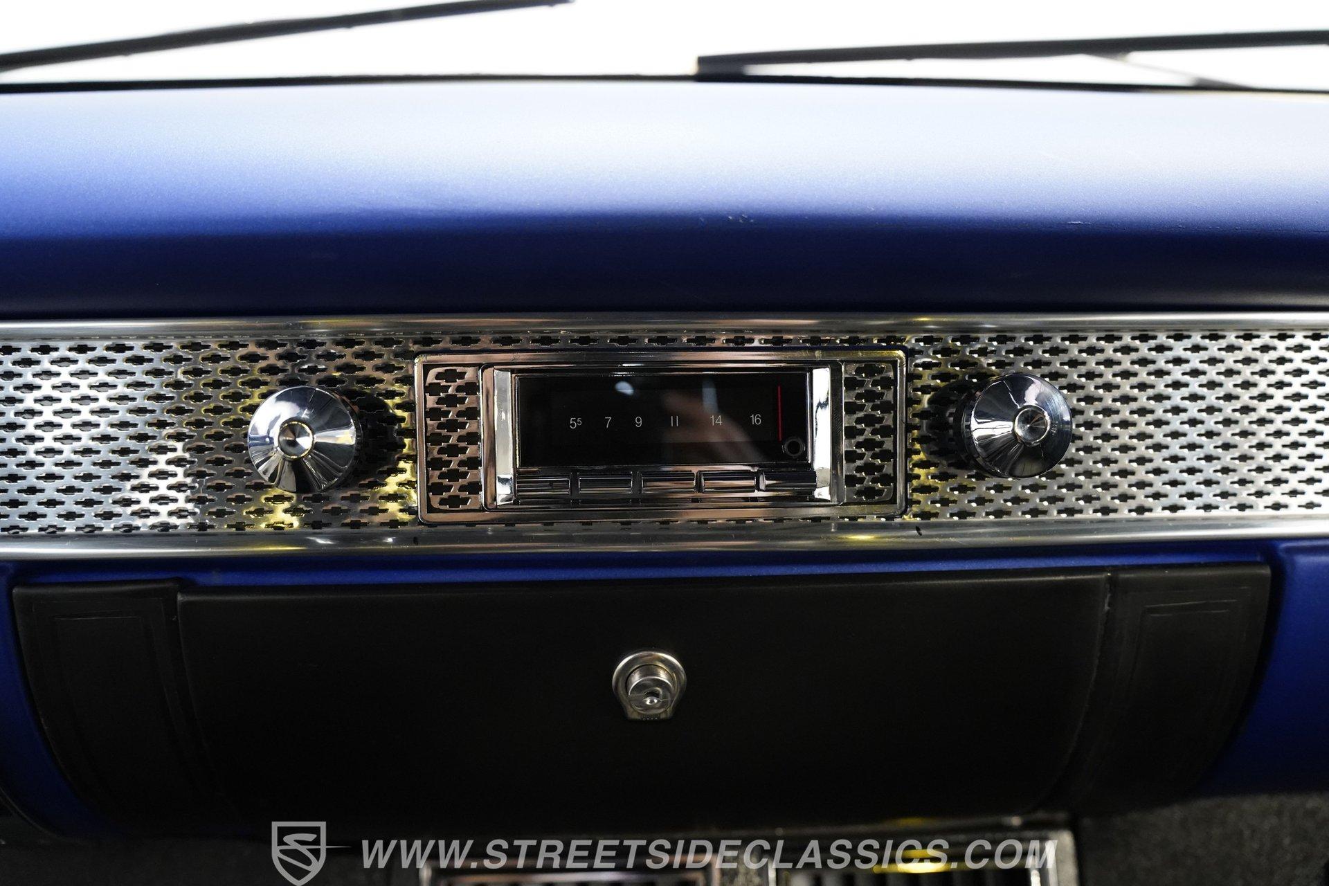 You'll no doubt be impressed by the custom interior that awaits you beyond the doors. The black upholstery blends leather and suede and features blue accenting on both the front buckets and rear bench seat that are color-matched to the exterior. Just in front of the aftermarket steering wheel perched on its chrome tilting column, the dash area is another high point, with Dakota Digital, analogue-style gauges in the instrument cluster, surrounded by clean unmarred surfaces everywhere you look. A retro-looking AM/FM/CD stereo with Bluetooth connectivity blends perfectly with the ornamental chrome strip spanning the length of the cabin and the added climate control system blows strong and cold for optimum comfort.