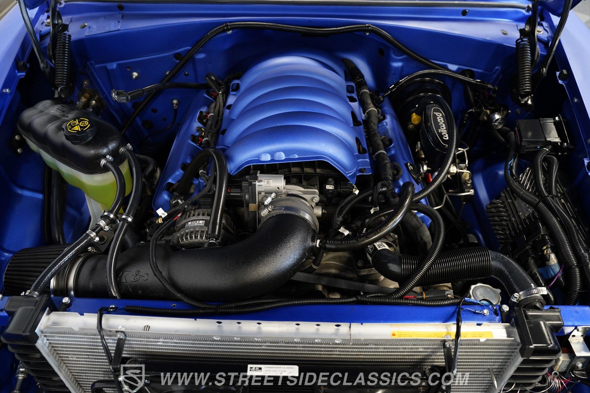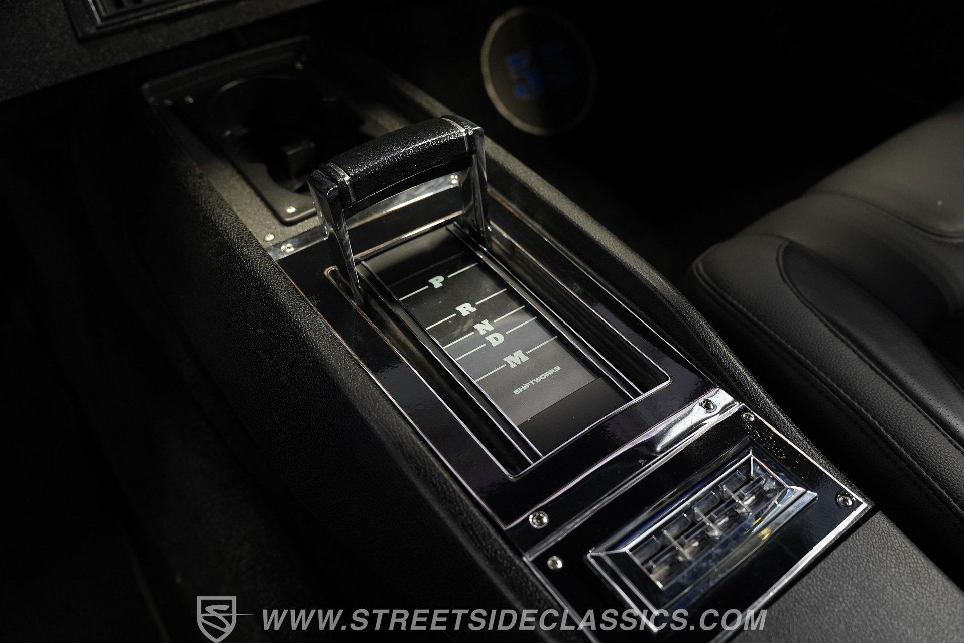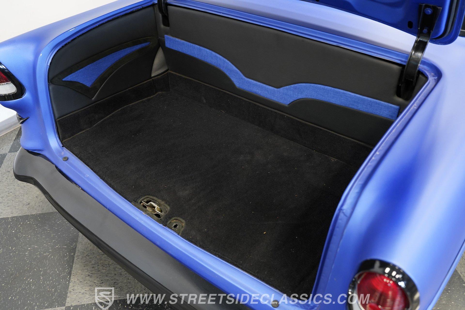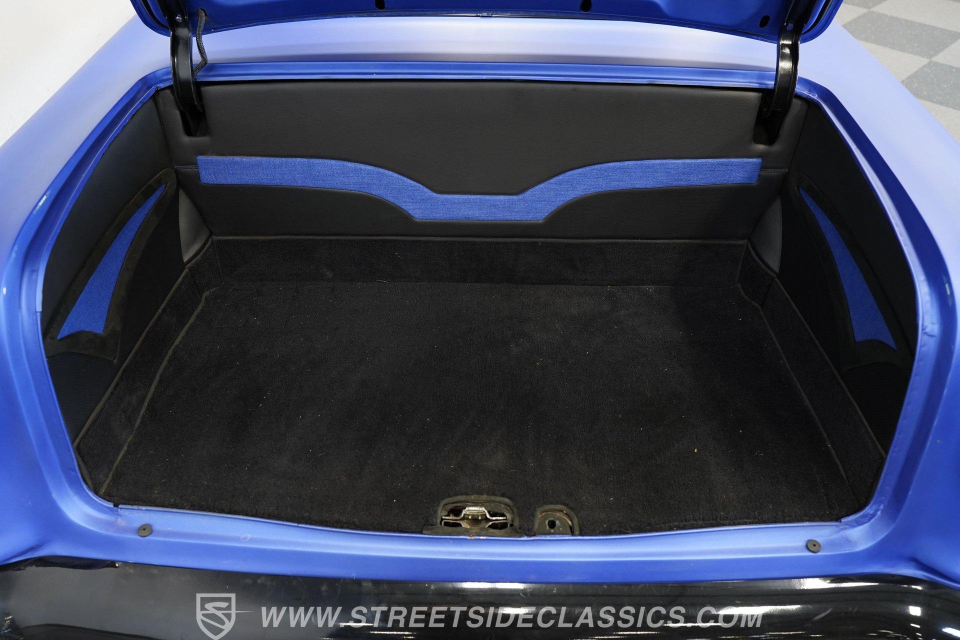 You'll no doubt be impressed by the custom interior that awaits you beyond the doors. The black upholstery blends leather and suede and features blue accenting on both the front buckets and rear bench seat that are color-matched to the exterior. Just in front of the aftermarket steering wheel perched on its chrome tilting column, the dash area is another high point, with Dakota Digital, analogue-style gauges in the instrument cluster, surrounded by clean unmarred surfaces everywhere you look. A retro-looking AM/FM/CD stereo with Bluetooth connectivity blends perfectly with the ornamental chrome strip spanning the length of the cabin and the added climate control system blows strong and cold for optimum comfort.