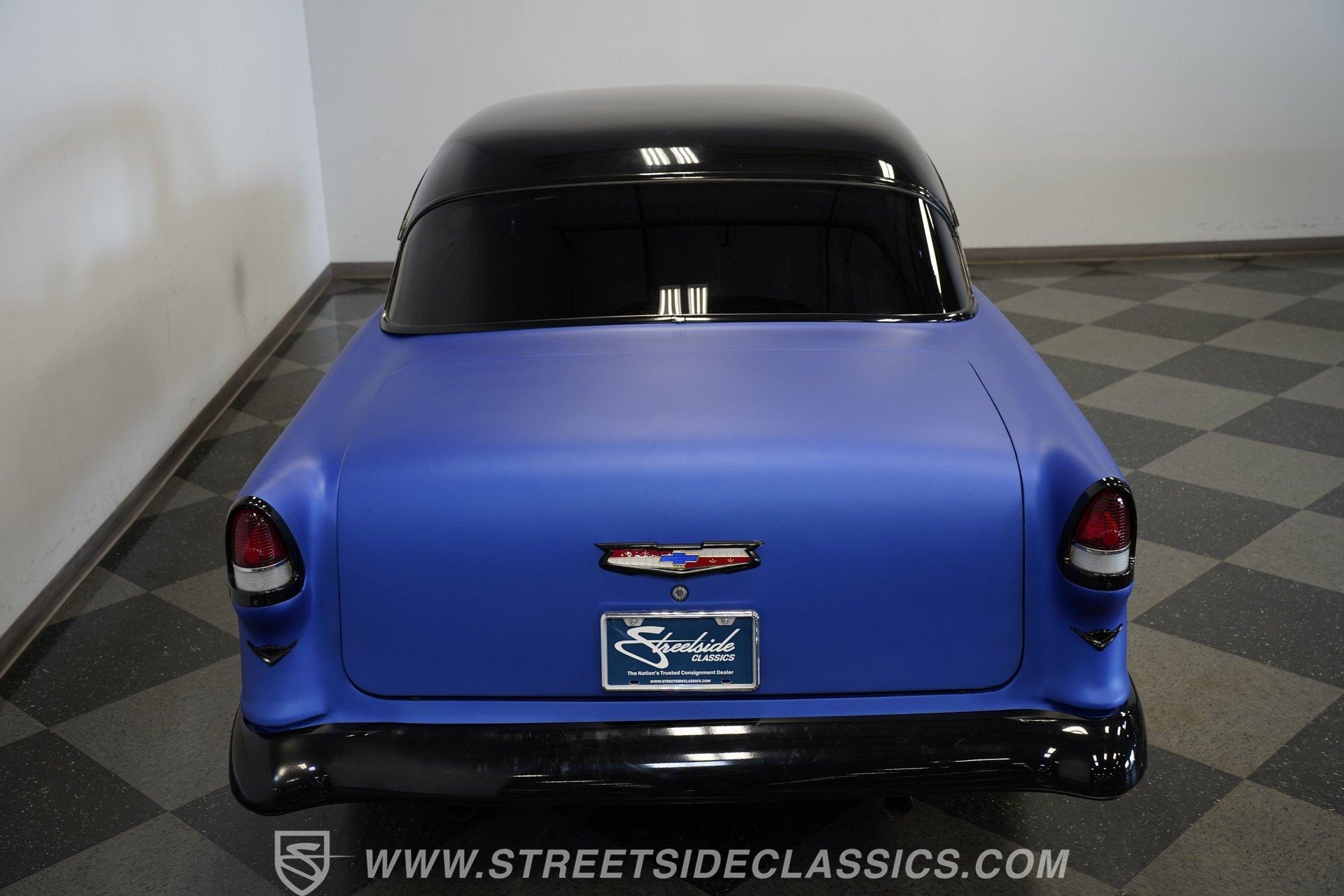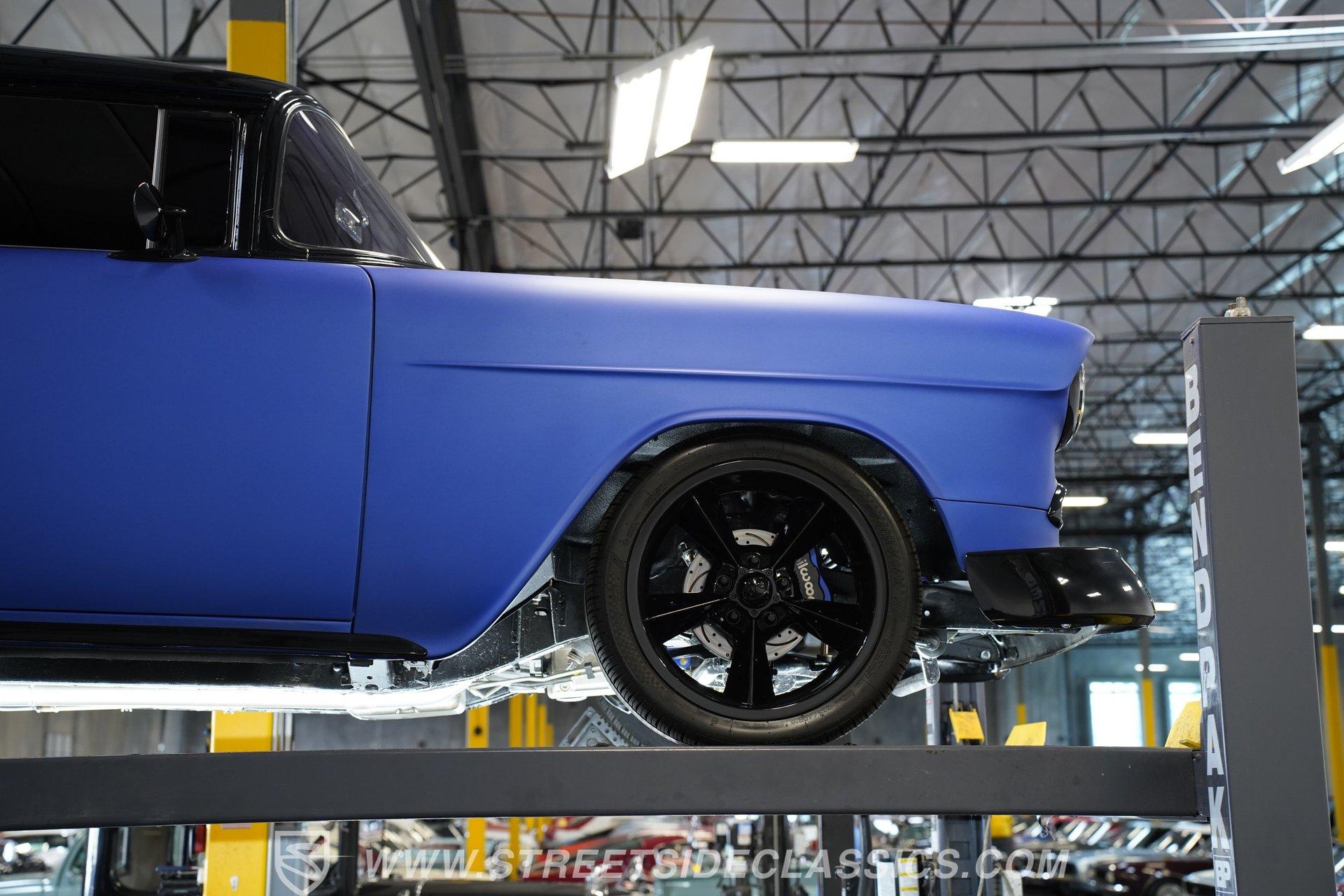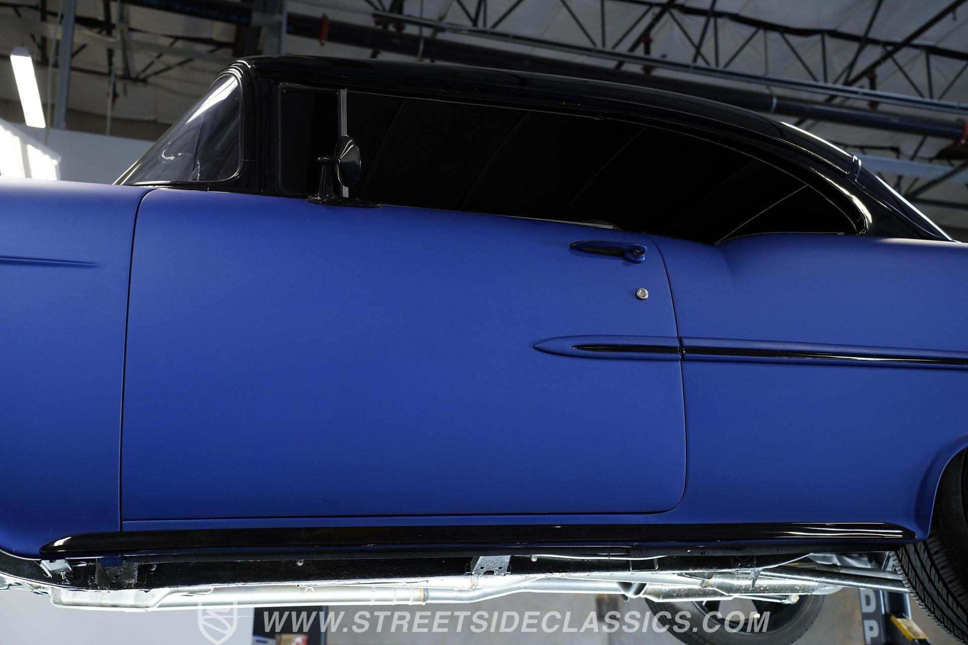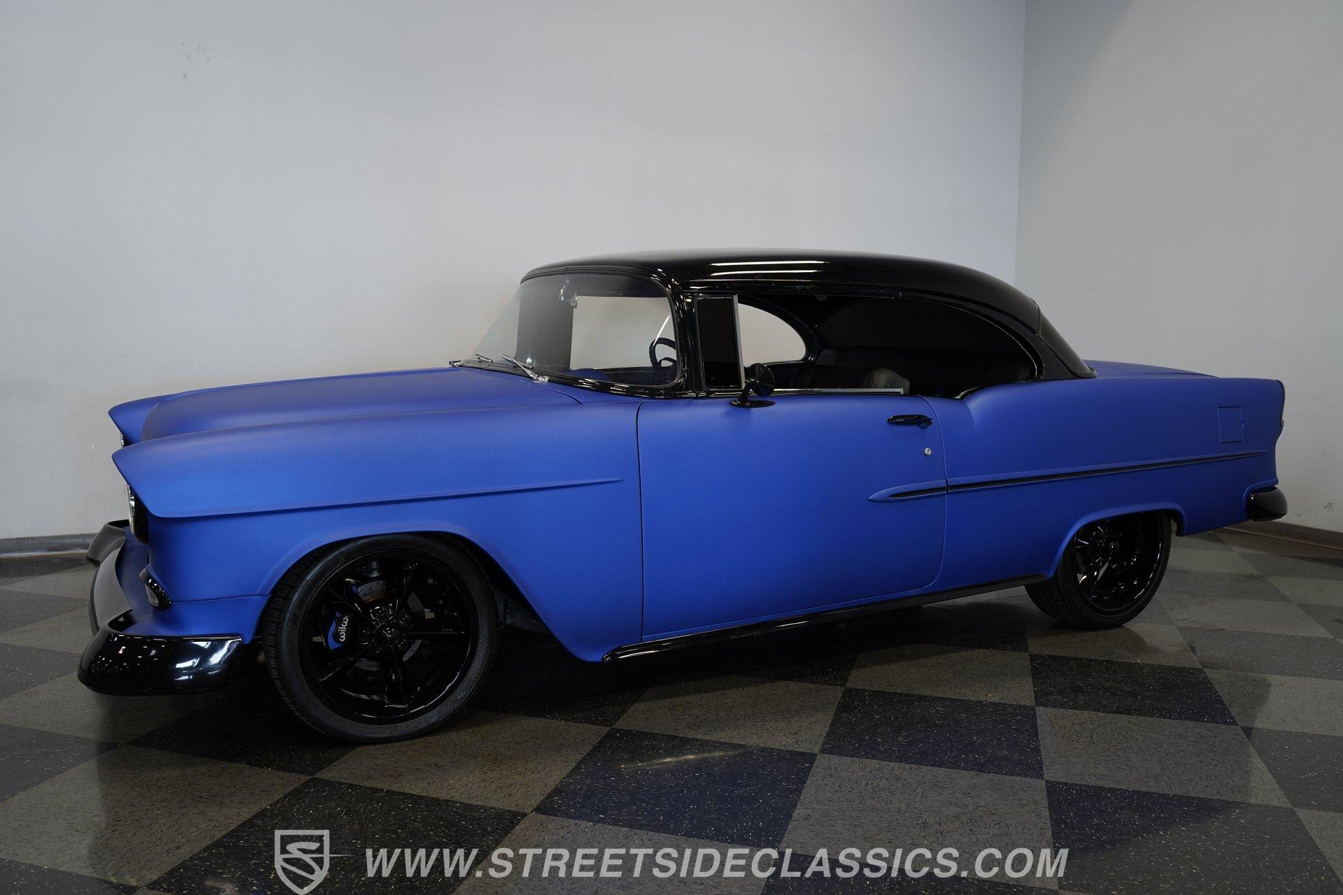 With their timeless looks and storied history, the Bel Airs of the mid-'50s have long been used as the foundation for countless aftermarket projects, but it's likely that very few, if any, have emerged from their restoration with the singular appearance of this 1955 Chevrolet Bel Air Restomod. Clad in Electron Blue Pearl paint that nearly radiates in the sun and is accompanied by blacked out chrome and cruising on an aggressive, lowered stance accentuated by a set of staggered jet-black wheels, this classic is an absolute standout. And along with its attention-grabbing curb appeal, this Chevy is equipped with a modern drivetrain, as well as several key mechanical upgrades, so it offers an outstanding experience behind the wheel.