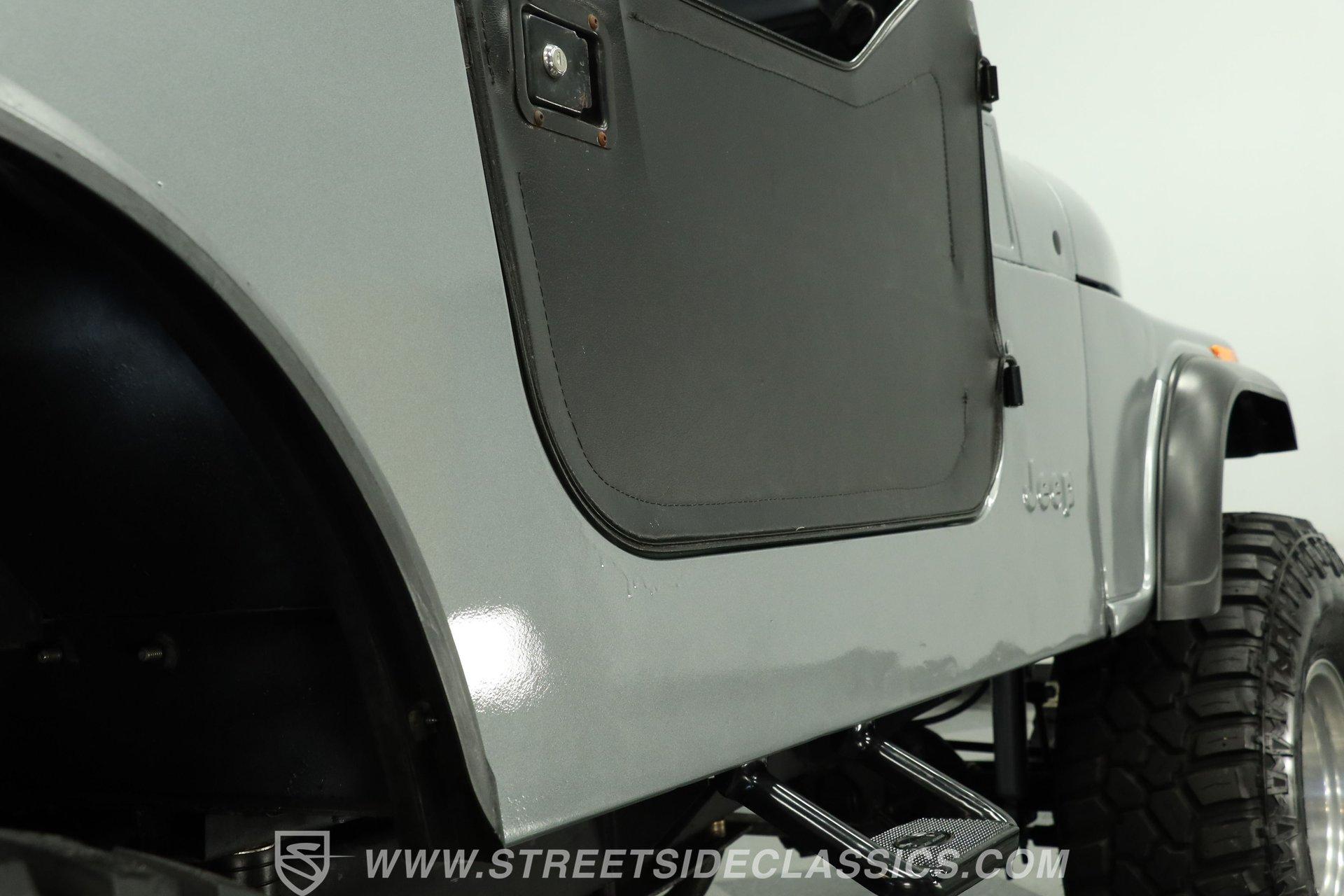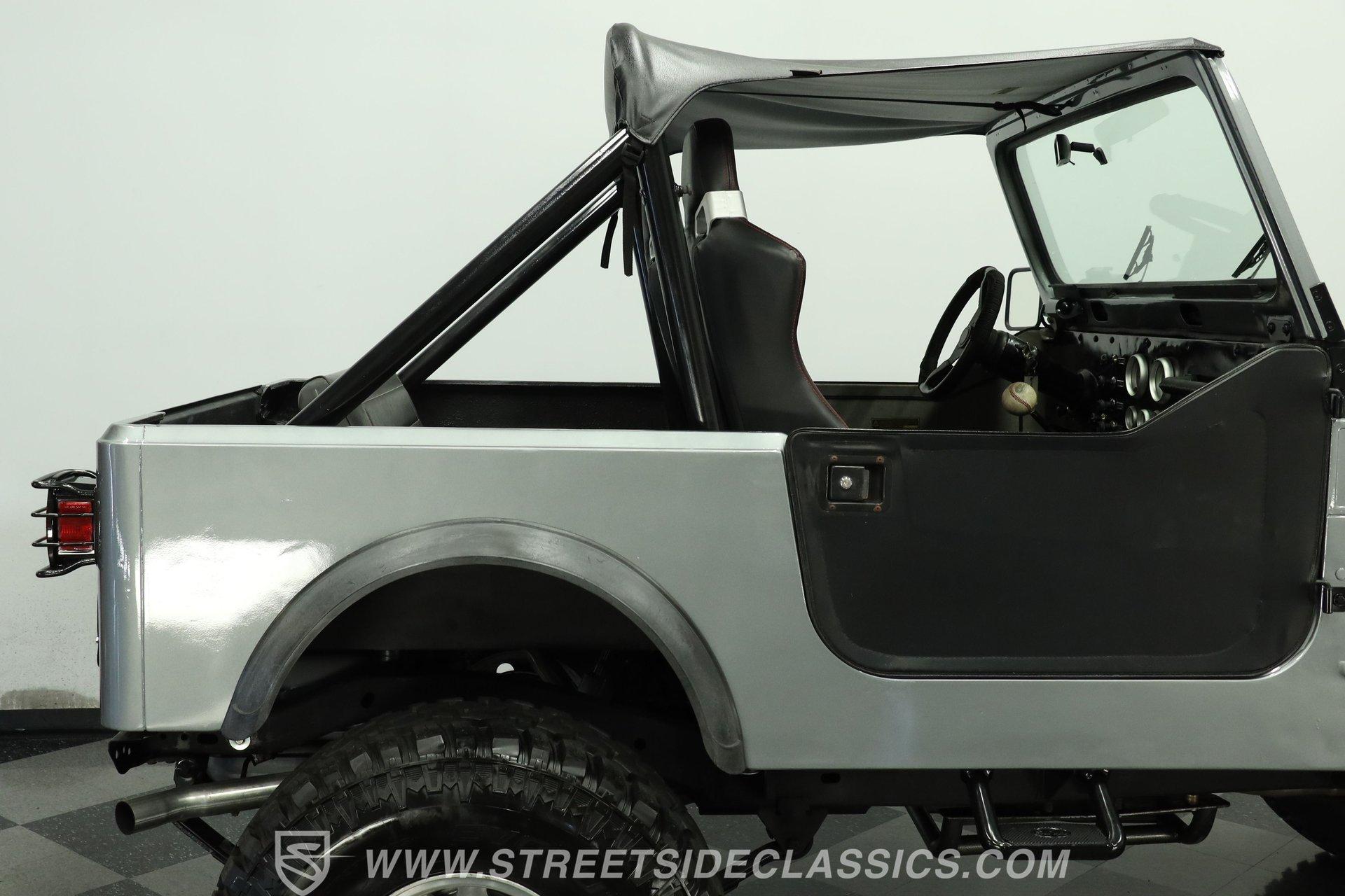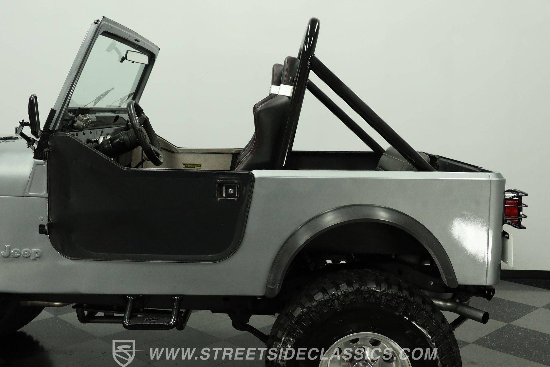 Silver, black, and ready for fun, this 1983 Jeep CJ7 V8 is built for whatever the road or trail throws its way. With a proper 4x4 setup and plenty of ground clearance, this CJ7 is ready to crawl over just about anything. Pair that capability with a high-performance V8, and you've got the recipe for adventure... or a little trouble... or maybe both. The exterior has the rugged look a CJ should have. Both the front and rear bumpers are solid, while the headlights, taillights, grille, and tailgate all present well. A soft bikini top and soft removable doors keep the Jeep true to its open-air roots, while an aftermarket Bully side step makes climbing in and out a bit easier.