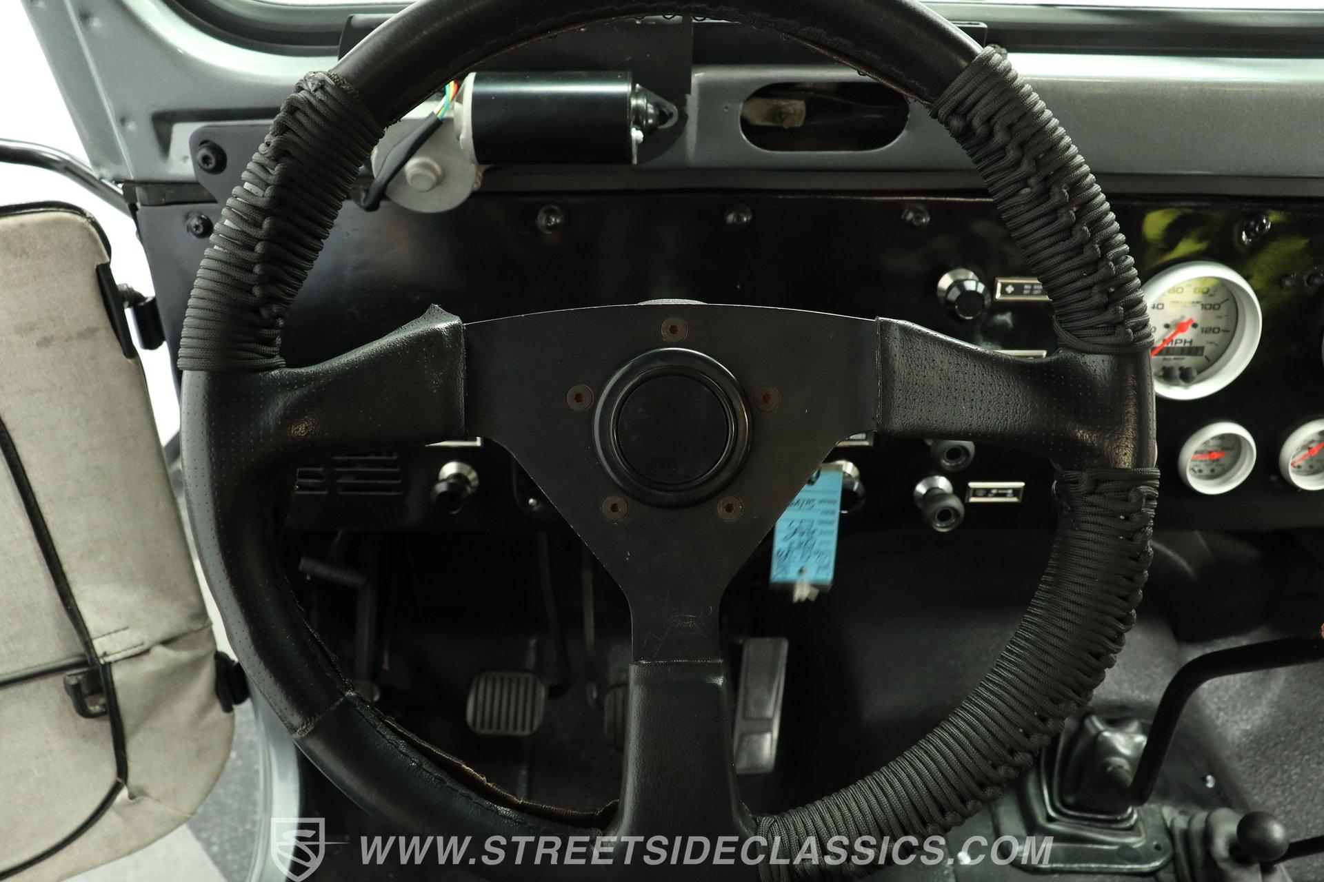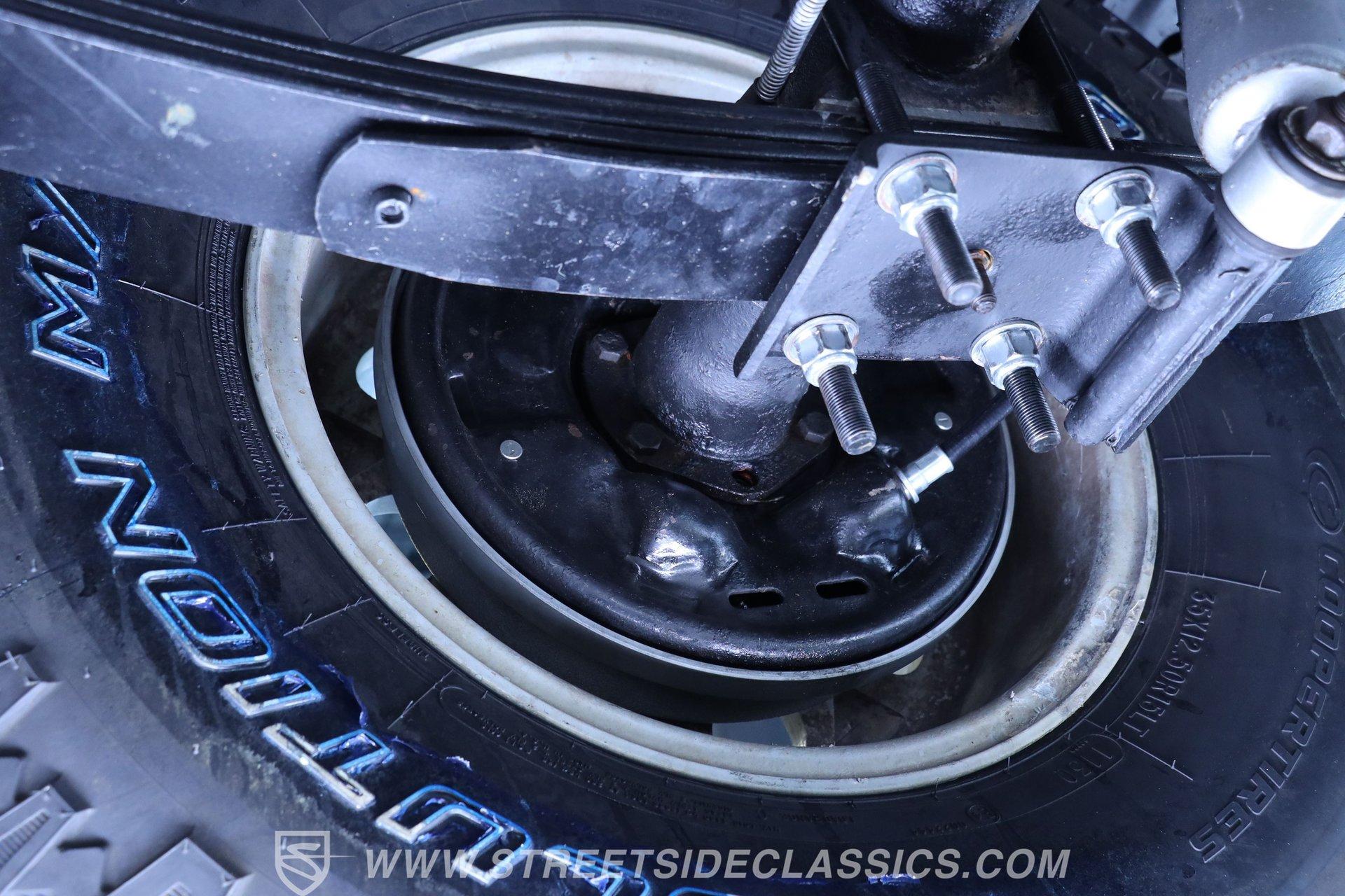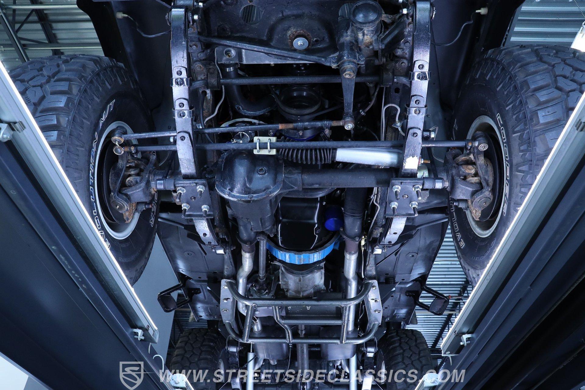 Under the hood is where this CJ7 really comes alive. Power comes from a stout 350 cubic-inch BluePrint V8 crate engine equipped with aluminum cylinder heads, a hydraulic roller camshaft, and a Holley Brawler 4-barrel carburetor. That power is sent through a Borg Warner 4-speed manual transmission to the rear axle-or both axles when 4x4 is engaged. The lifted stock-style suspension with manual locking hubs gives this Jeep both the stance and capability it deserves. Rolling on 15-inch wheels wrapped in aggressive 35x12.50R15LT tires, it has the look and traction to match the power. Stopping duties come from front power disc brakes and rear power drum brakes, while wrapped long-tube headers, dual exhaust, and Flowmaster mufflers provide the unmistakable Jeep V8 soundtrack.