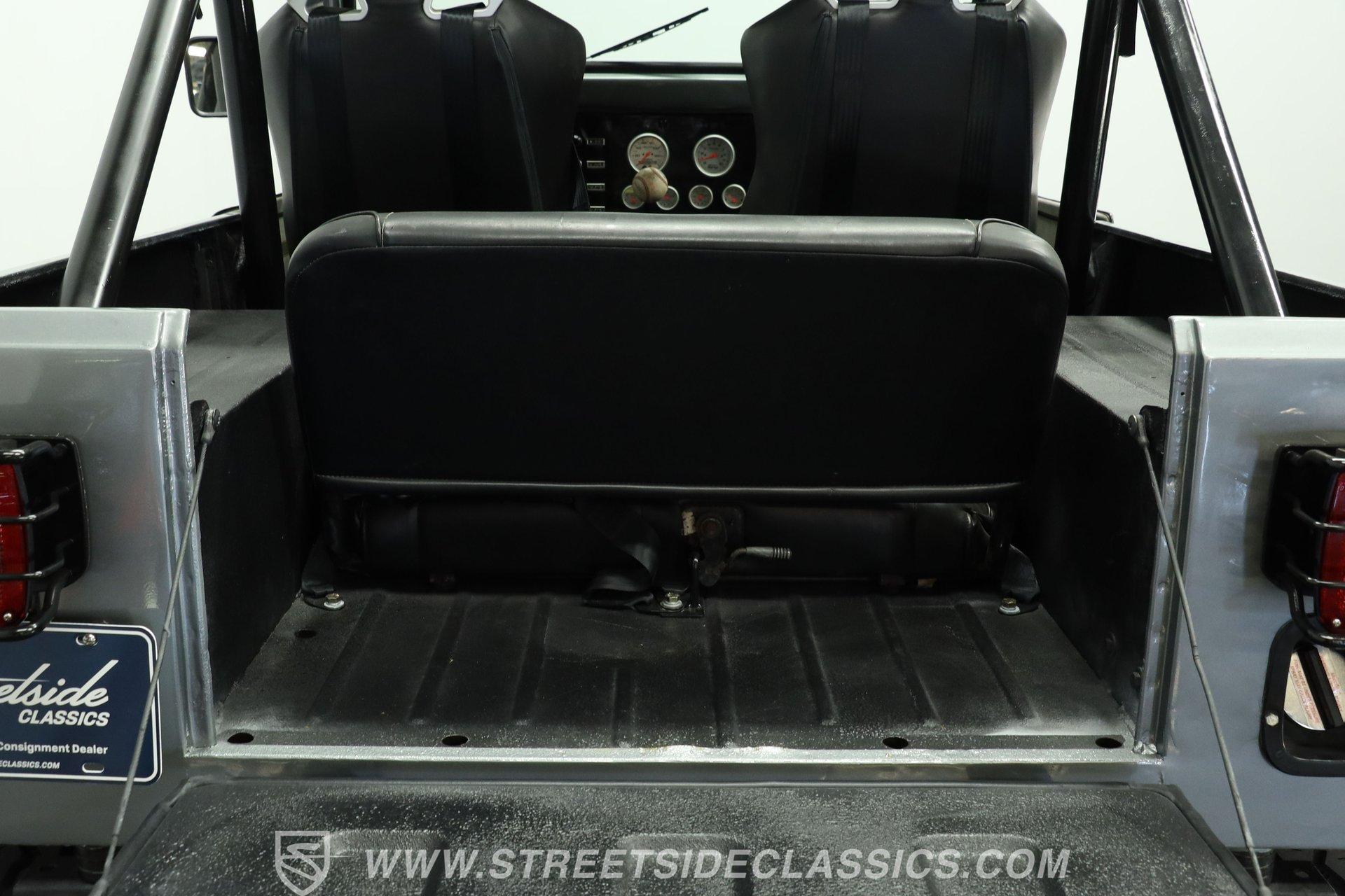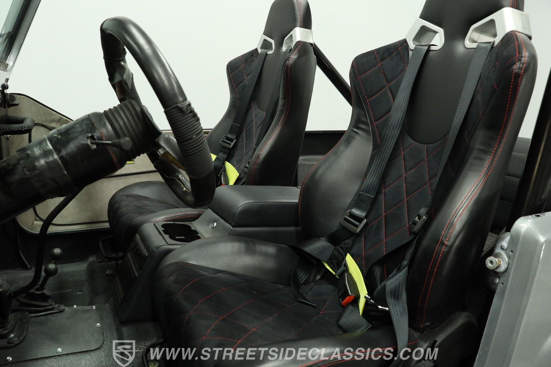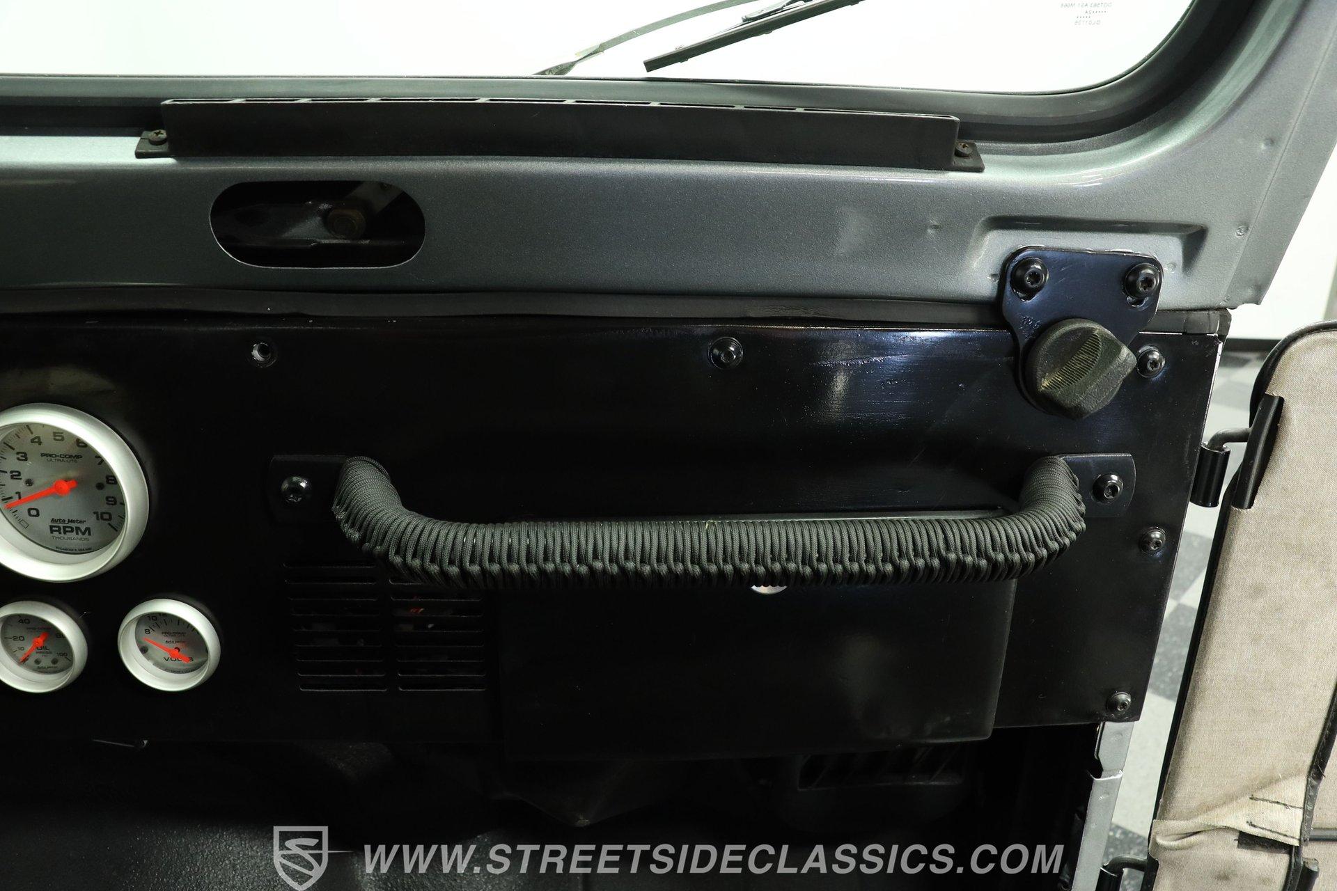 Inside, the cabin keeps things simple and functional-just the way a trail-ready Jeep should be. The floor is coated with a spray-in bedliner, making cleanup quick and easy after a muddy day off-road. Up front are vinyl and cloth racing-style bucket seats featuring a diamond-cut pattern with red stitching for a sporty touch. In the rear, the stock bench seat remains in place and in good condition. A center console with dual cupholders provides added convenience and storage. The floor-mounted shifter, topped with a baseball-style shift knob, falls easily to hand, and the 4x4 shifter levers are right next to it. An aftermarket steering wheel adds a performance feel, while a set of AutoMeter gauges mounted to the right keeps vital engine information clearly in view.