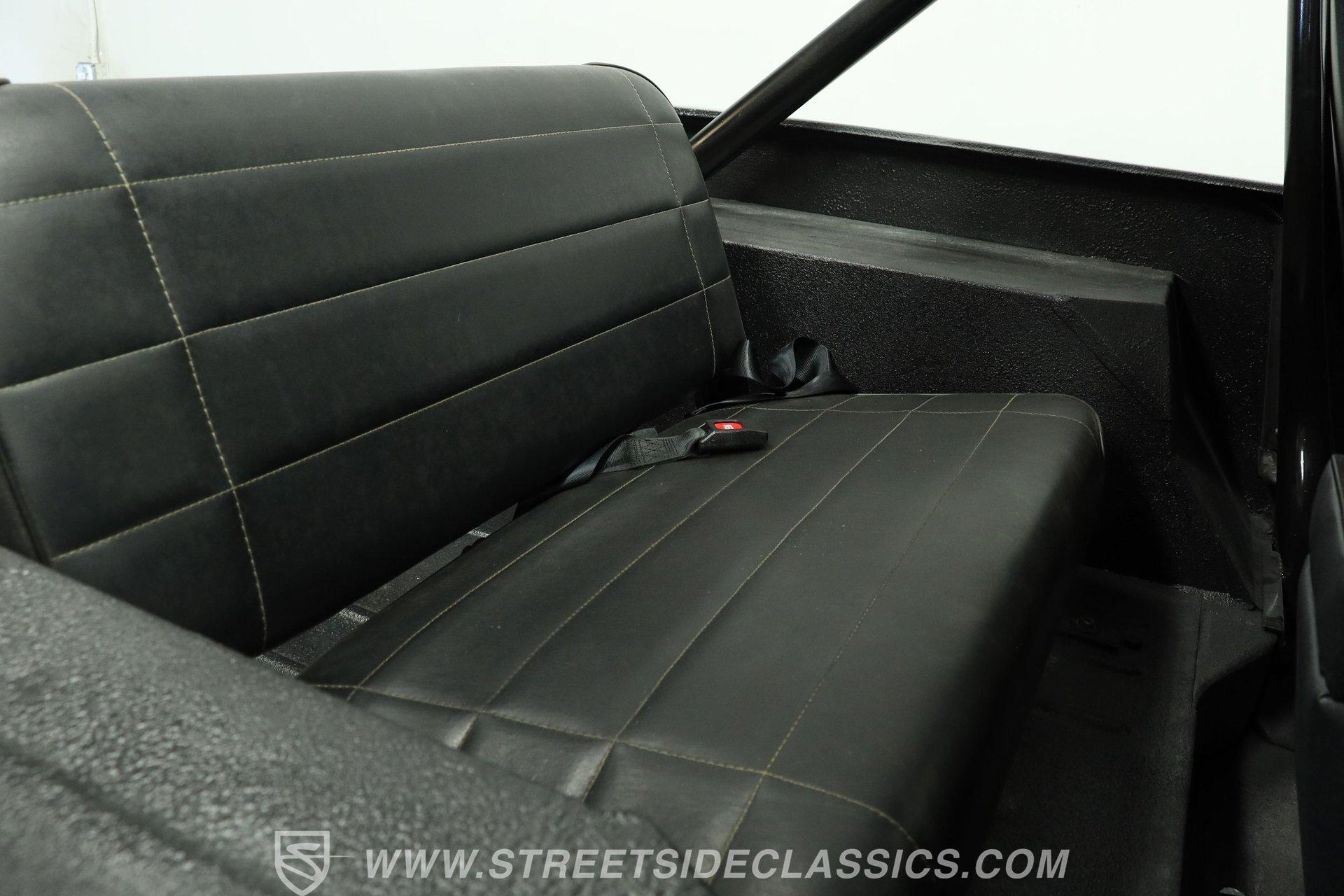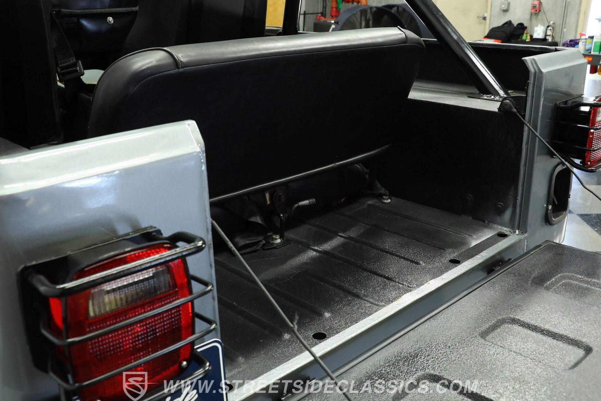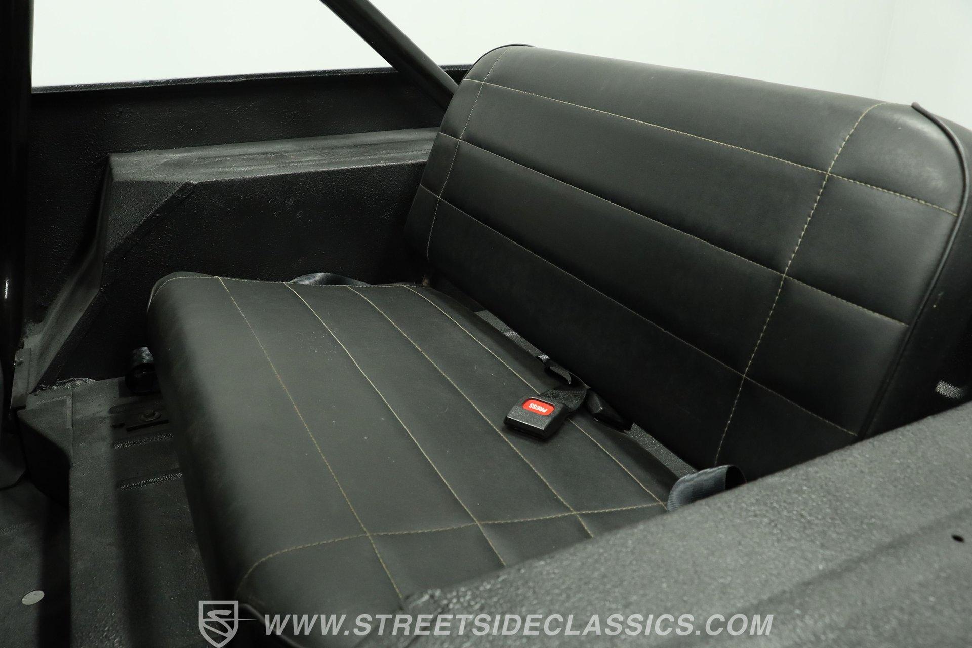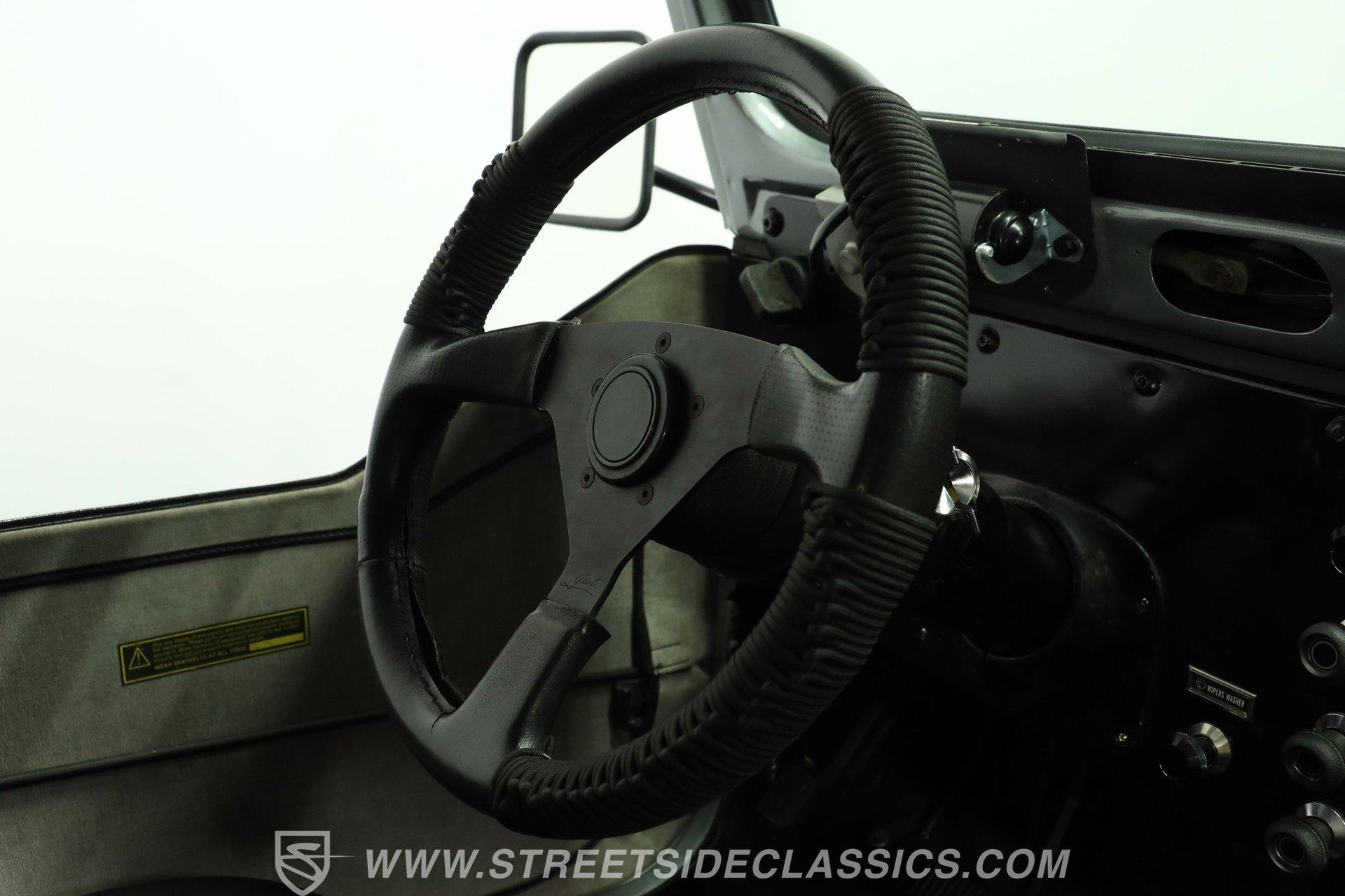 Inside, the cabin keeps things simple and functional-just the way a trail-ready Jeep should be. The floor is coated with a spray-in bedliner, making cleanup quick and easy after a muddy day off-road. Up front are vinyl and cloth racing-style bucket seats featuring a diamond-cut pattern with red stitching for a sporty touch. In the rear, the stock bench seat remains in place and in good condition. A center console with dual cupholders provides added convenience and storage. The floor-mounted shifter, topped with a baseball-style shift knob, falls easily to hand, and the 4x4 shifter levers are right next to it. An aftermarket steering wheel adds a performance feel, while a set of AutoMeter gauges mounted to the right keeps vital engine information clearly in view.