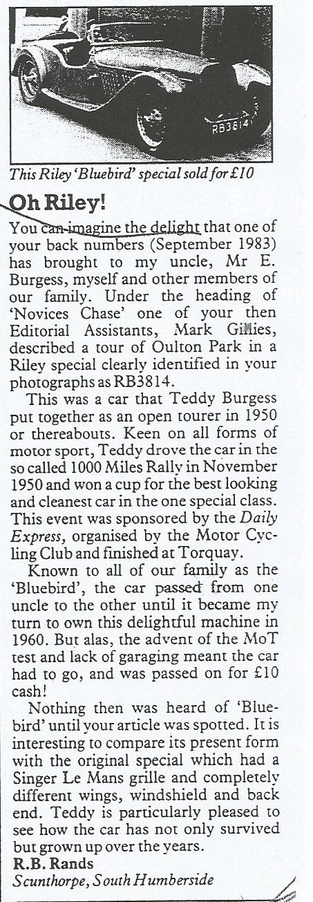 A Classic & Sportscar article from January 1986 recounts the memories of then-owner R. B. Rands, Teddy Burgess's nephew, who sold the car in 1960 for just £10 due to the introduction of the MOT test and the lack of a garage. At that time it still retained its Tourer configuration and was nicknamed “The Bluebird” within the family; the registration book confirms that its original colour was blue before the present green.