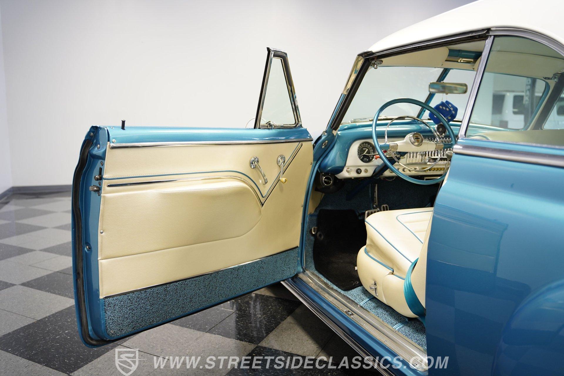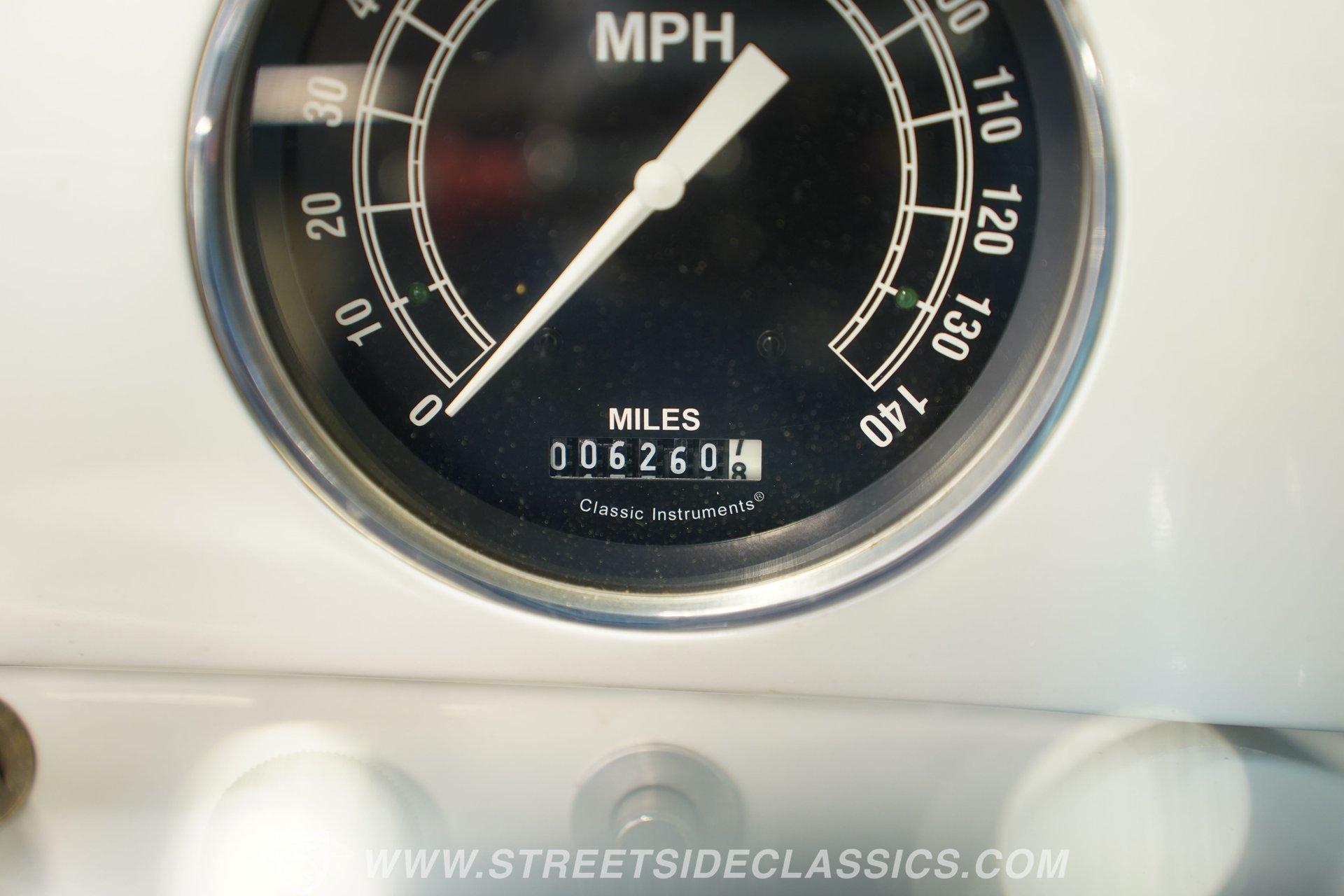 Inside, the interior looks fantastic. Cream and blue pinstriped seats and matching door panels create a sharp contrast that ties perfectly with the exterior color scheme. Matching blue paint carries across the dashboard, trim, steering wheel, and steering column for a cohesive appearance. The carpet and headliner are both in good condition. A set of Classic Instruments® gauges is clean, easy to read, and fits the custom theme nicely. Comfort upgrades include a Vintage Air system and a retro-style AM/FM radio. The floor shifter sits within easy reach, the rear seats look excellent, and the trunk also has a custom look to match the rest of the interior.